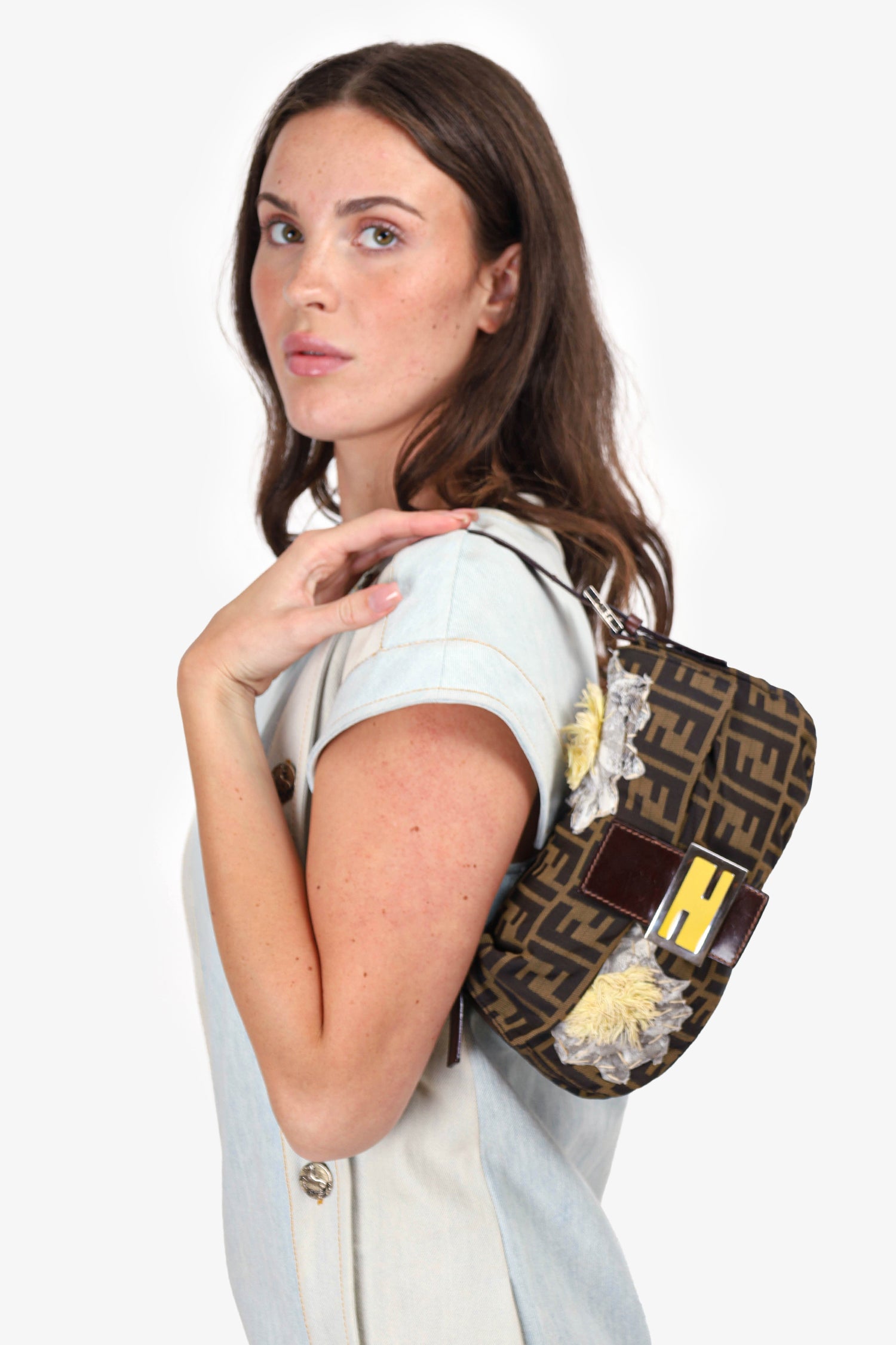 Refresh availabilityFendi Brown Embroidered Zucca Baguette Shoulder Bag. Front fold-over flap with magnetic button closure. Adjustable shoulder strap. Single interior wall pocket with zip closure. Tonal stitching. Silver-tone hardware.