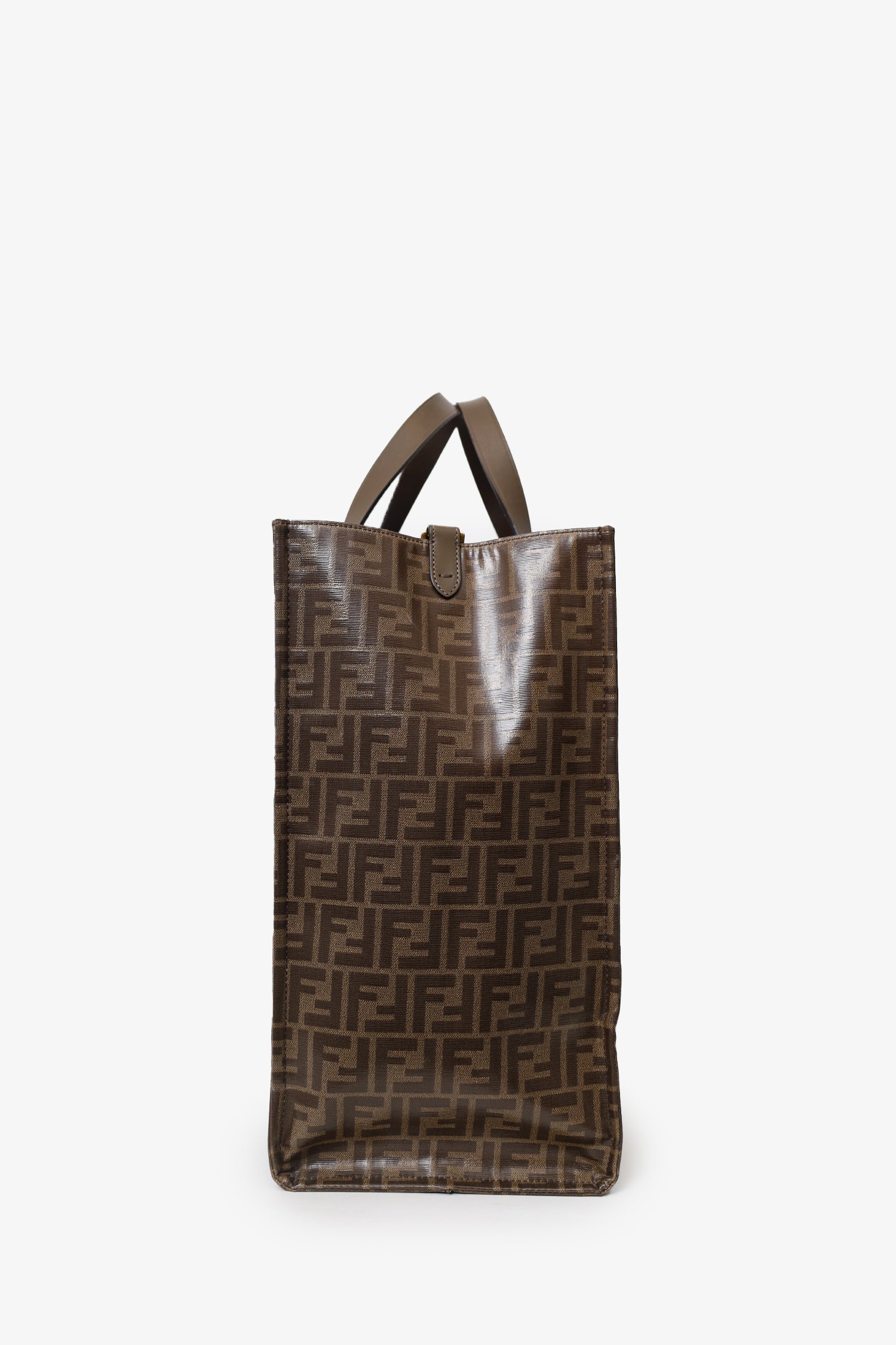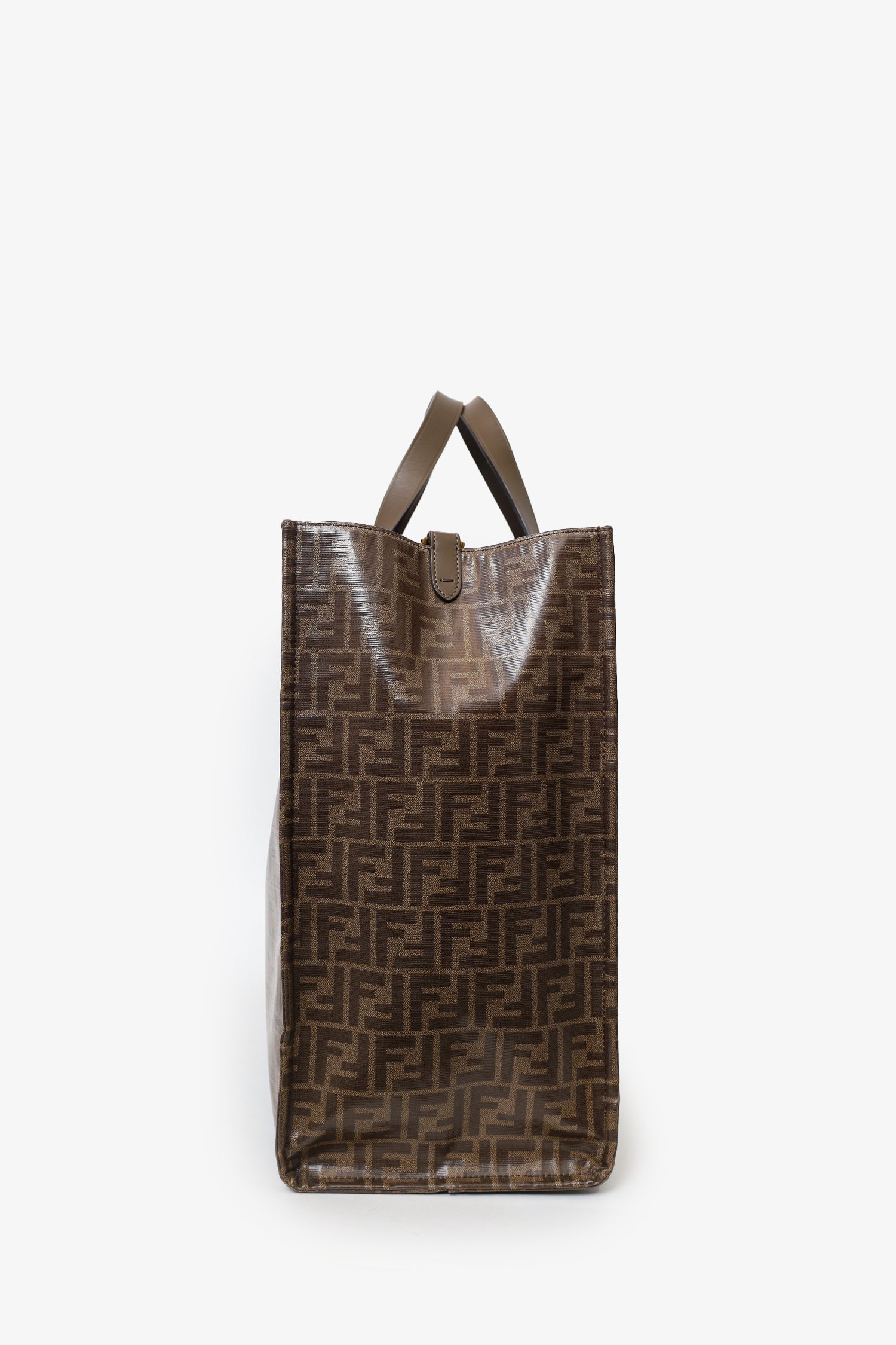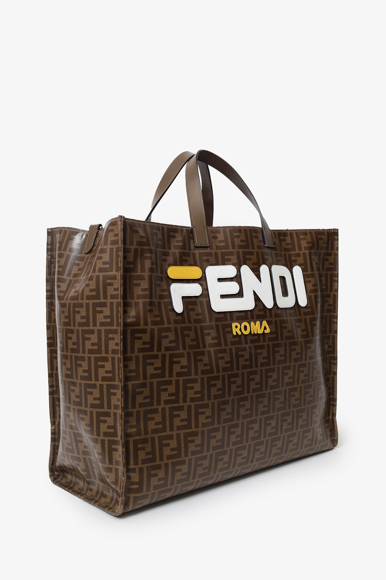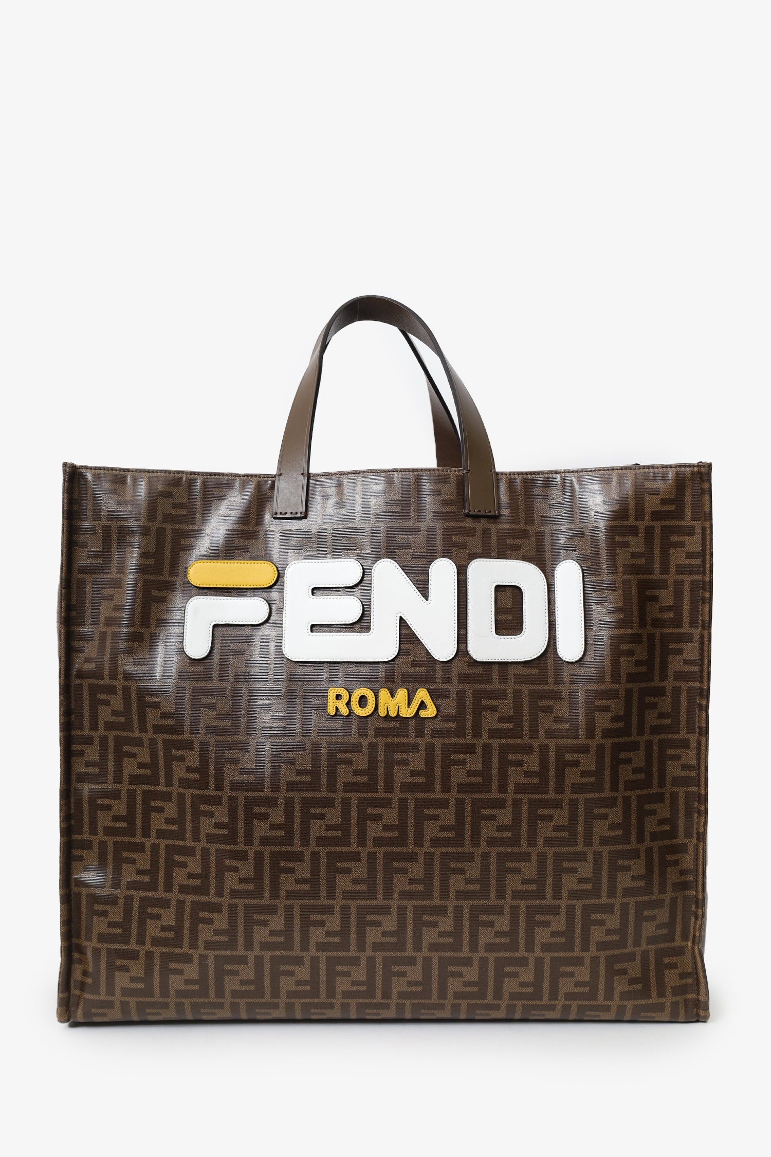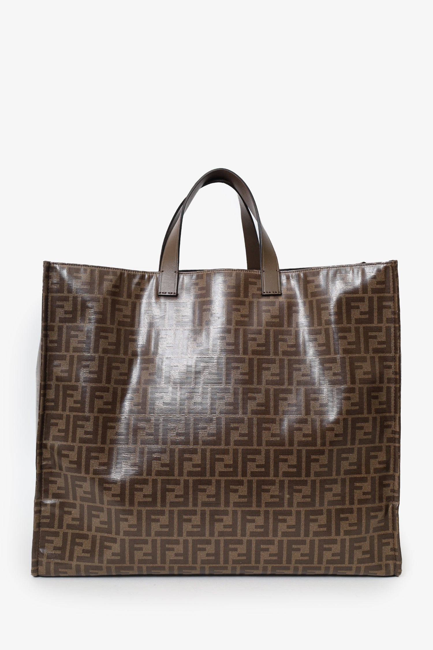 Refresh availabilityFendi Brown FF Monogram Large Tote Bag. Top open. Twin handles. Open felt-lined interior. 1 interior zip pocket. Gold-tone hardware. Tonal stitching.