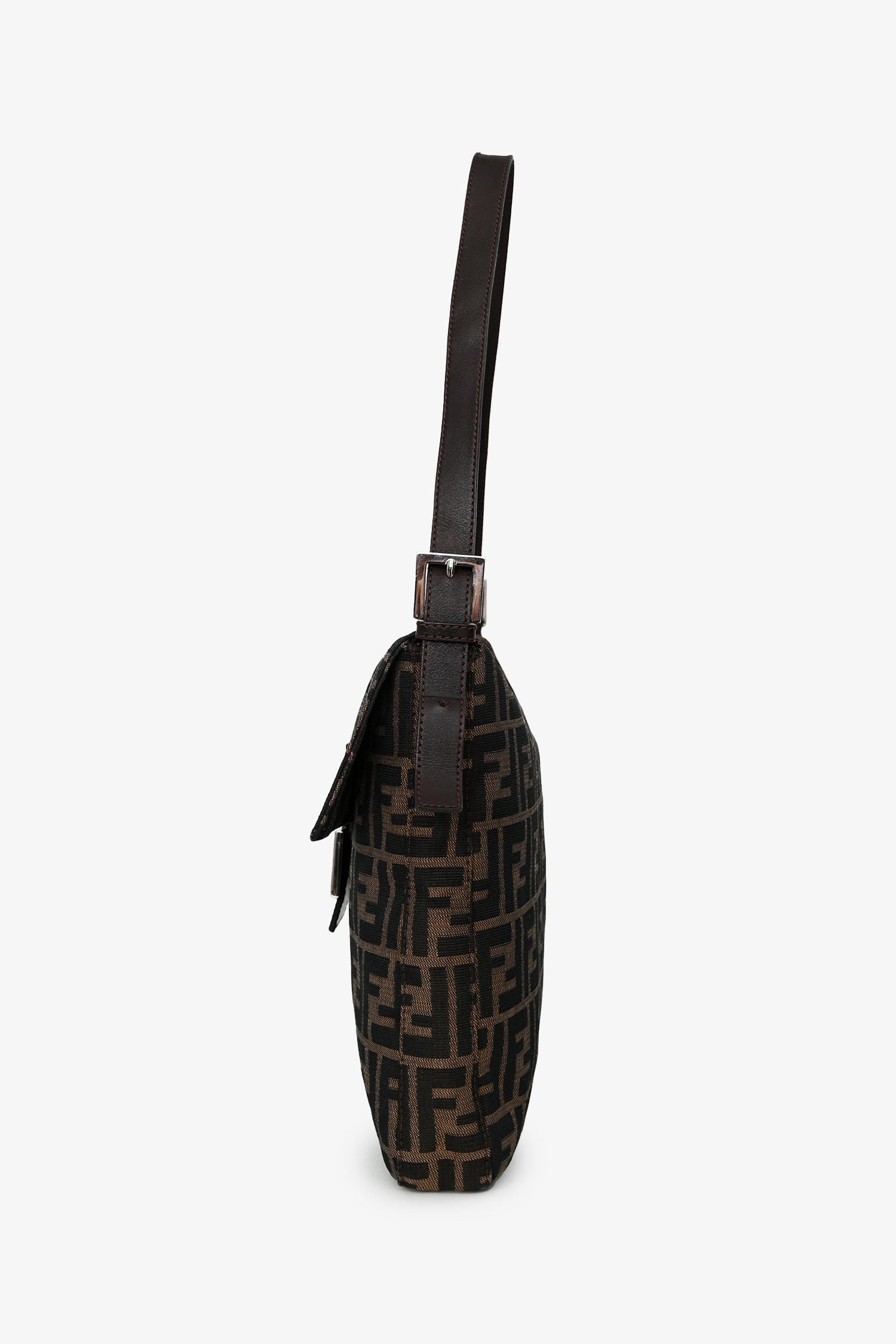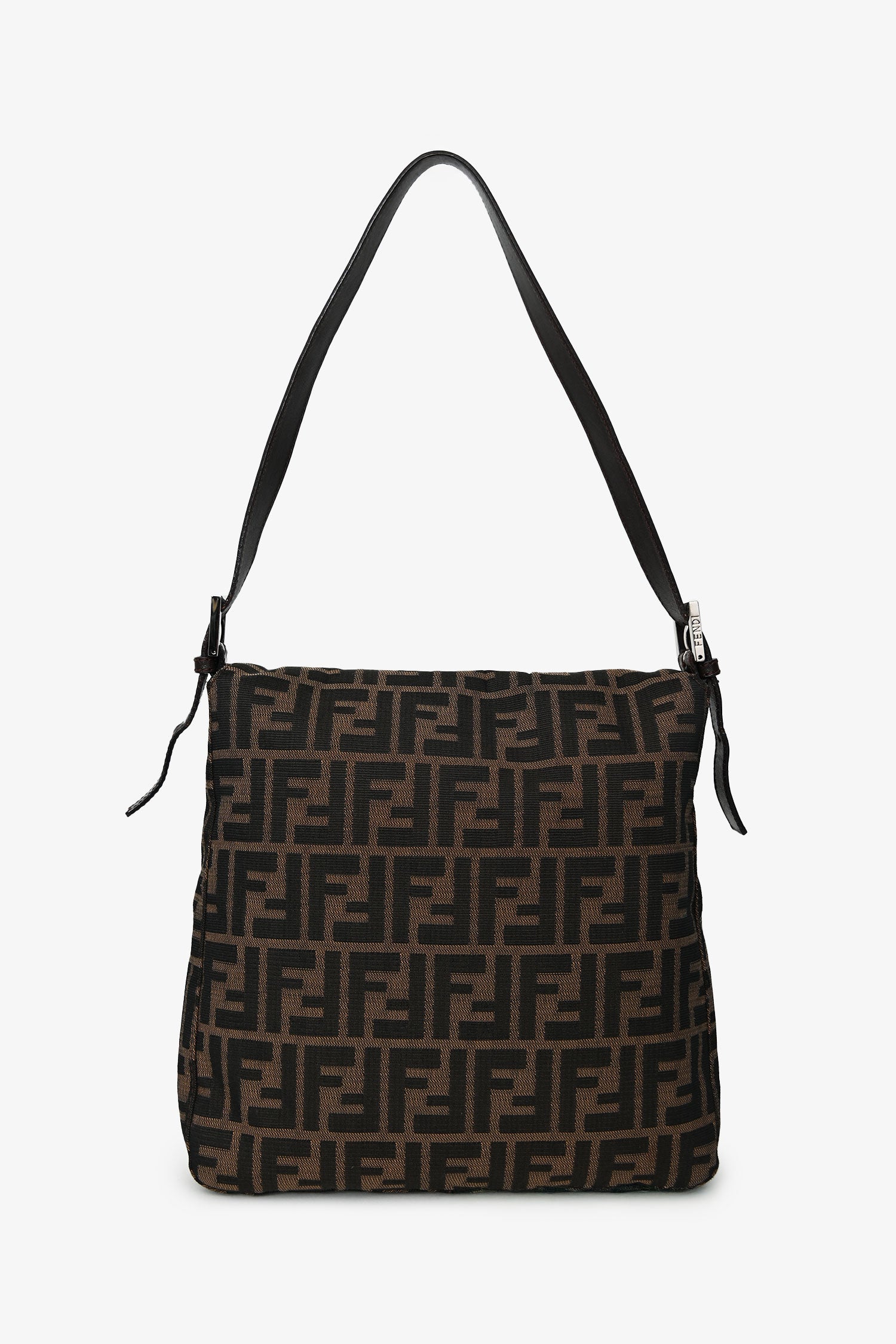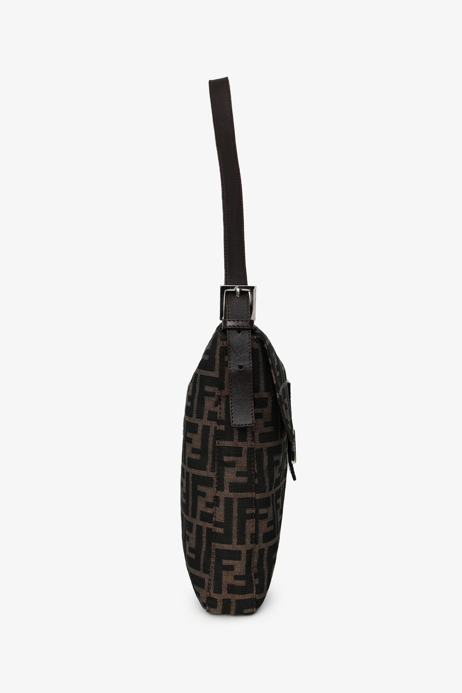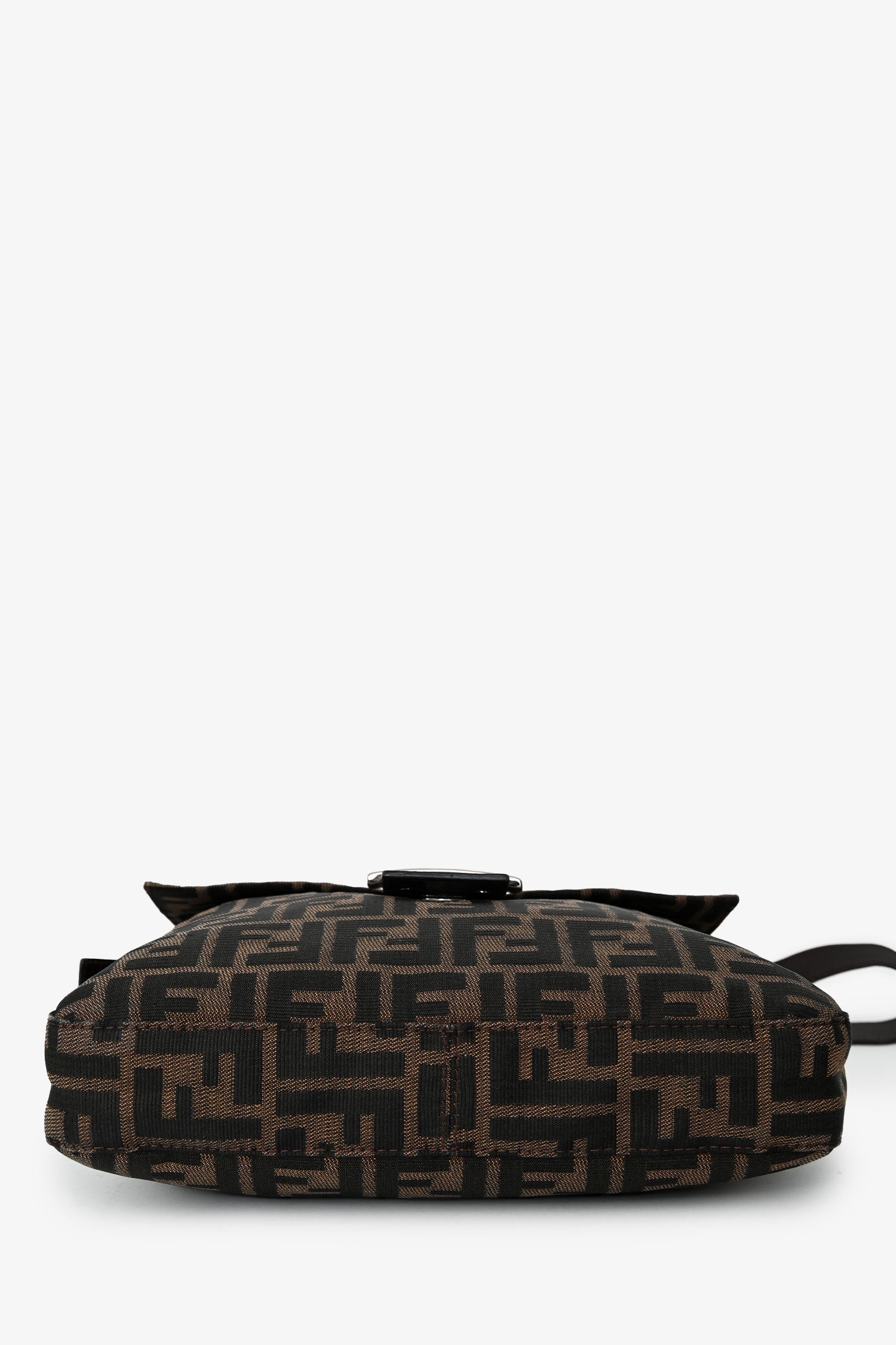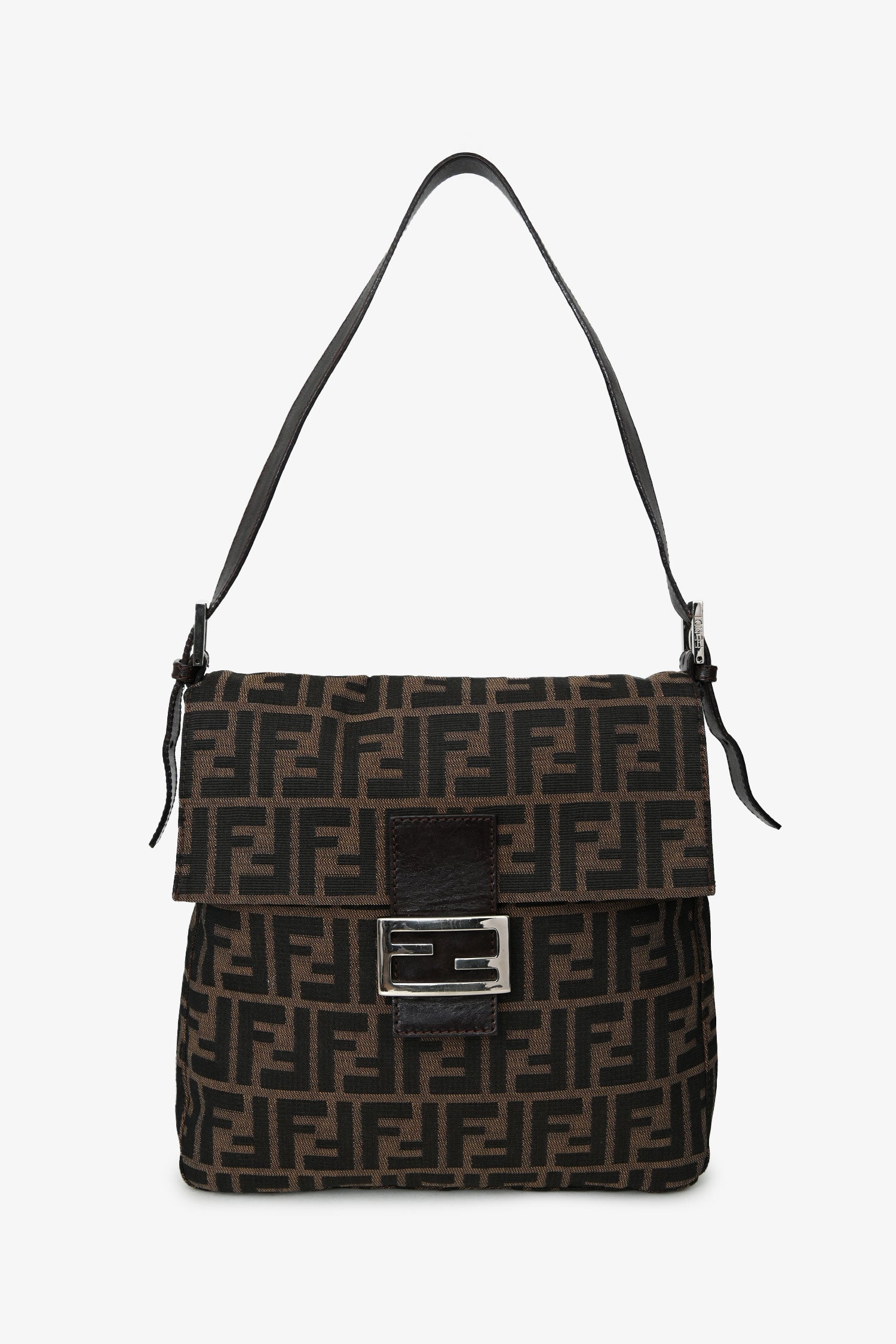 Refresh availabilityFendi Brown FF Zucca Canvas Square Baguette Shoulder Bag. Fold-over flap with a snap closure. Single leather shoulder strap. Lined interior with 1 zip. Silver-tone hardware. Tonal stitching.
