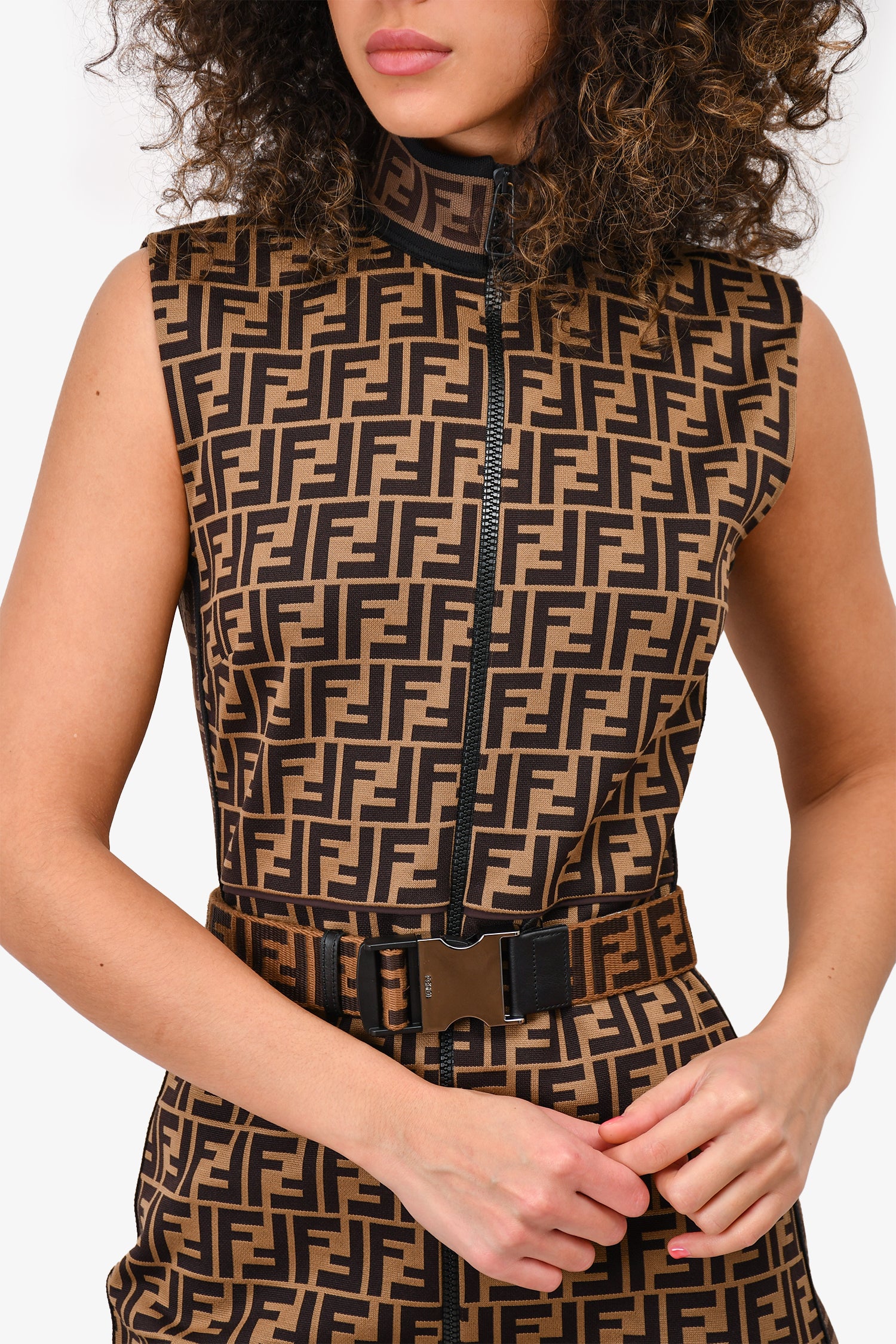 Refresh availabilityFendi Brown FF Zucca Monogram Zip Up High Neck Dress With Belt. Front zip-up closure. Removable belt. Silver-tone hardware. Tonal stitching.