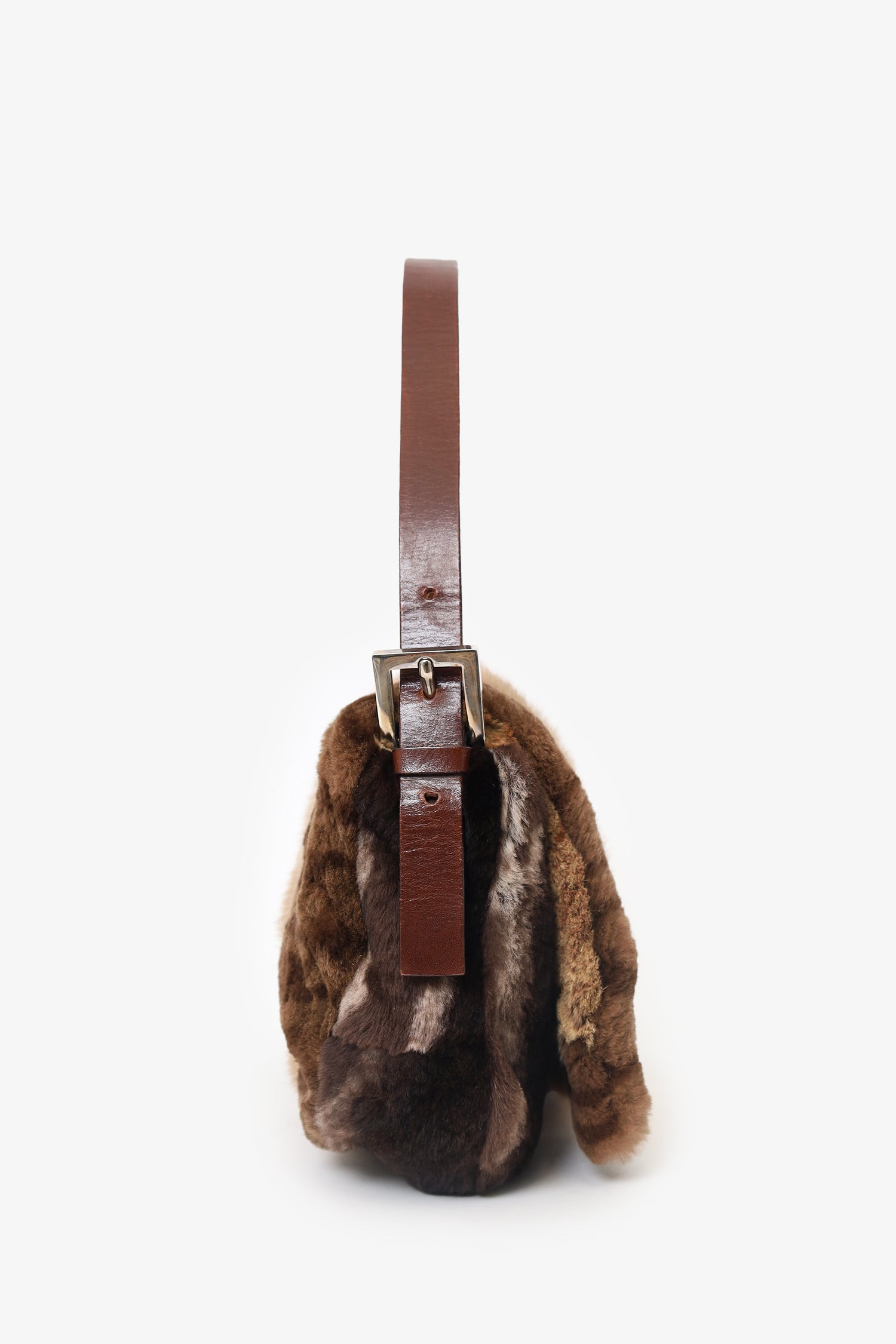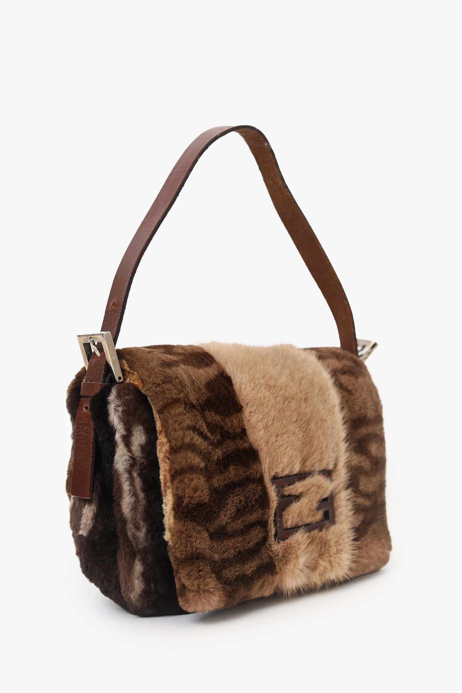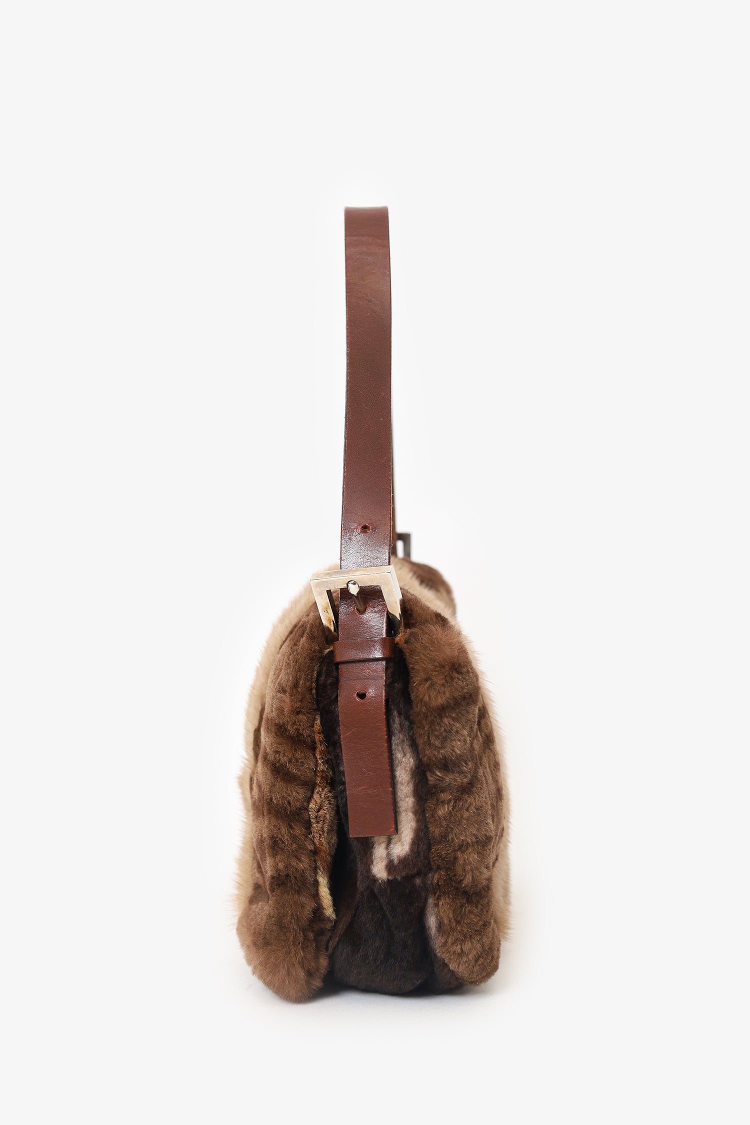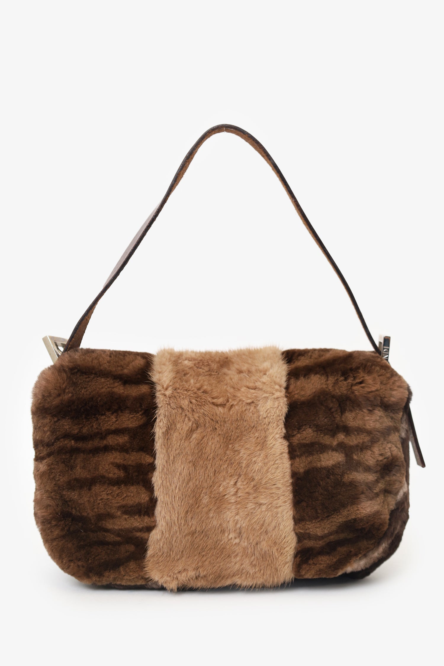Refresh availabilityFendi Brown Fur Baguette Shoulder Bag. Front fold-over flap closure. Adjustable leather shoulder strap. Leather lined interior. Silver-tone hardware.