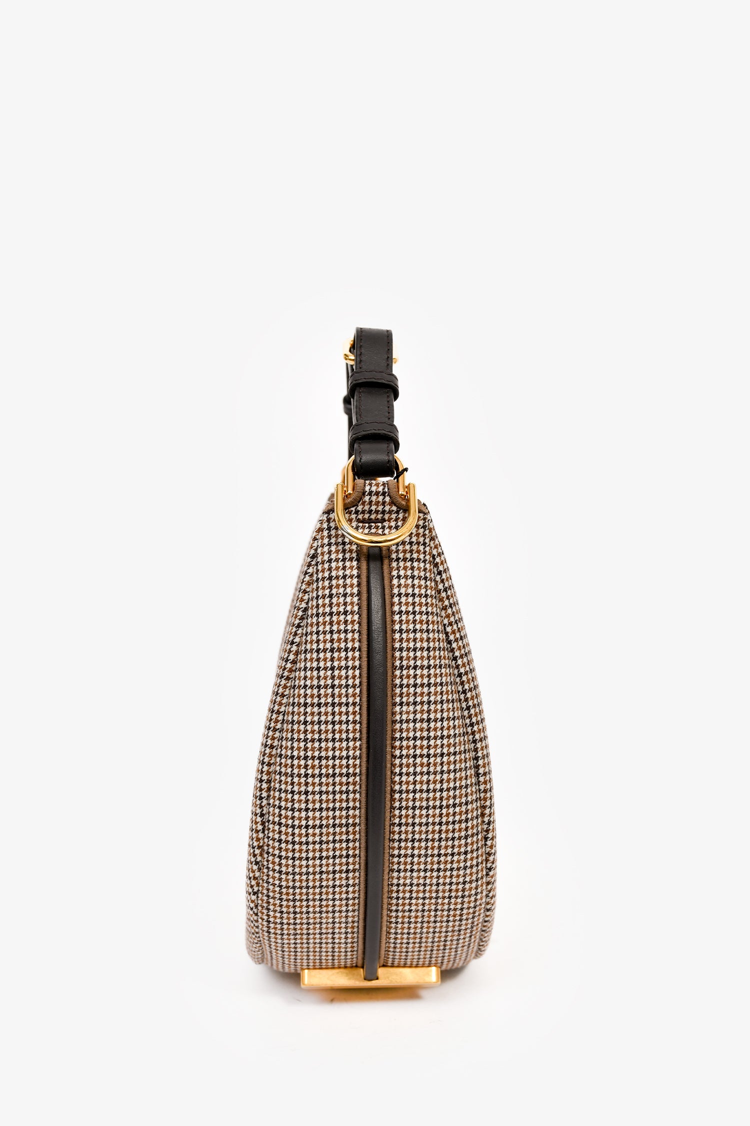 Refresh availabilityFendi Brown Leather/Fabric Houndstooth Fendigraphy Small Shoulder Bag. Top zip closure. Single adjustable leather shoulder strap. Fendi metal letters on bottom. Gold-tone hardware. Contrast stitching.