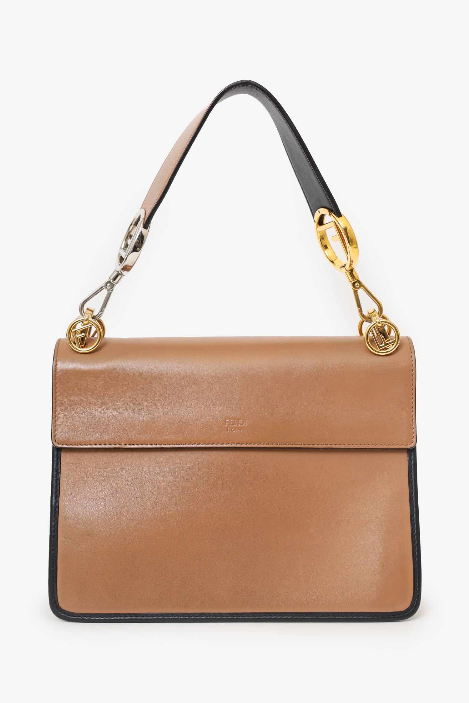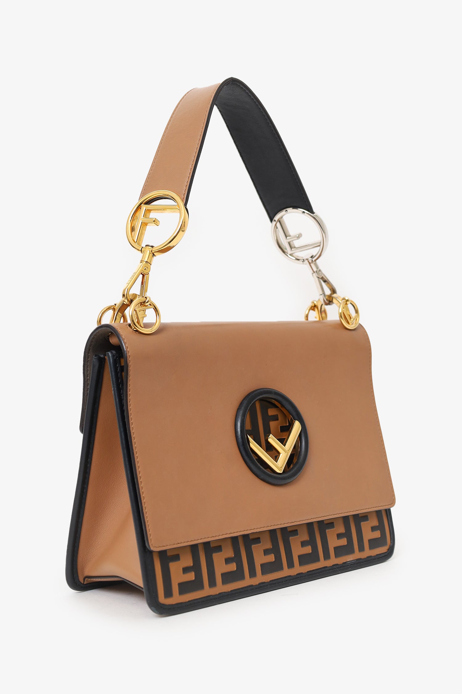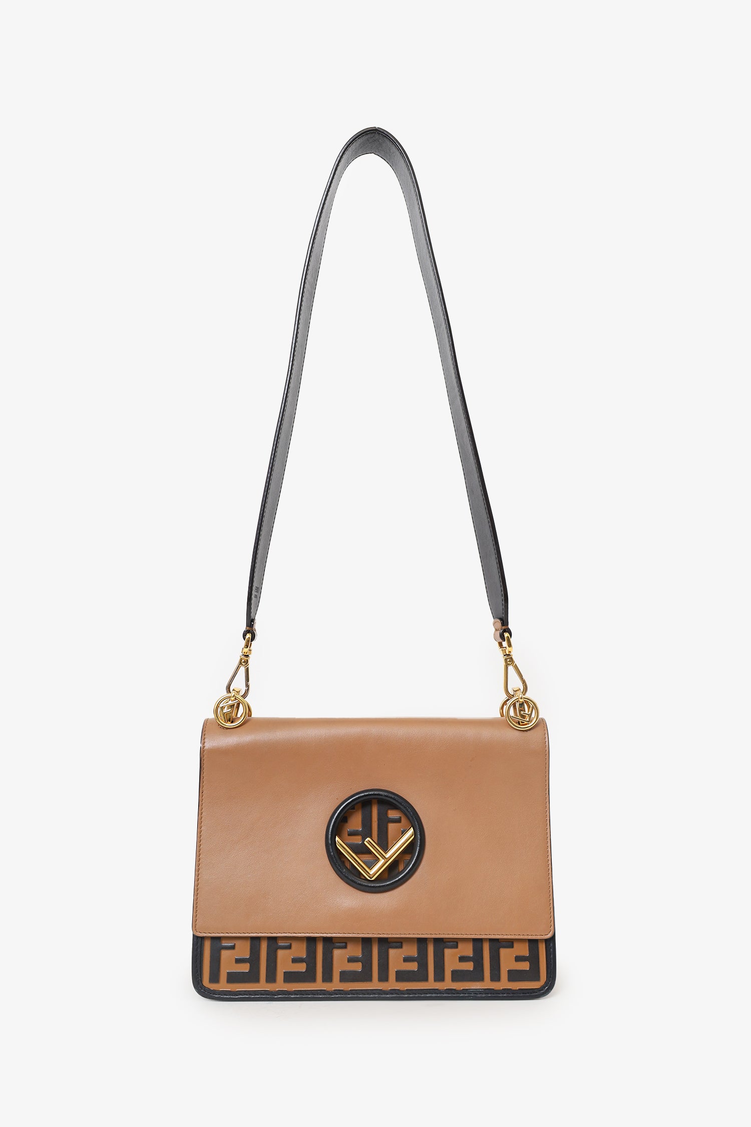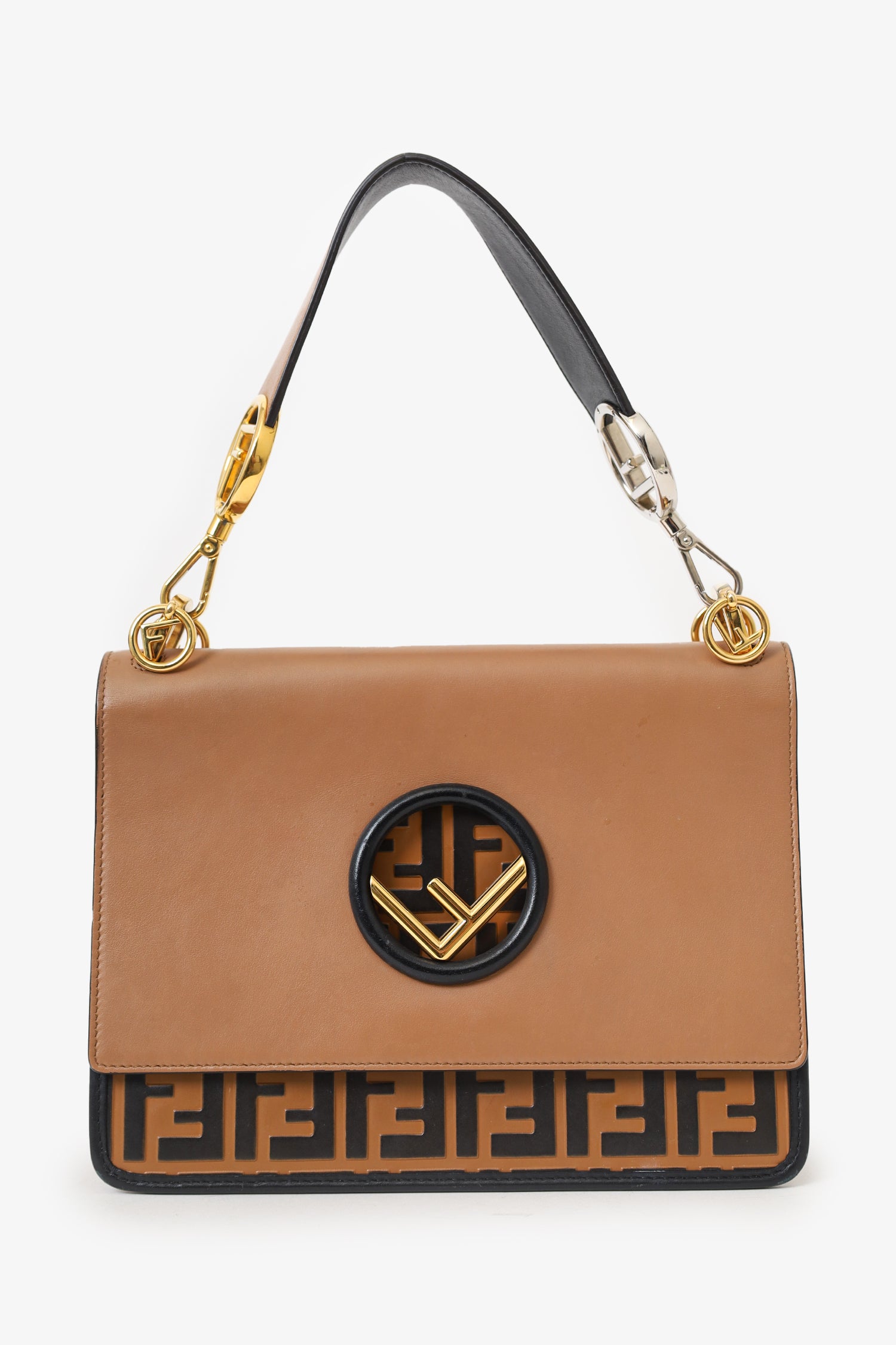 Refresh availabilityFendi Brown Leather Kan I F Logo Shoulder Bag. Front fold-over flap with magnetic closure. 2 removable straps with clasp closures; crossbody and shoulder. Suede-lined interior. Single interior slip pocket. Gold and silver-tone hardware. Tonal stitching.