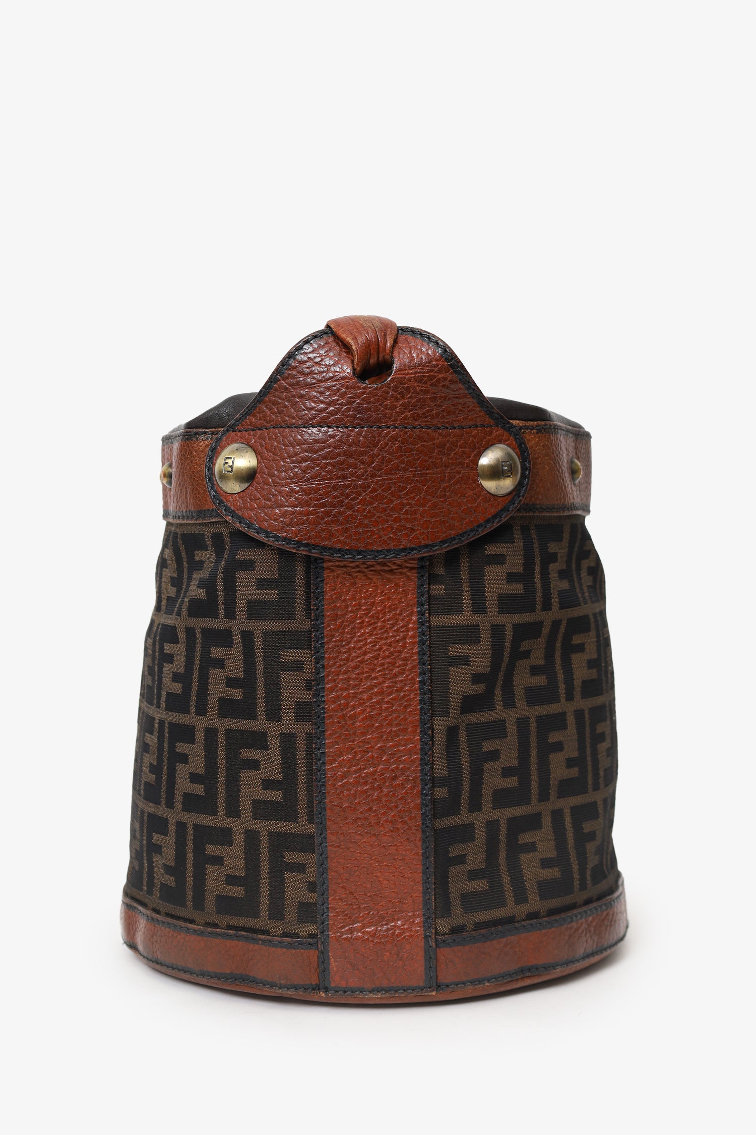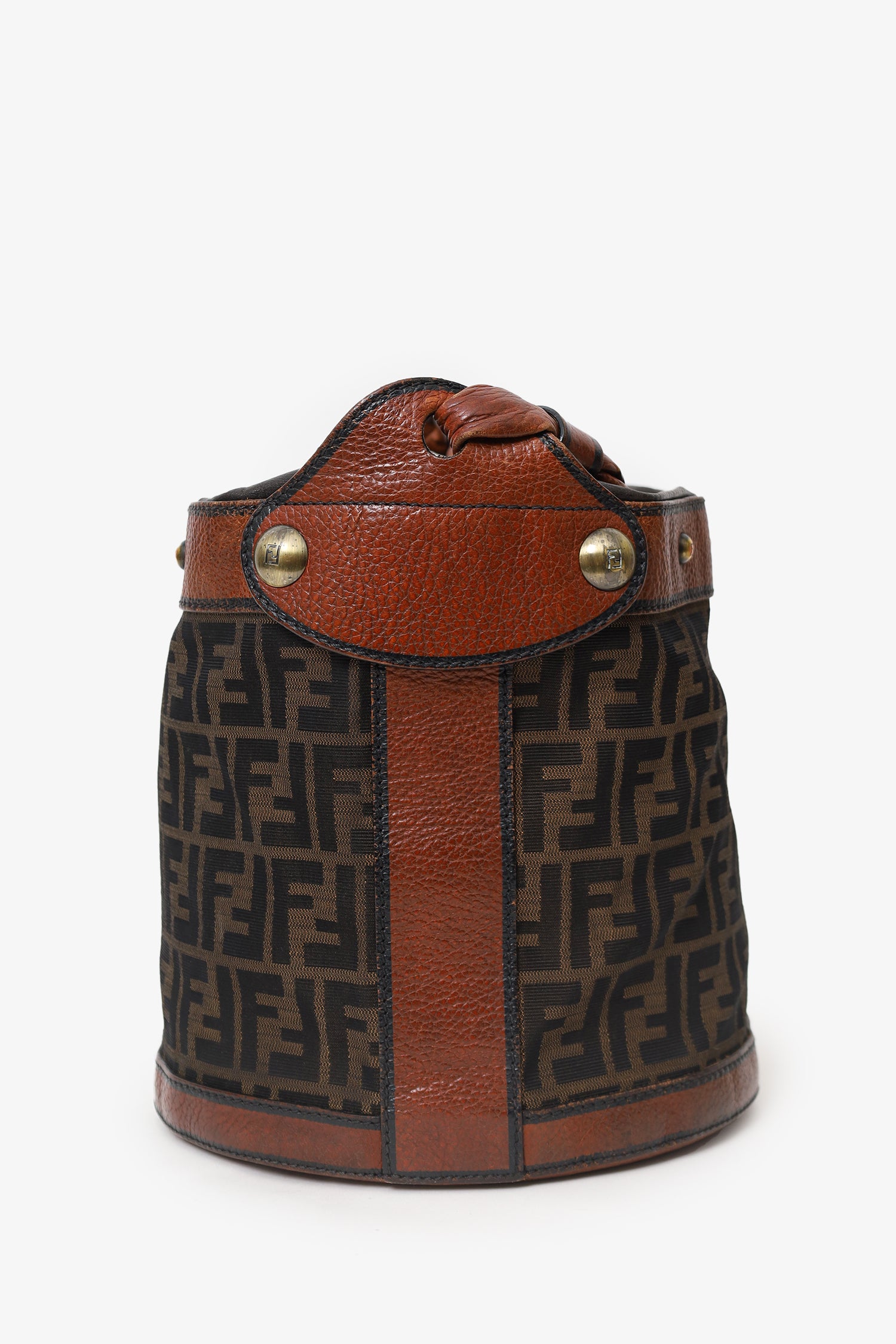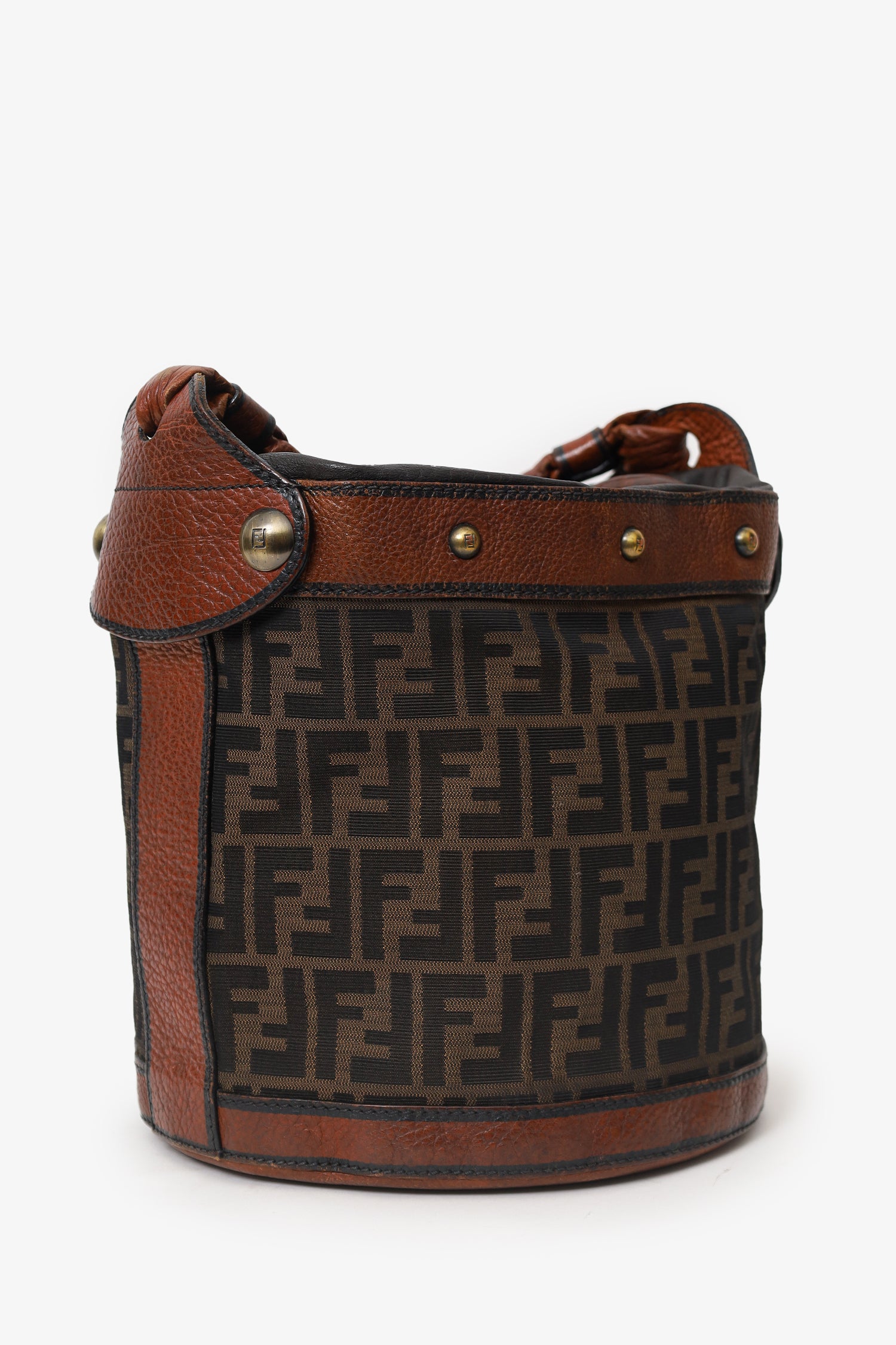 Refresh availabilityFendi Brown Leather/Canvas Zucca Palazzo Bucket Bag. Interior cinch cord closure. Shoulder strap. Lined interior with 6 slip pockets. Brass-tone hardware. Tonal stitching.