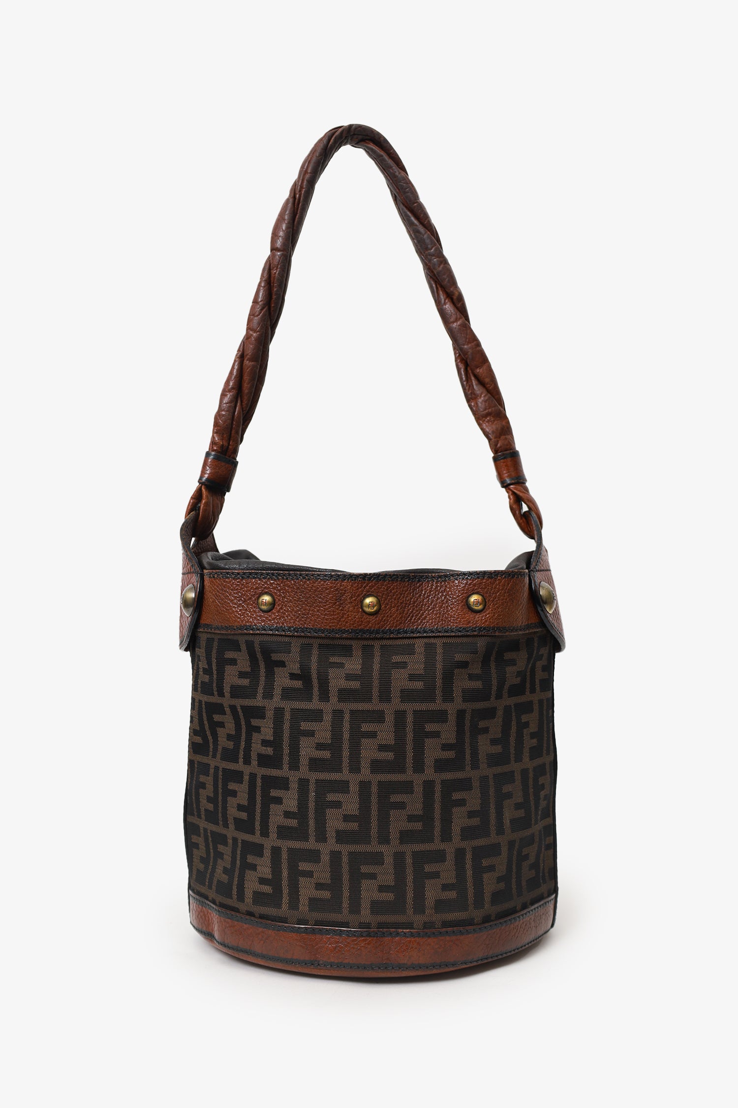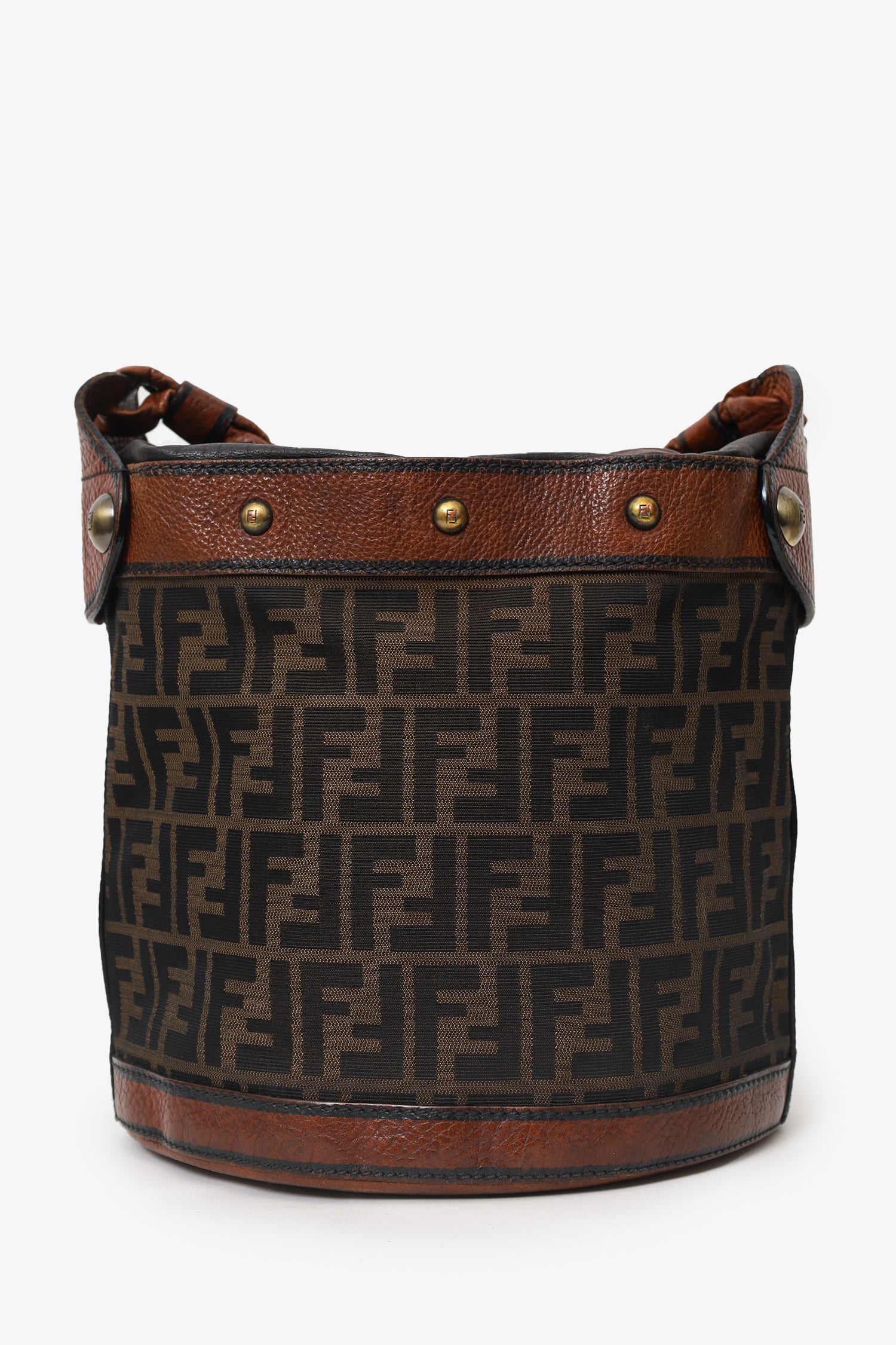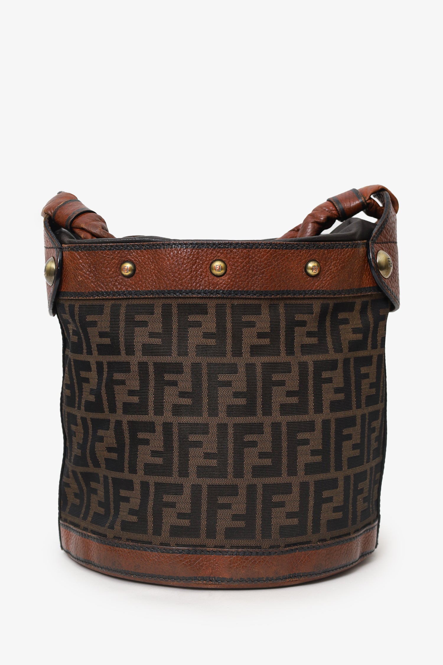 Refresh availabilityFendi Brown Leather/Canvas Zucca Palazzo Bucket Bag. Interior cinch cord closure. Shoulder strap. Lined interior with 6 slip pockets. Brass-tone hardware. Tonal stitching.