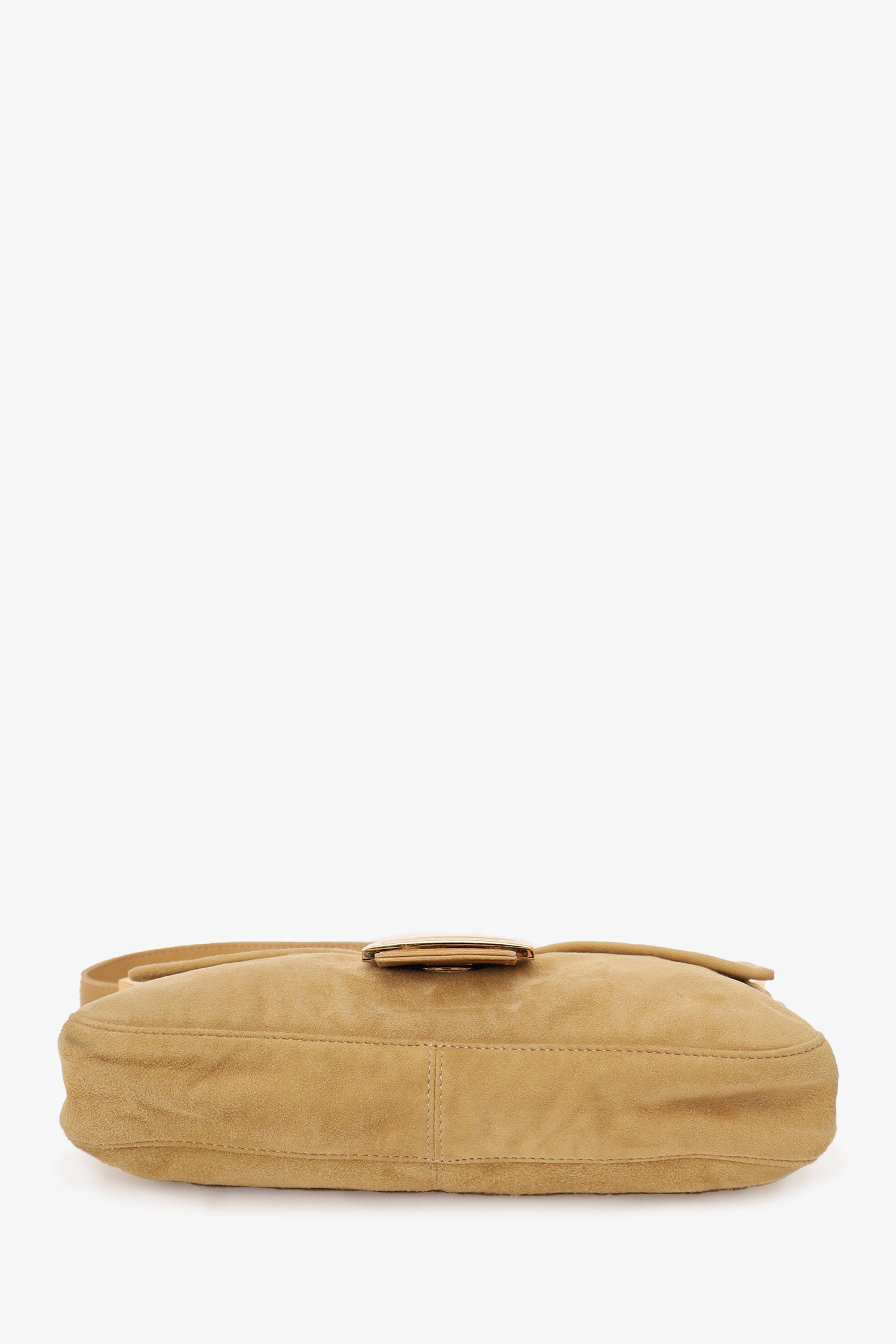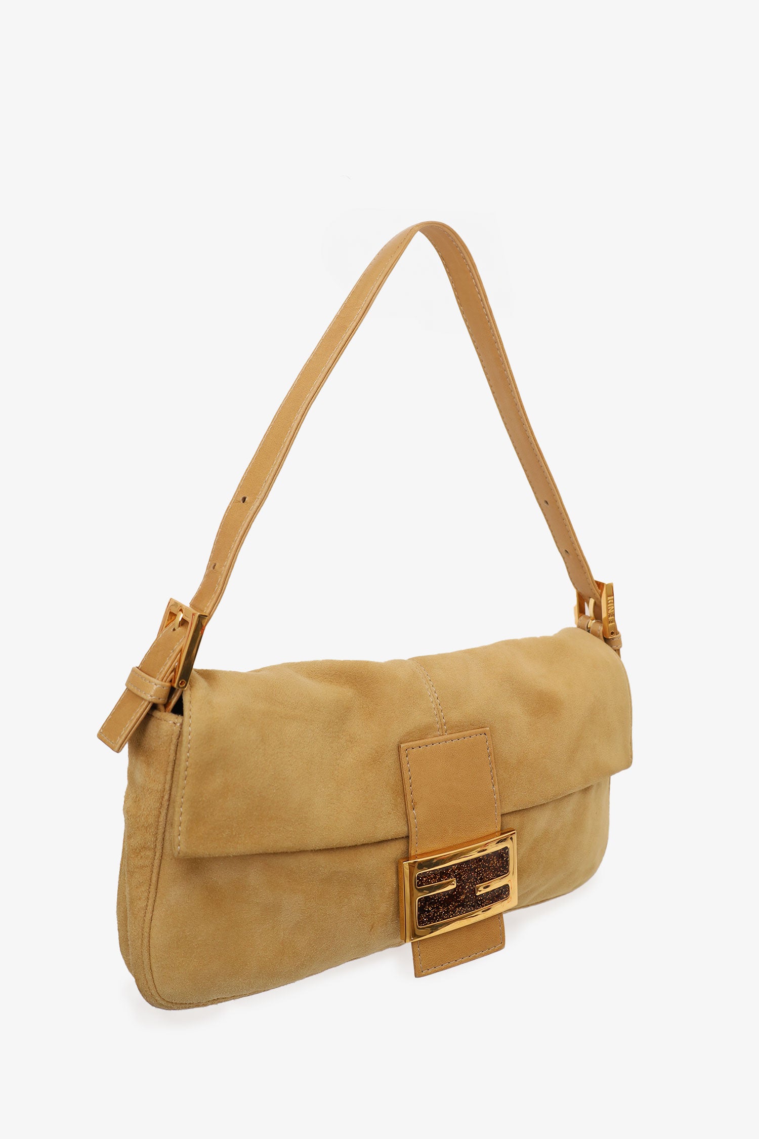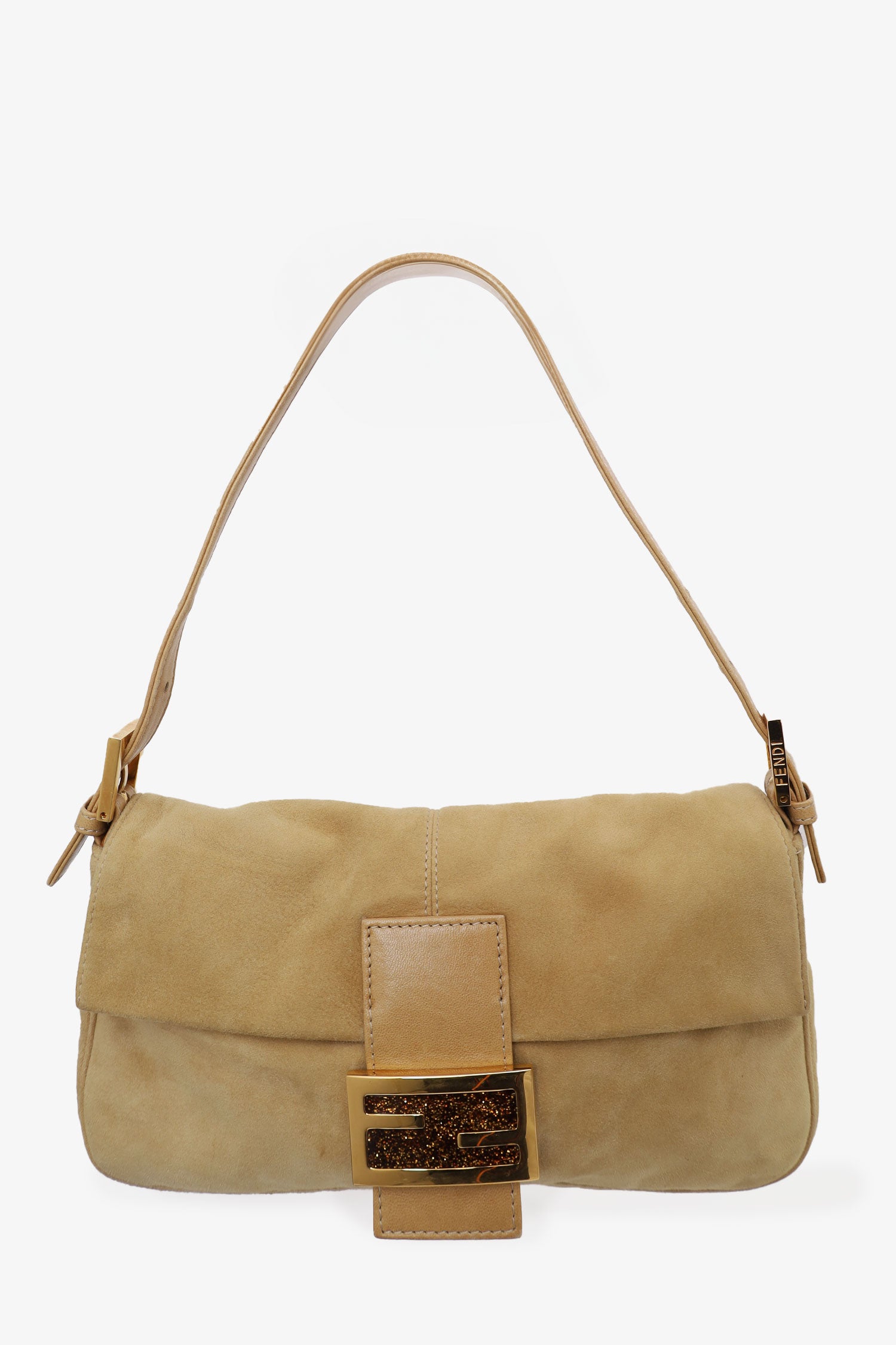 Refresh availabilityFendi Brown Suede Baguette Shoulder Bag. Front fold-over flap with magnetic closure. Removable/adjustable buckle strap. Sparkle and leather detail on front hardware. Single interior zip compartment. Gold-tone hardware. Contrast stitching.