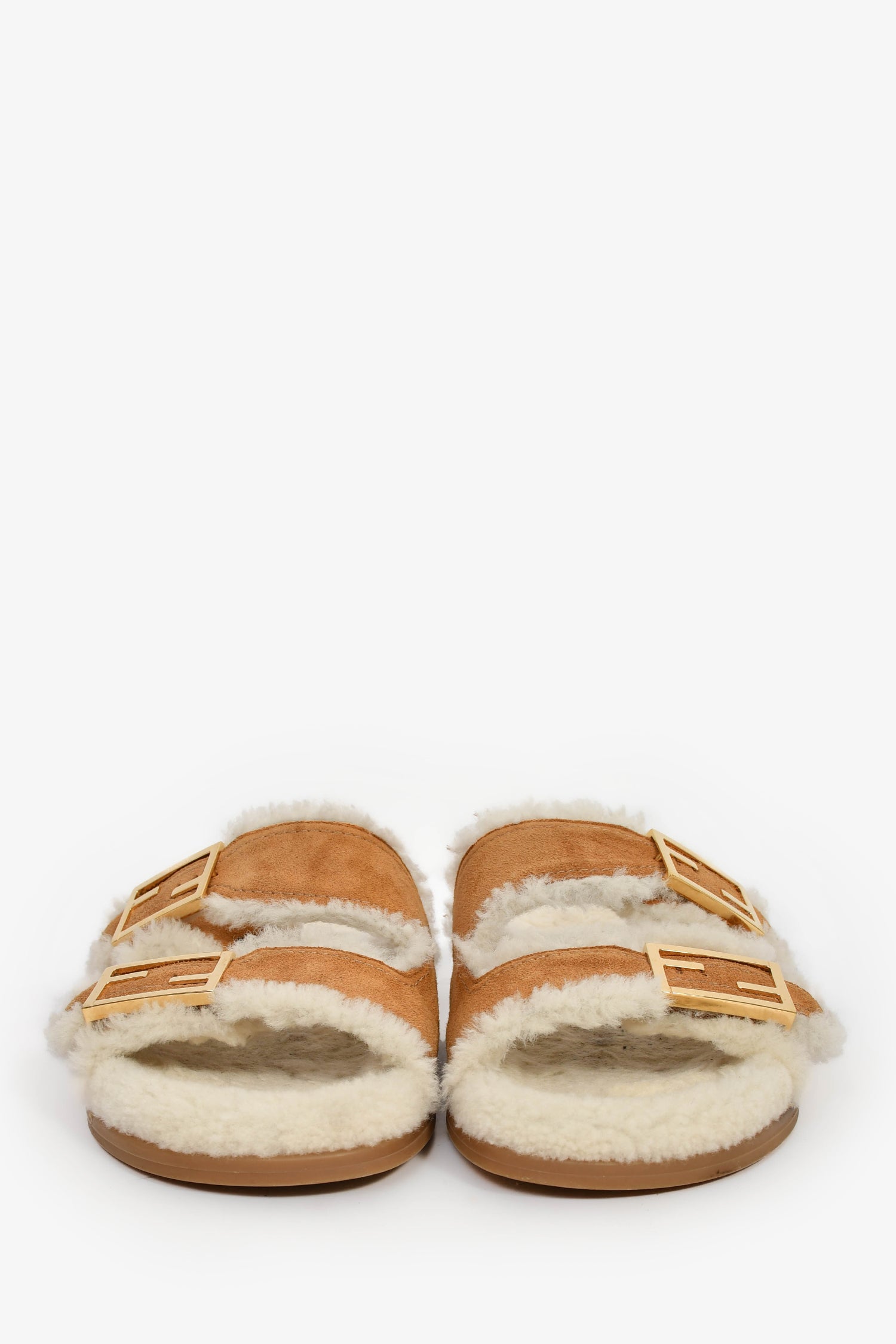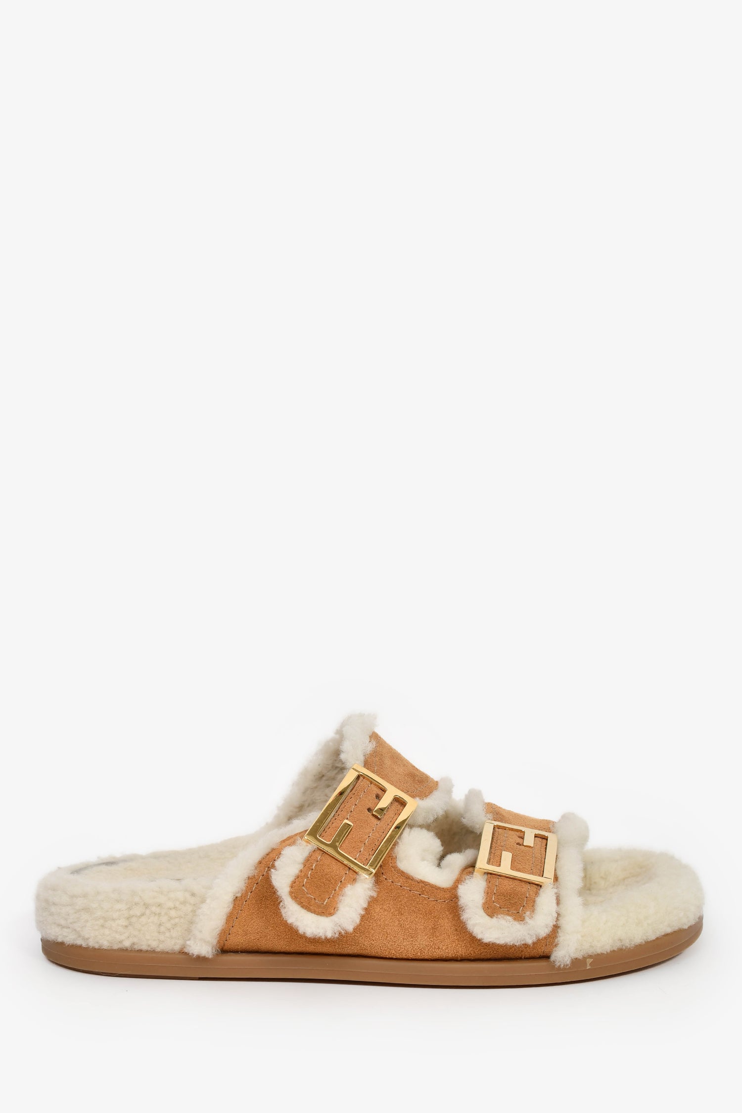 Refresh availabilityFendi Brown Suede Shearling Sandals. Slip-on. Open-round toe. Top buckle closure. Shearling interior. Gold-tone hardware. Tonal stitching.