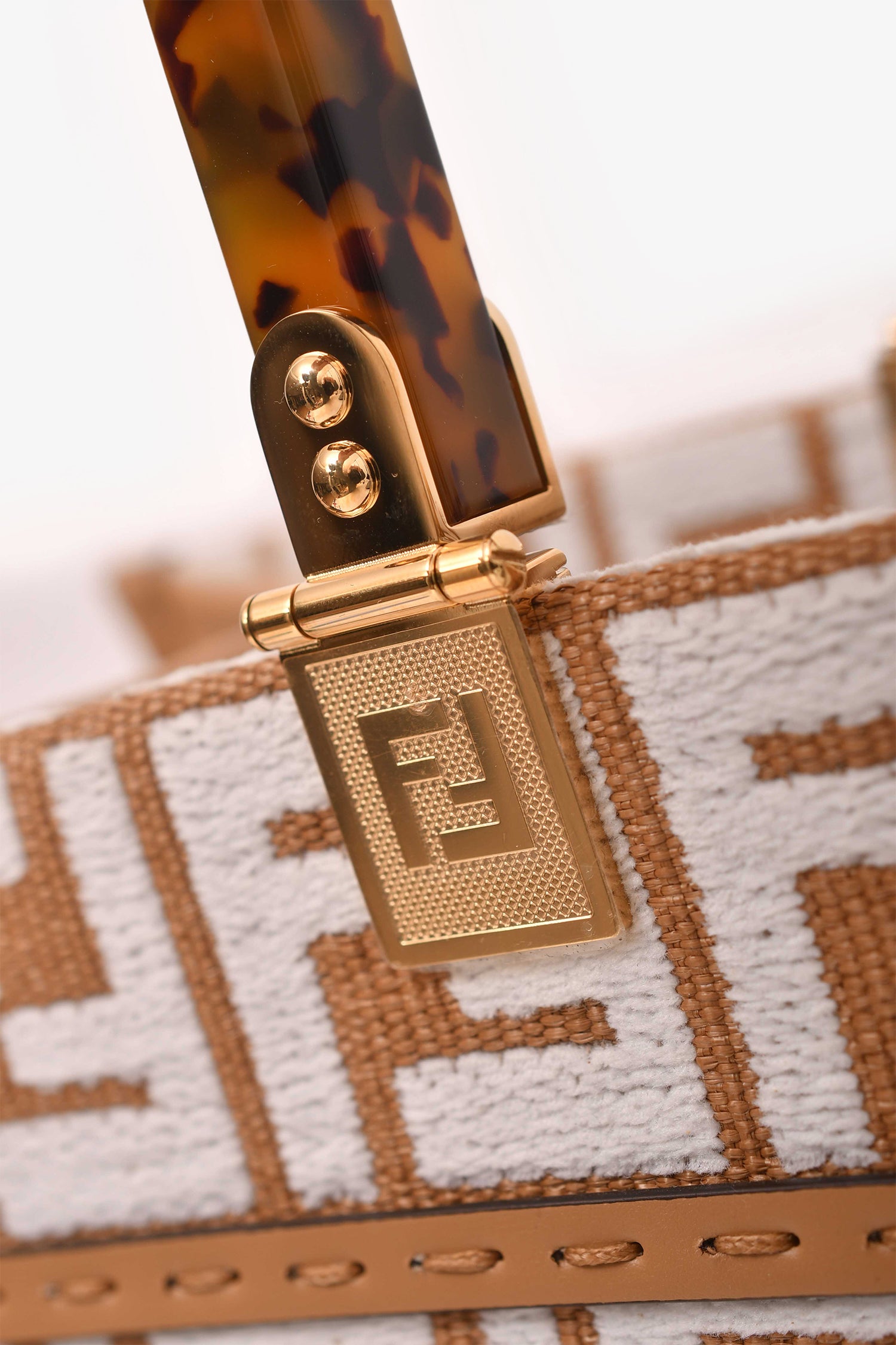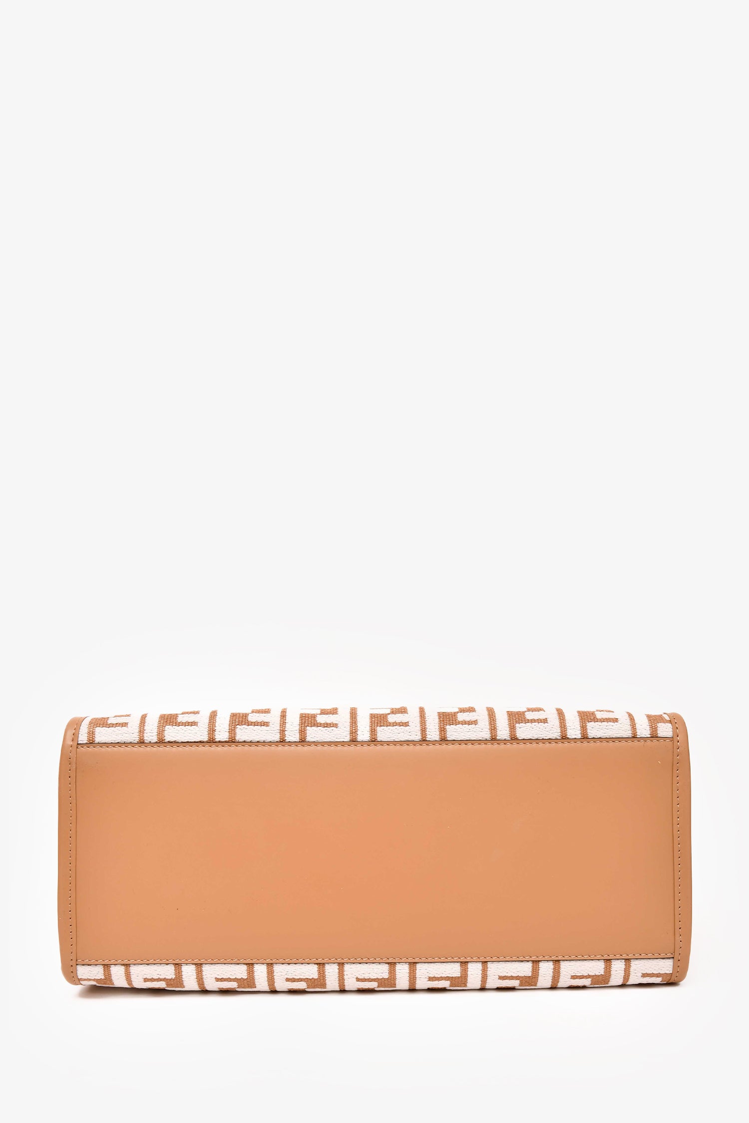 Refresh availabilityFendi Brown/ White Leather/Canvas FF Zucca Sunshine Shopping Tote With Strap. Tortoise top handle. Removeable strap. Gold-tone hardware. Structured. No closure. Tonal stitching.