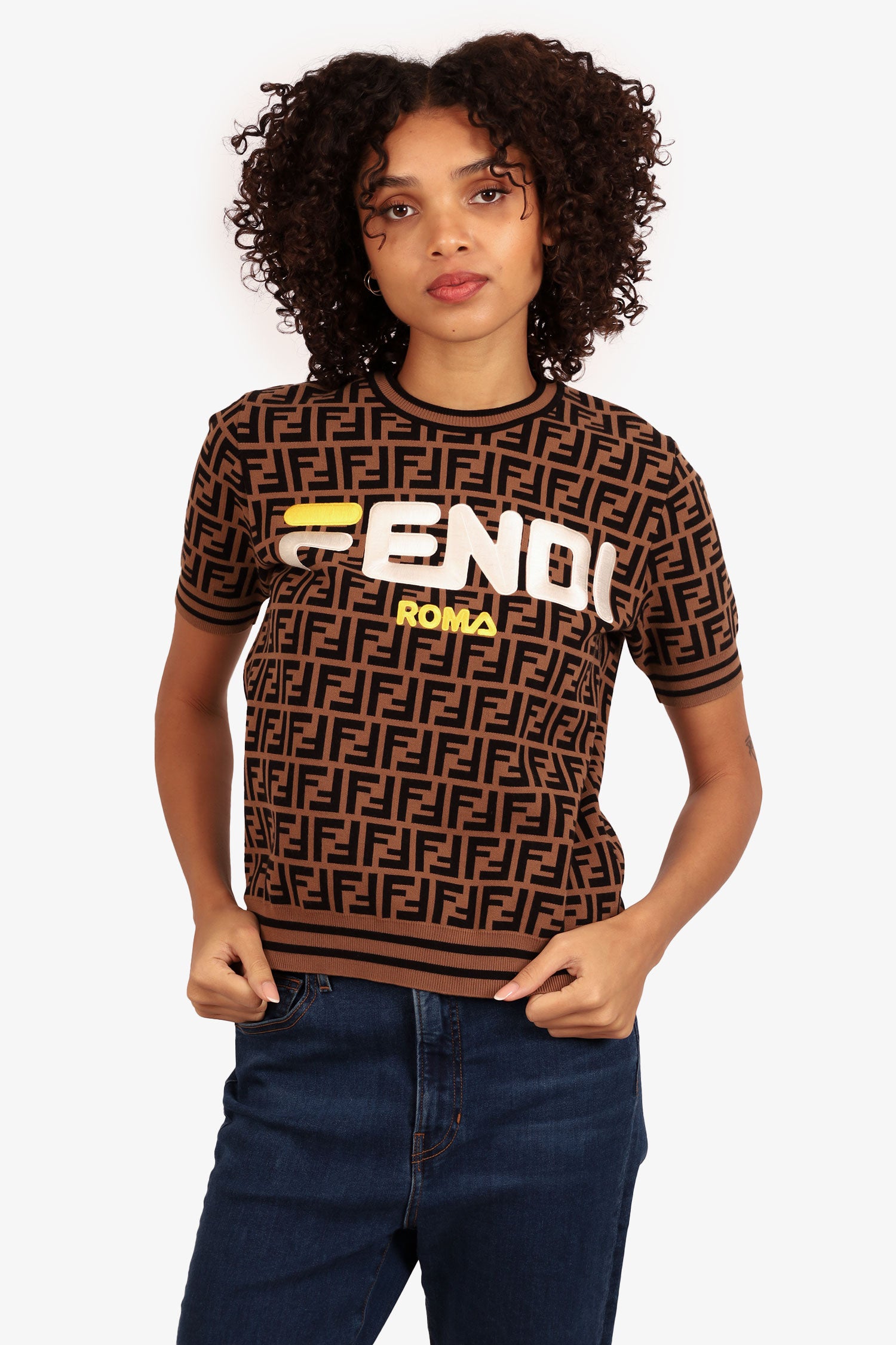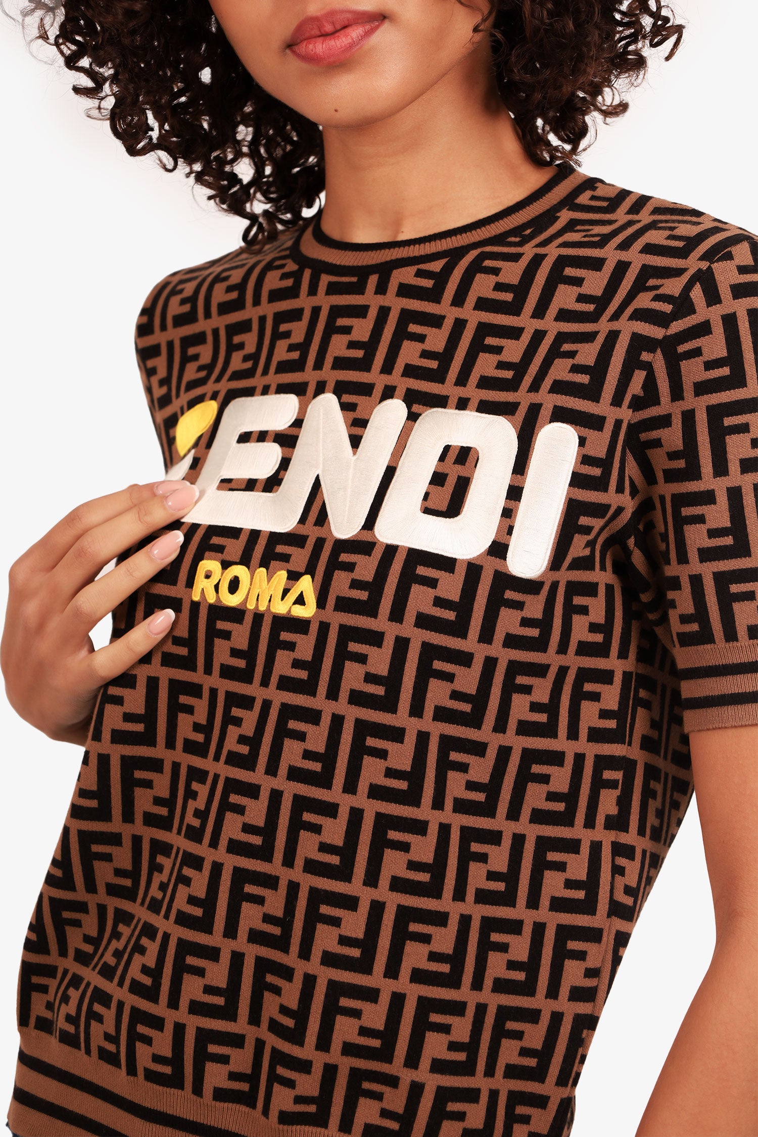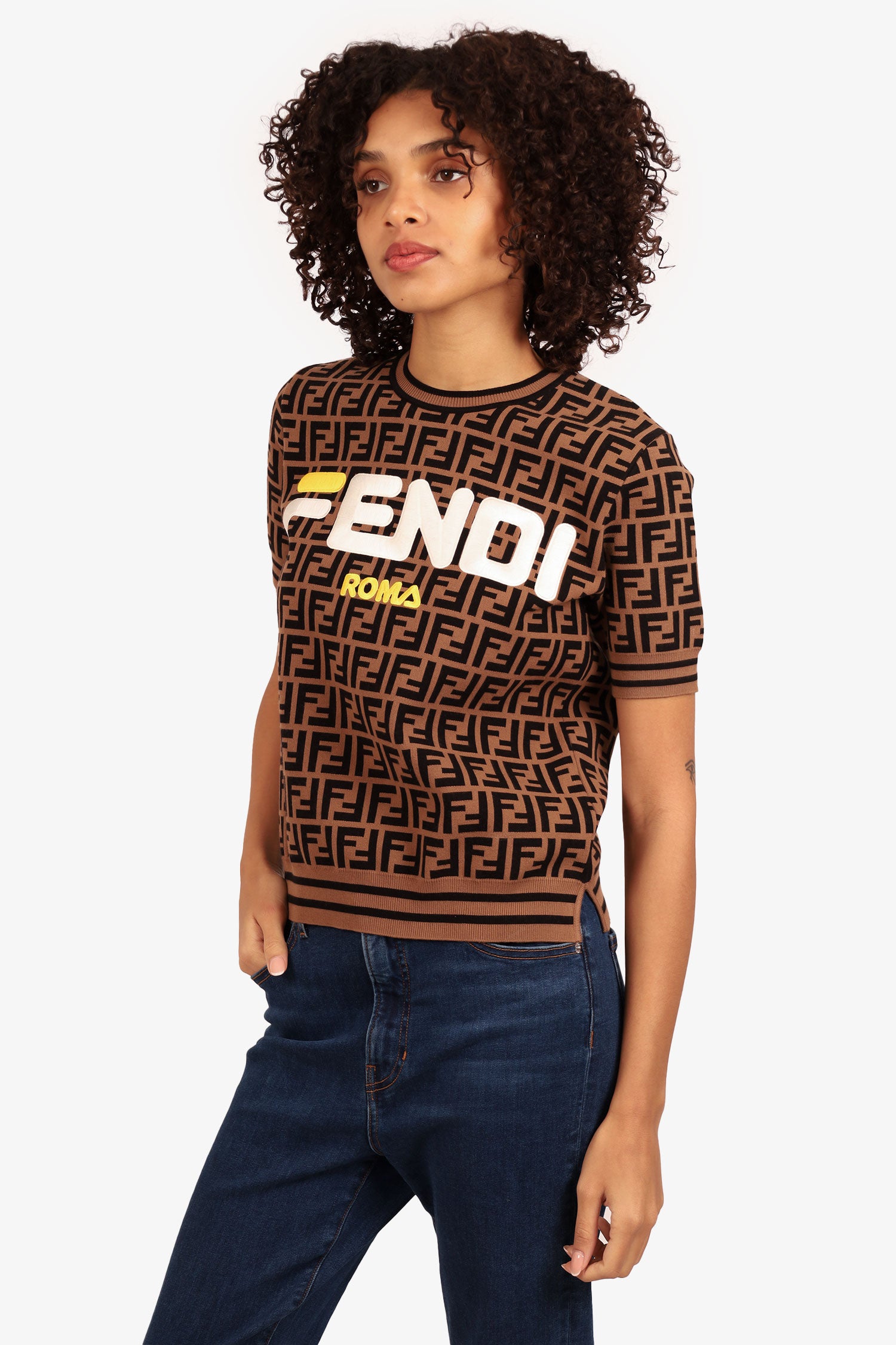 Refresh availabilityFendi Brown/Yellow Knit Zucca Print Short Sleeve Top. Pull-on. Round-neckline. Ribbed waistband and sleeve cuffs. Embroidered centre logo. Tonal stitching.