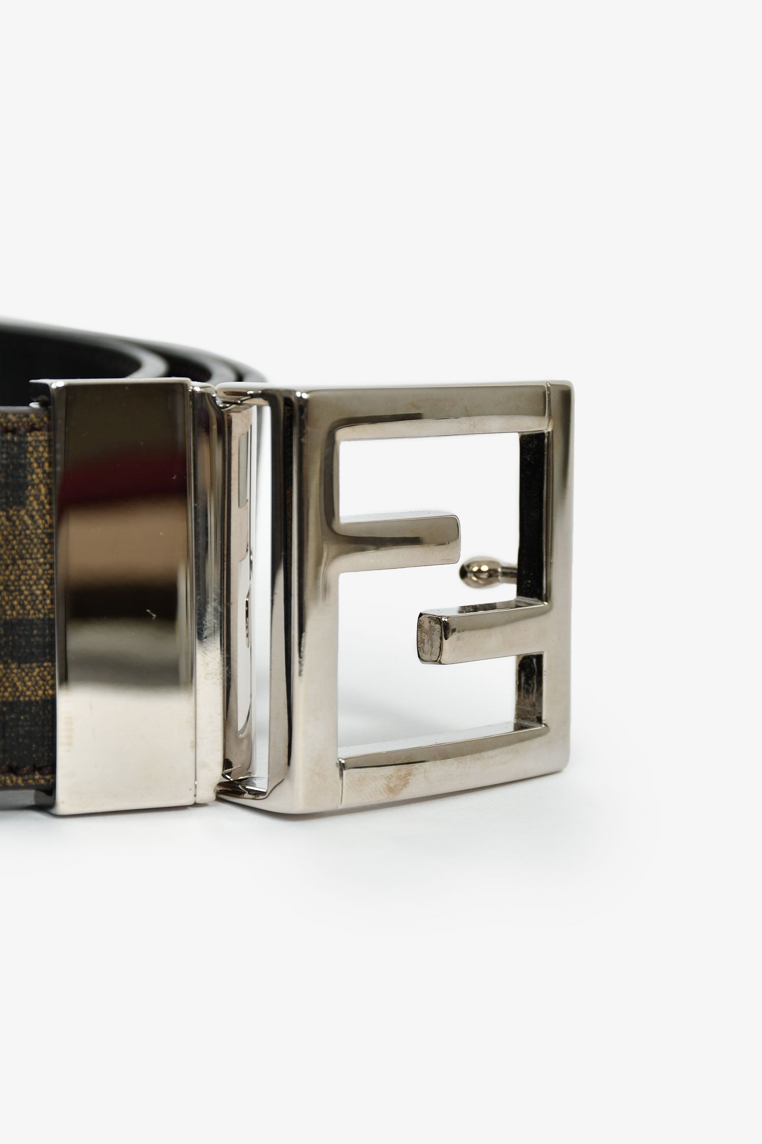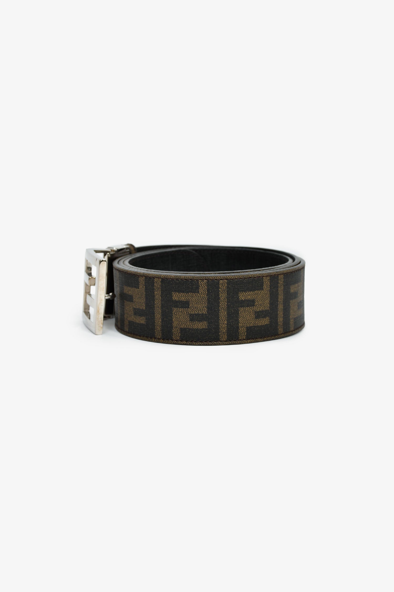 Refresh availabilityFendi Brown Zucca Canvas 'FF' Buckle Belt. Adjustable push-tab buckle closure. Silver-tone hardware. Tonal stitching.