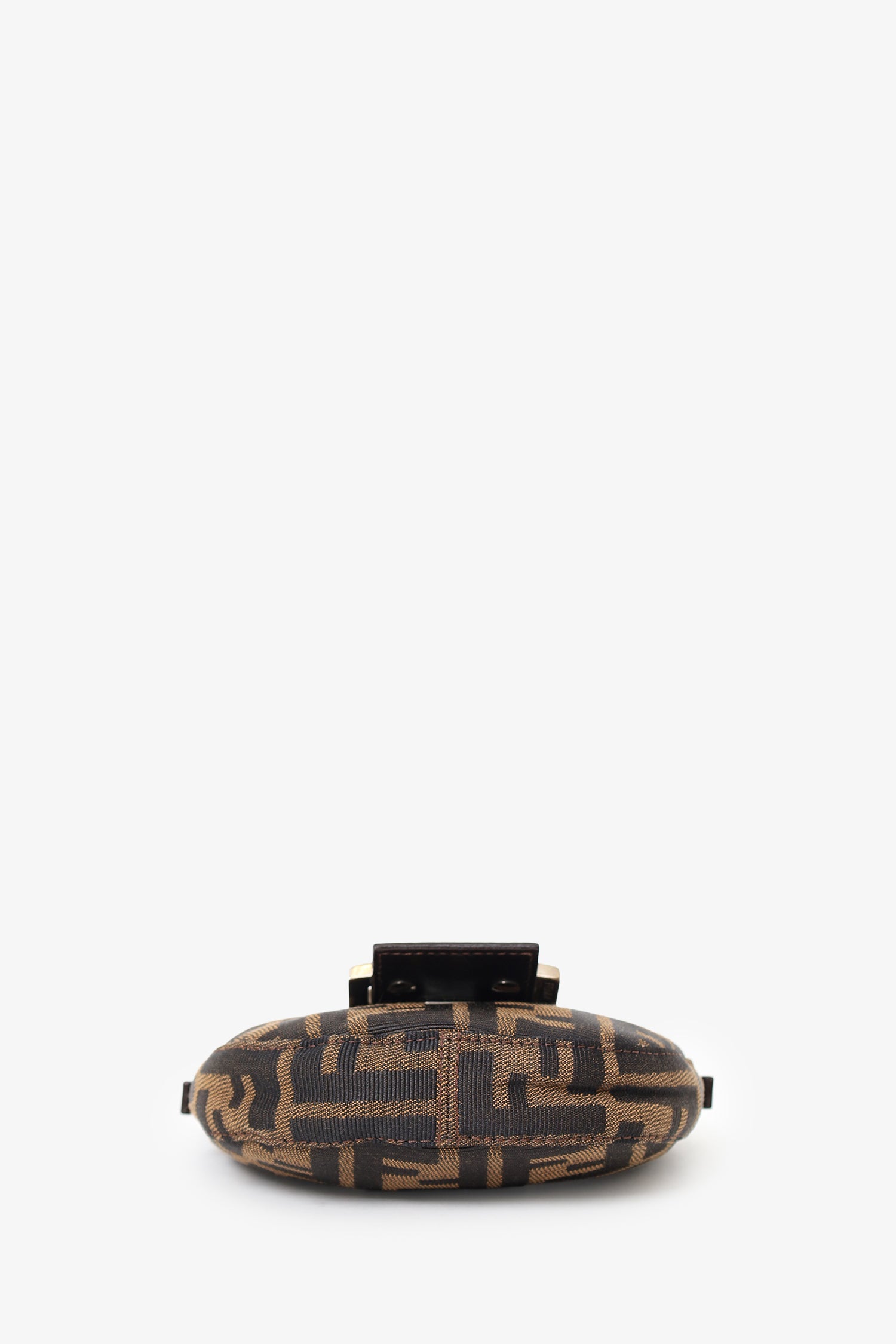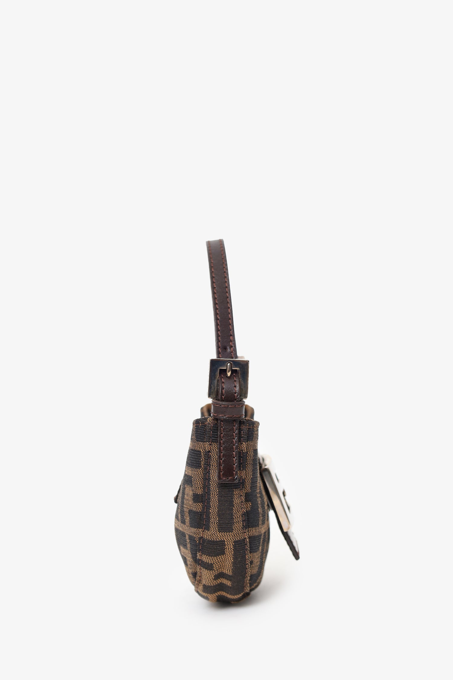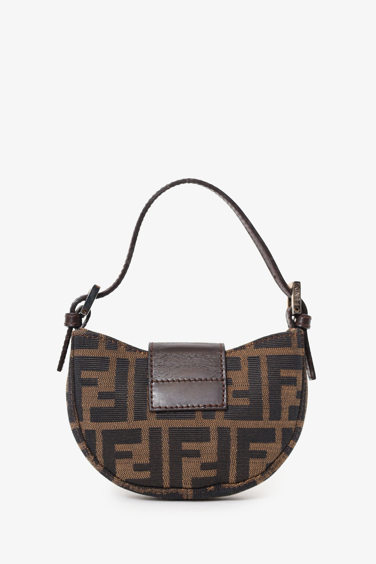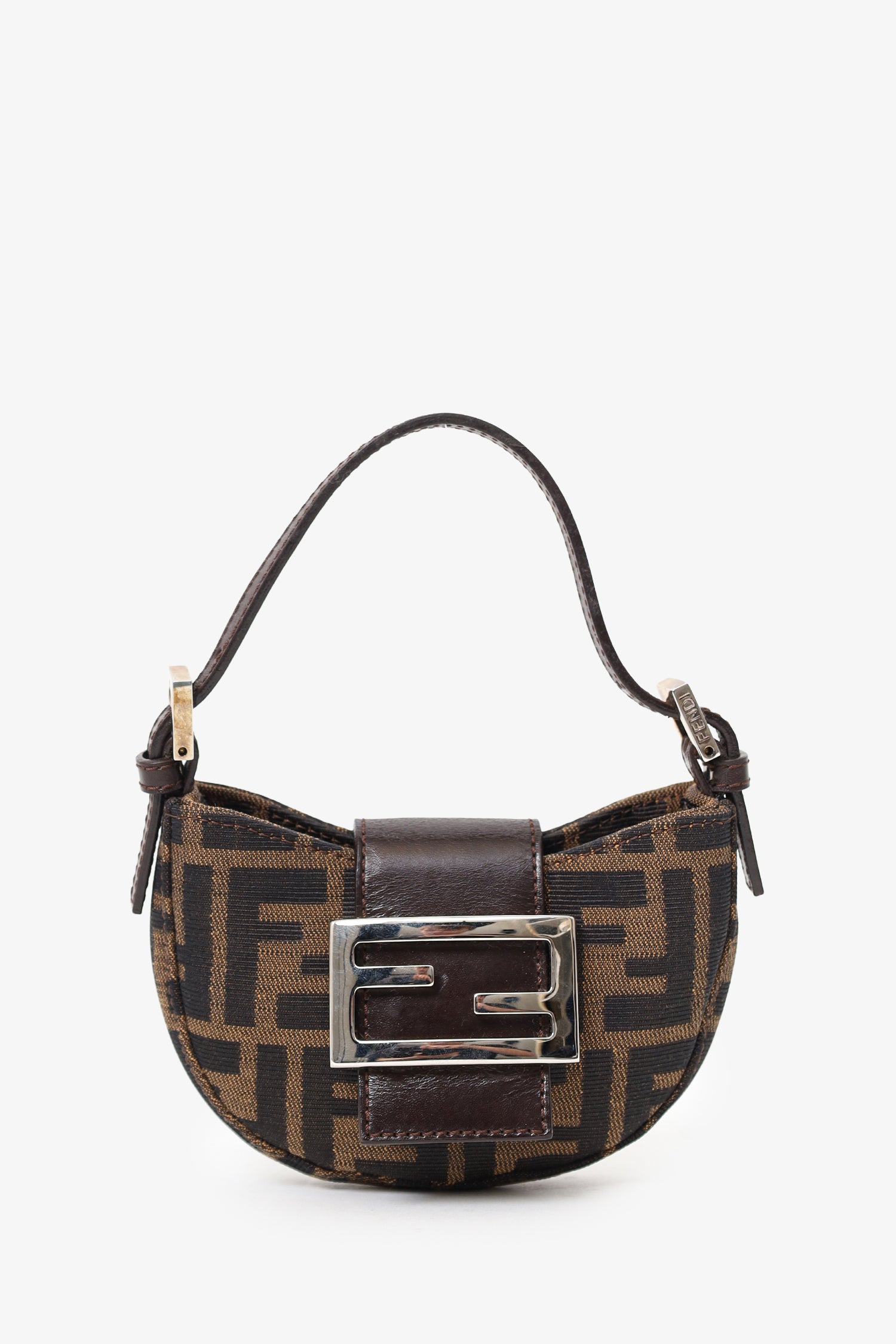 Refresh availabilityFendi Brown Zucca Print Canvas Mini Half Moon Shoulder Bag. Front-fold-over-flap with magnetic snap-button-up closure. Top handle with adjustable pull-through buckle closure. Lined interior. Silver-tone hardware. Tonal stitching.