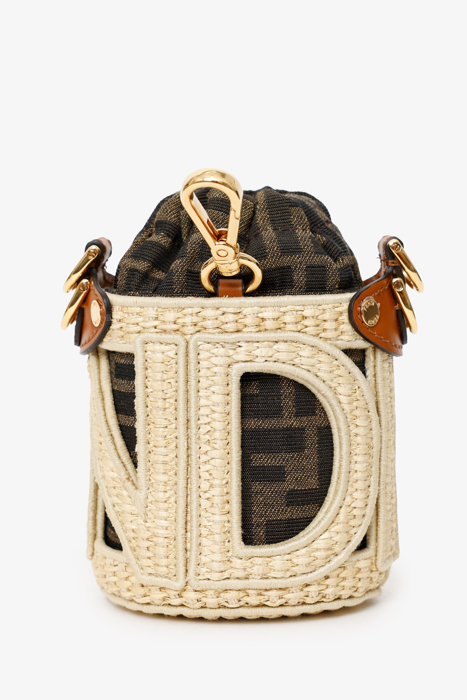 Refresh availabilityFendi Brown/Beige Zucca FF Step Out Nano Bucket Bag. Cinch cord closure. Leather crossbody strap with adjustable pull-through push-pin closure. Rear lobster clasp closure. Lined interior. Gold-tone hardware. Tonal stitching.