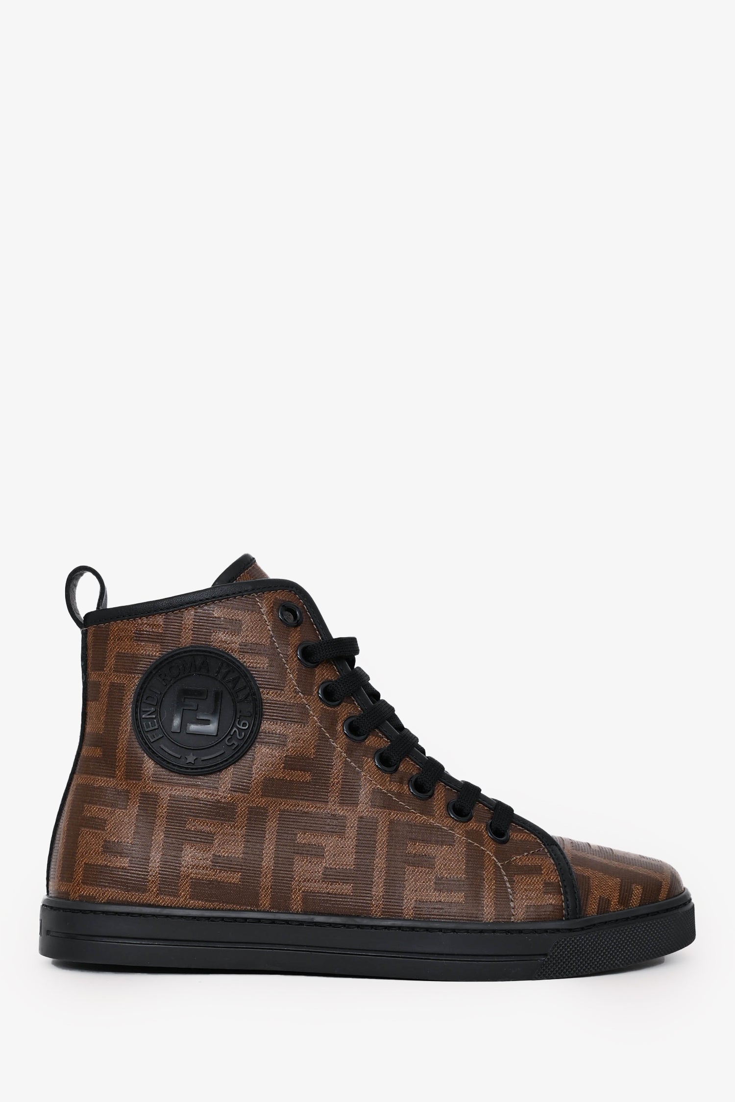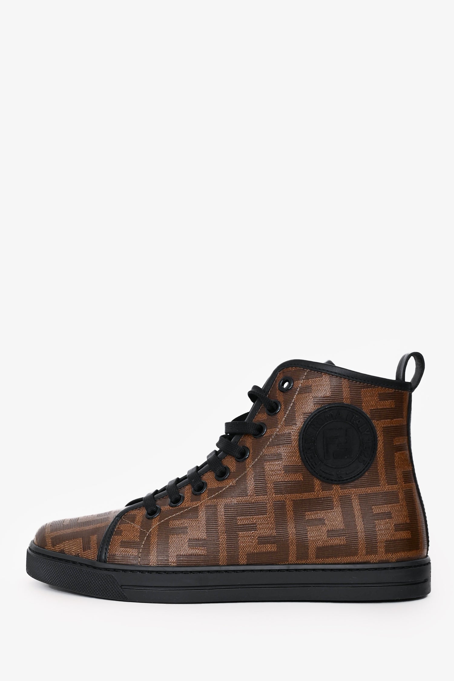 Refresh availabilityFendi Brown/Black Zucca High Top Sneakers. Front lace-up closure. Side zip closure. Round toe. Leather lining and insole. Rubber sole. Tonal stitching.