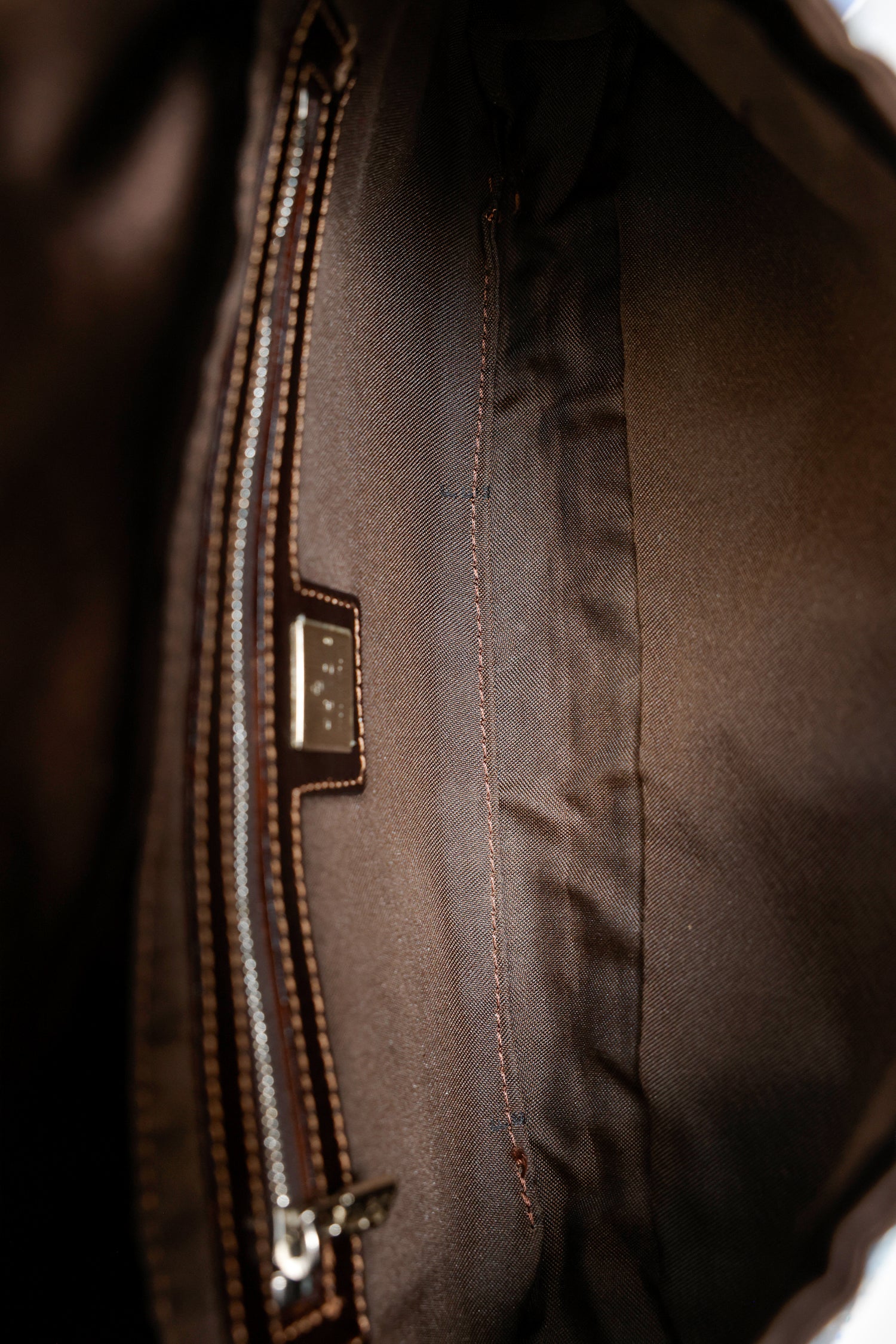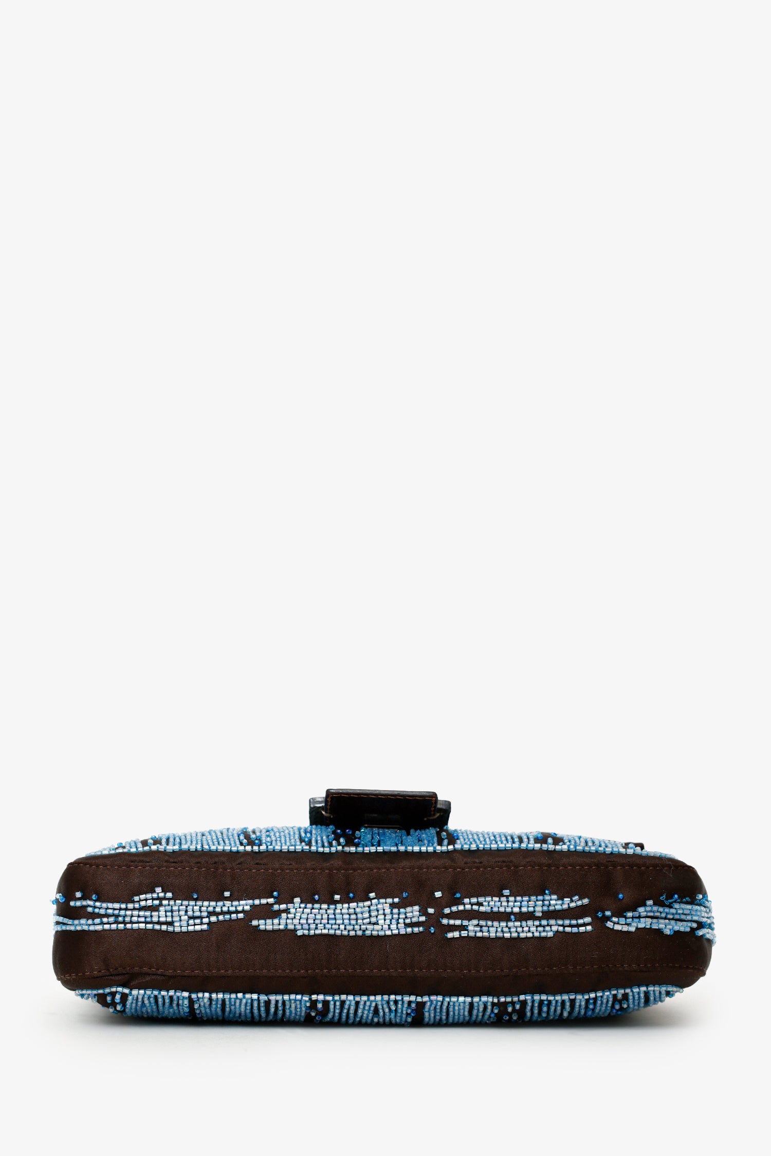 Fendi Brown/Blue Satin Beaded Baguette Shoulder Bag. Front-fold-over-flap with snap-button-up closure. Shoulder strap with adjustable pull-through buckle closure. Lined interior with single rear zip-up pocket. Silver-tone hardware. Contrast and tonal stitching.