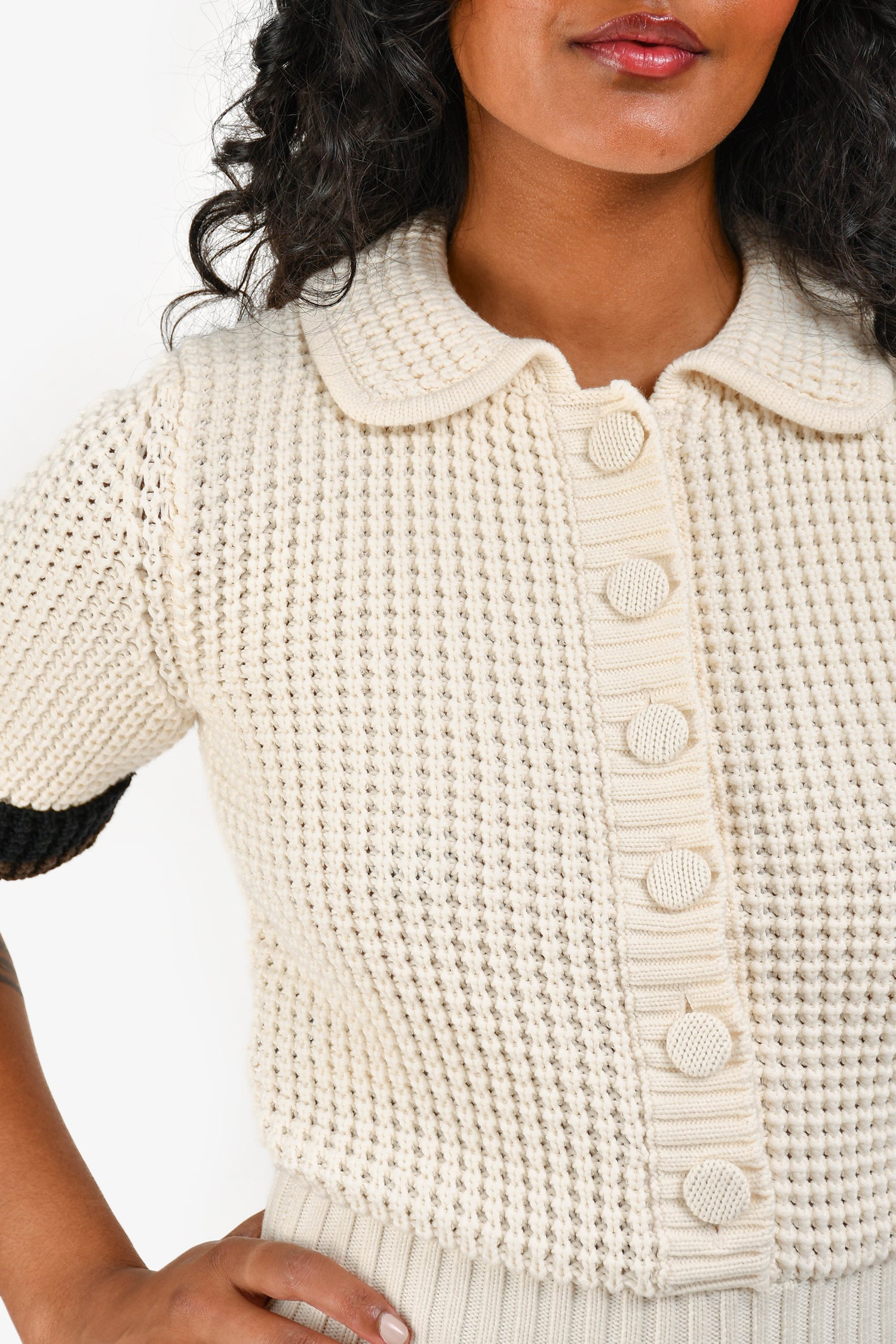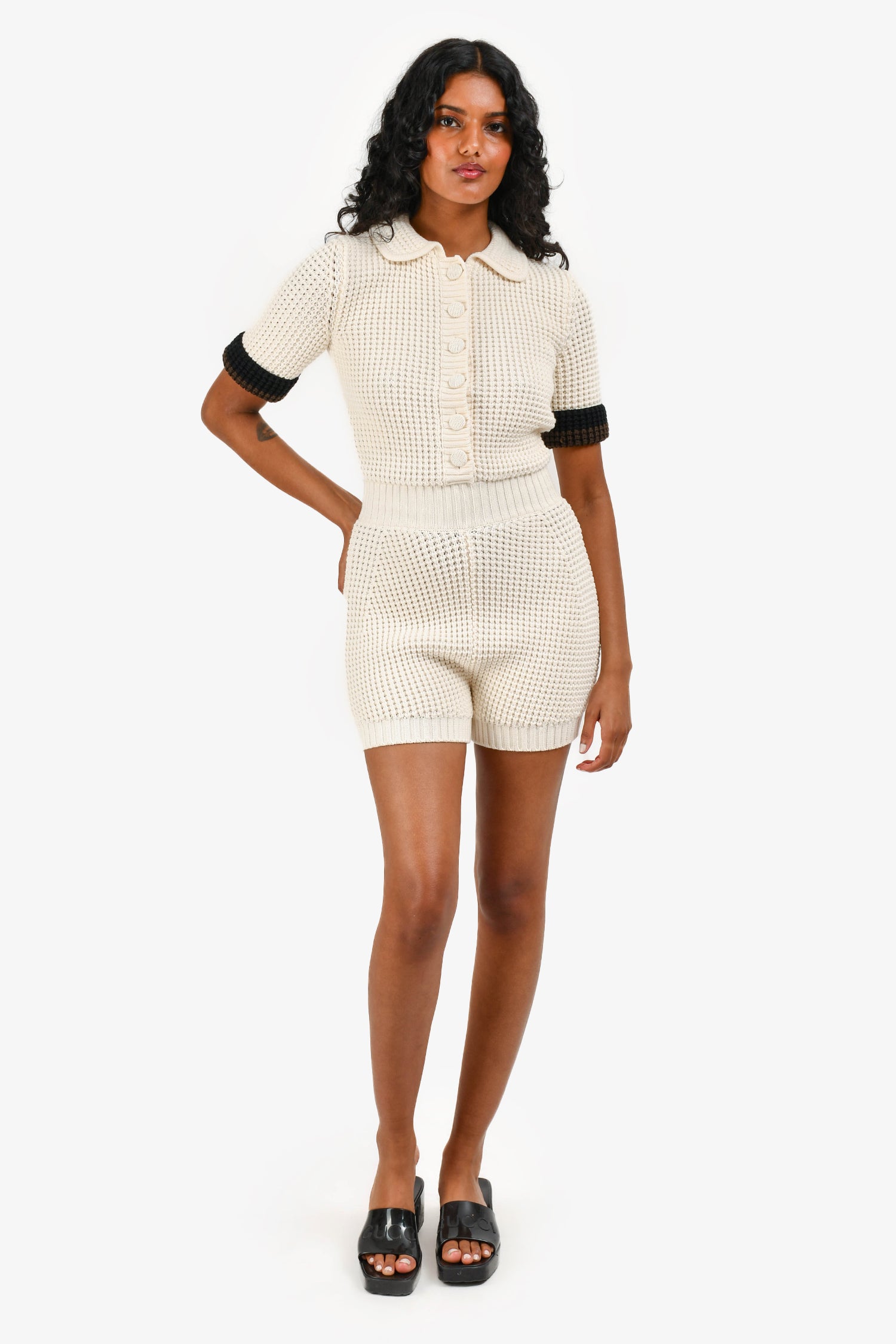Refresh availabilityFendi Cream Cotton Blend Knit Short Sleeve Playsuit. Collar neckline. Front half button closure. Short sleeves. Elasticized waist. Tonal stitching.