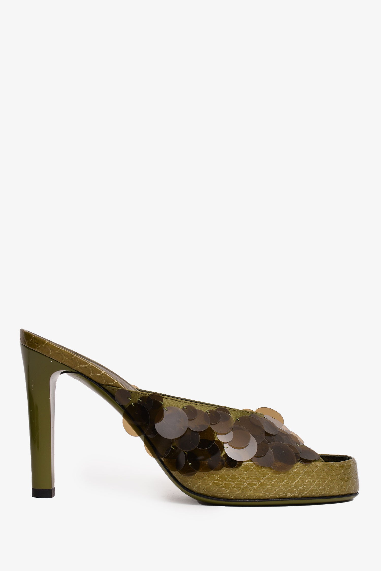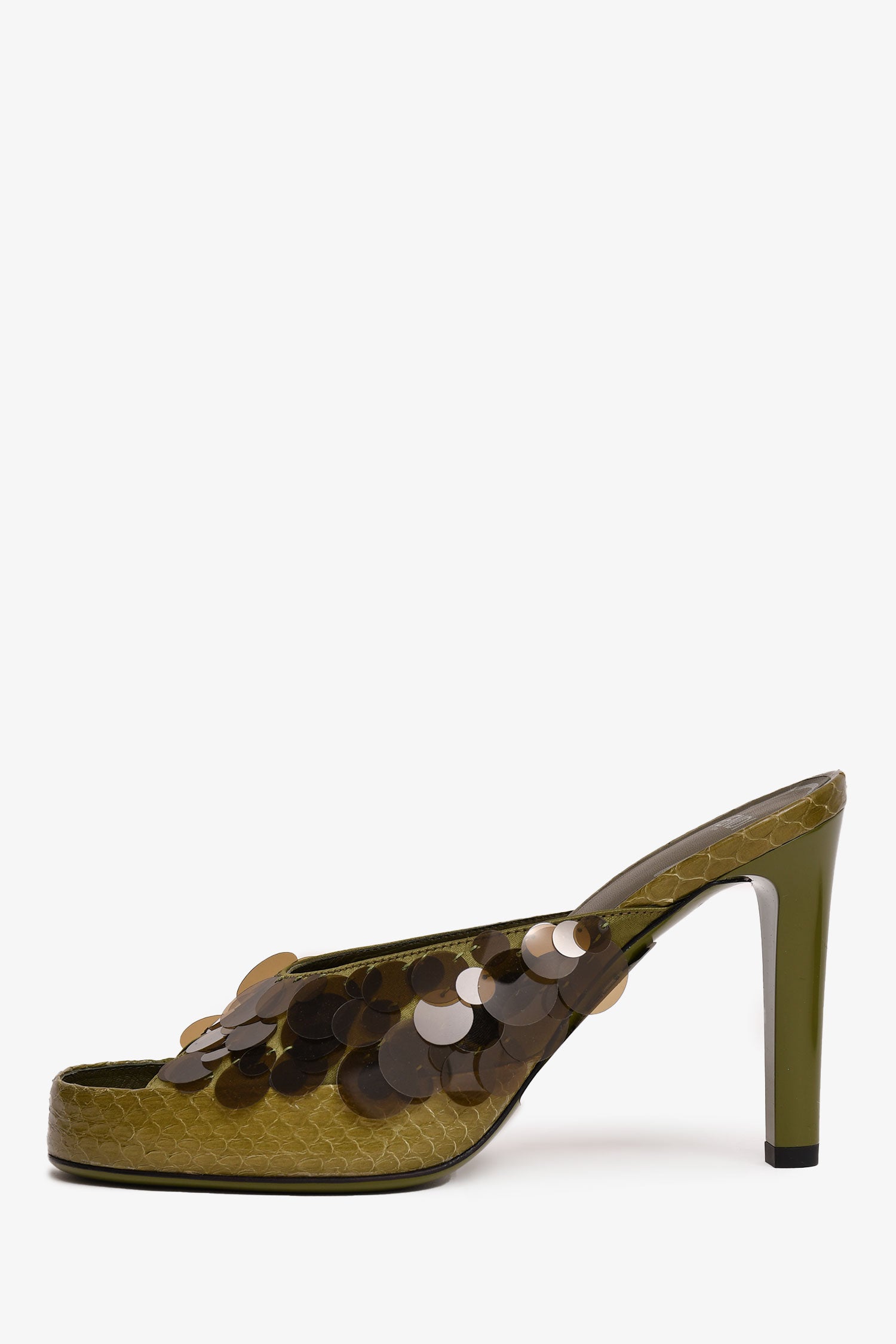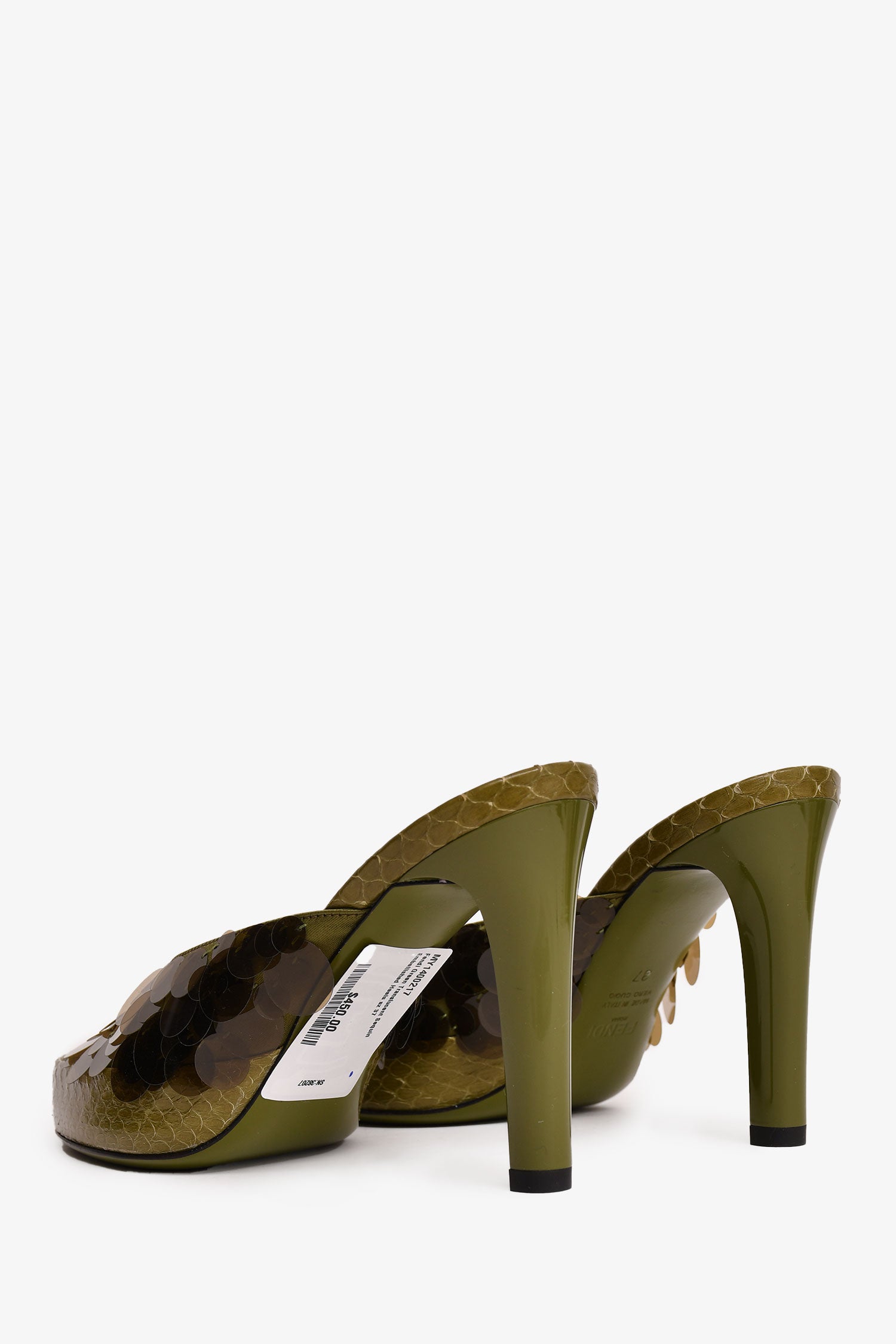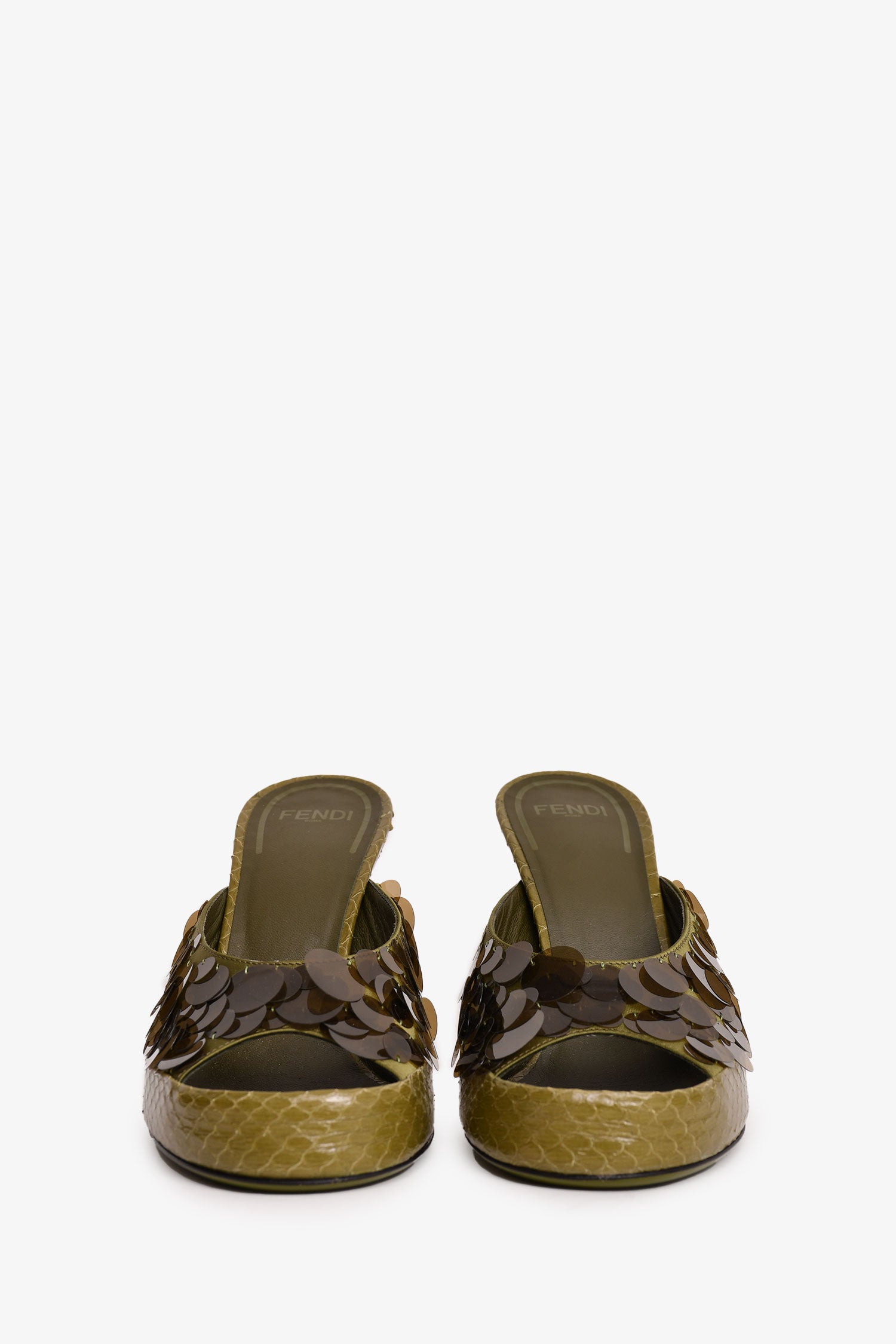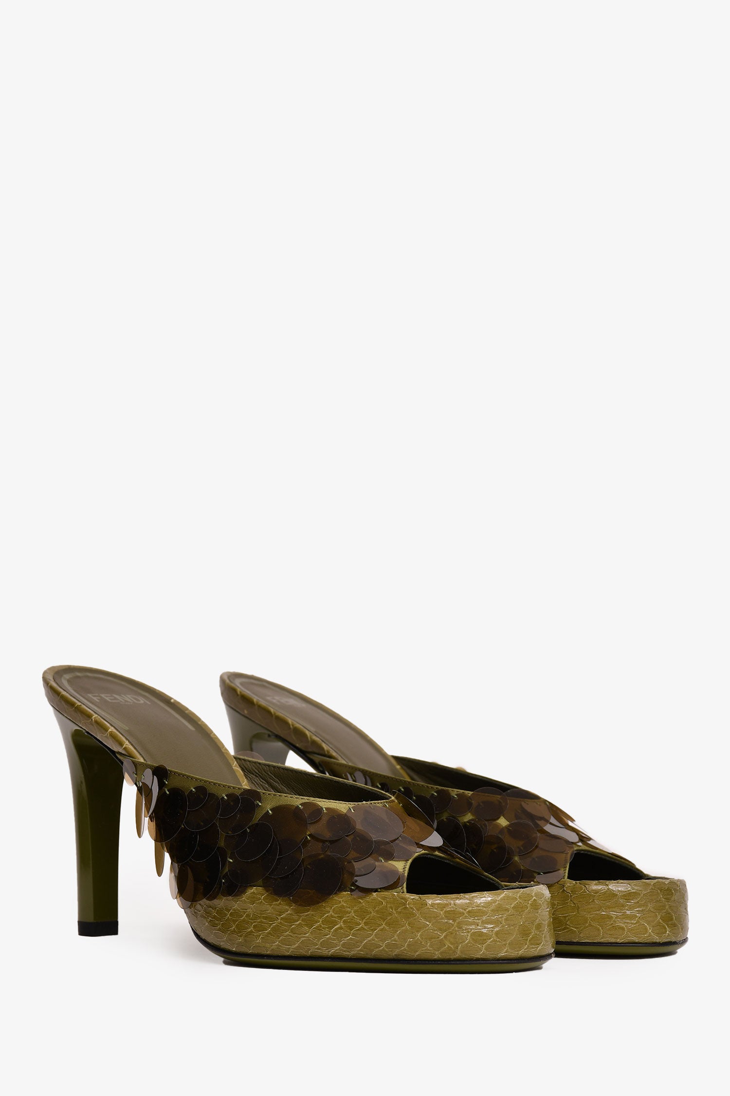Refresh availabilityFendi Green Translucent Sequin Embellished Heels. Slip-on. Open toe.
