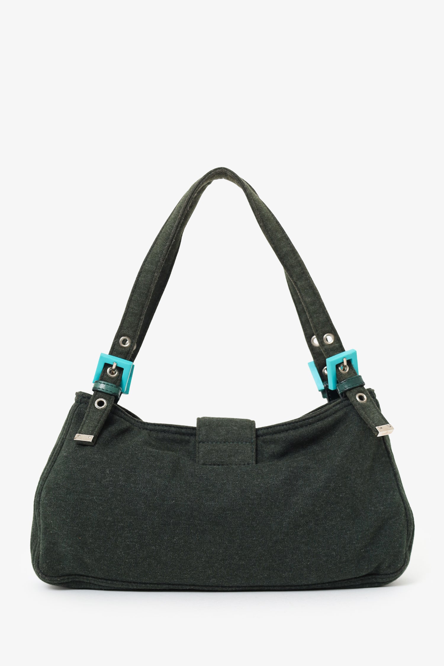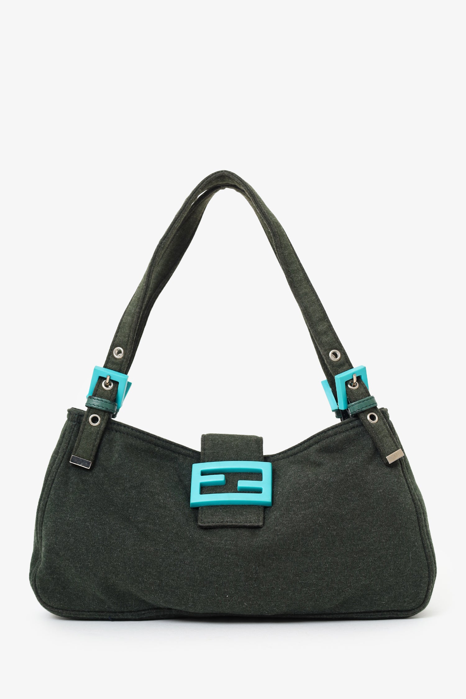 Refresh availabilityFendi Green/Blue Jersey Double Strap Mama Baguette Bag. Front fold-over piece with magnetic snap-button closure. Shoulder straps with adjustable buckle closure. Interior zip pocket. Silver-tone hardware. Tonal stitching.