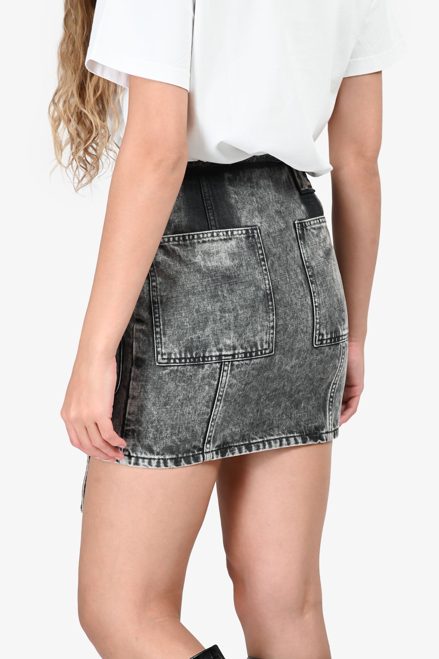 Refresh availabilityFendi Grey Distressed Denim Mini Skirt. Slip-on. Front zip closure. 2 front pockets with fold-over flap and strap closure. Unlined. Silver-tone hardware. Tonal stitching.