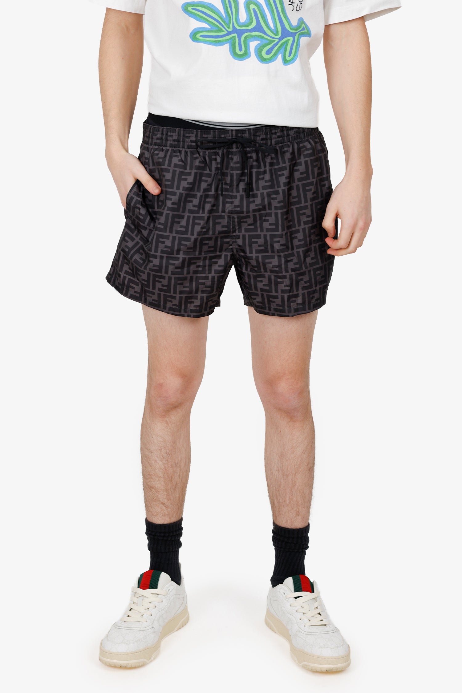 Refresh availabilityFendi Grey FF Zucca Print Swim Shorts. Elasticated waistband with drawstring closure. 2 exterior side slip pockets. Partial-lined interior. Tonal stitching.