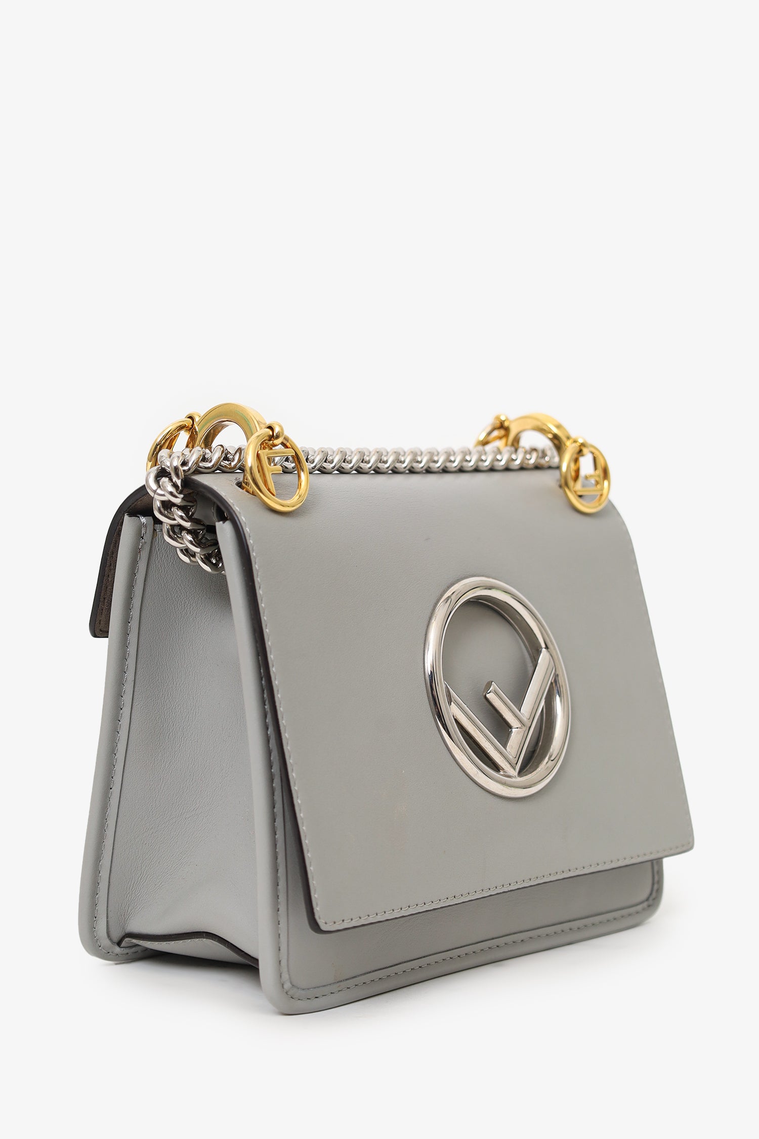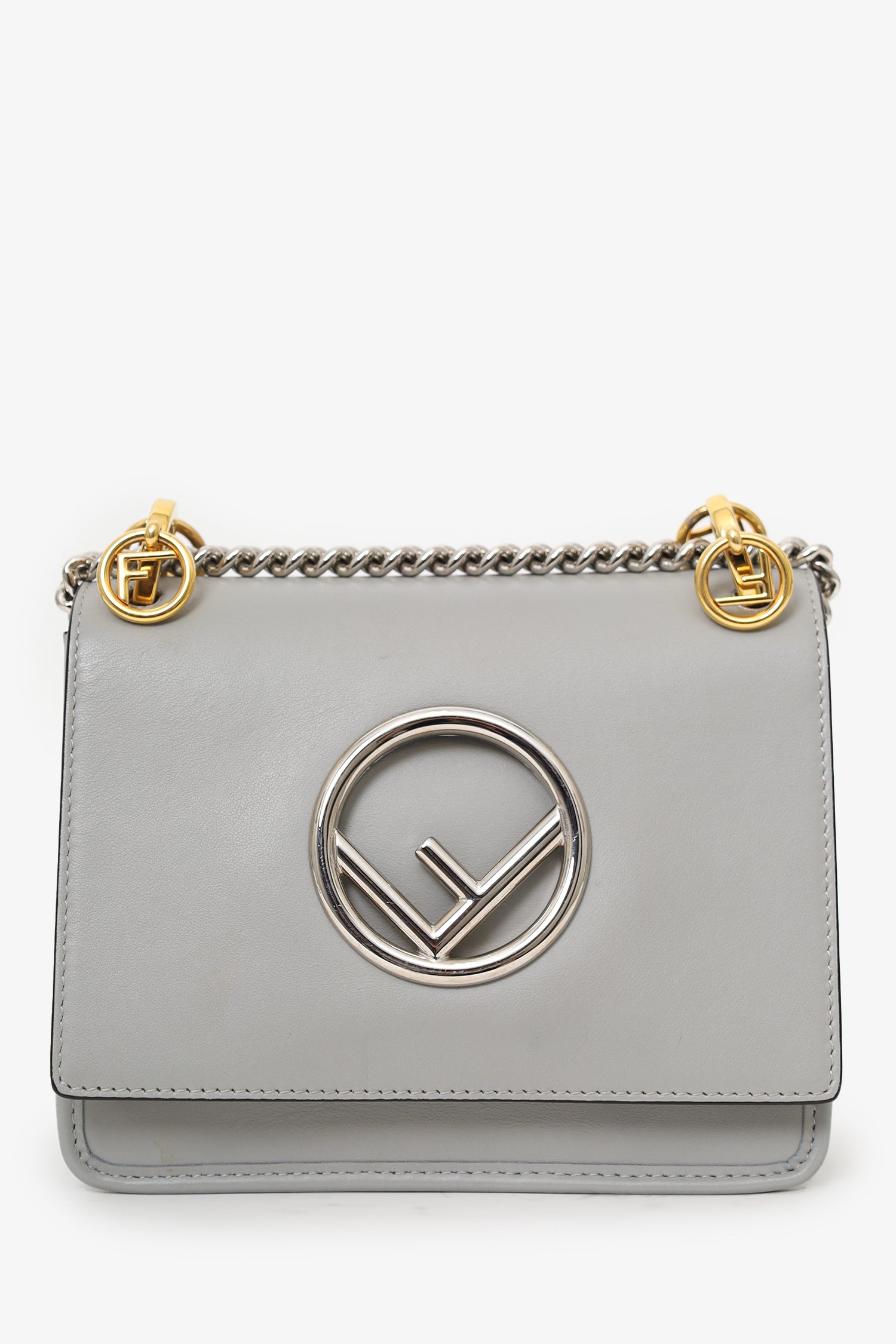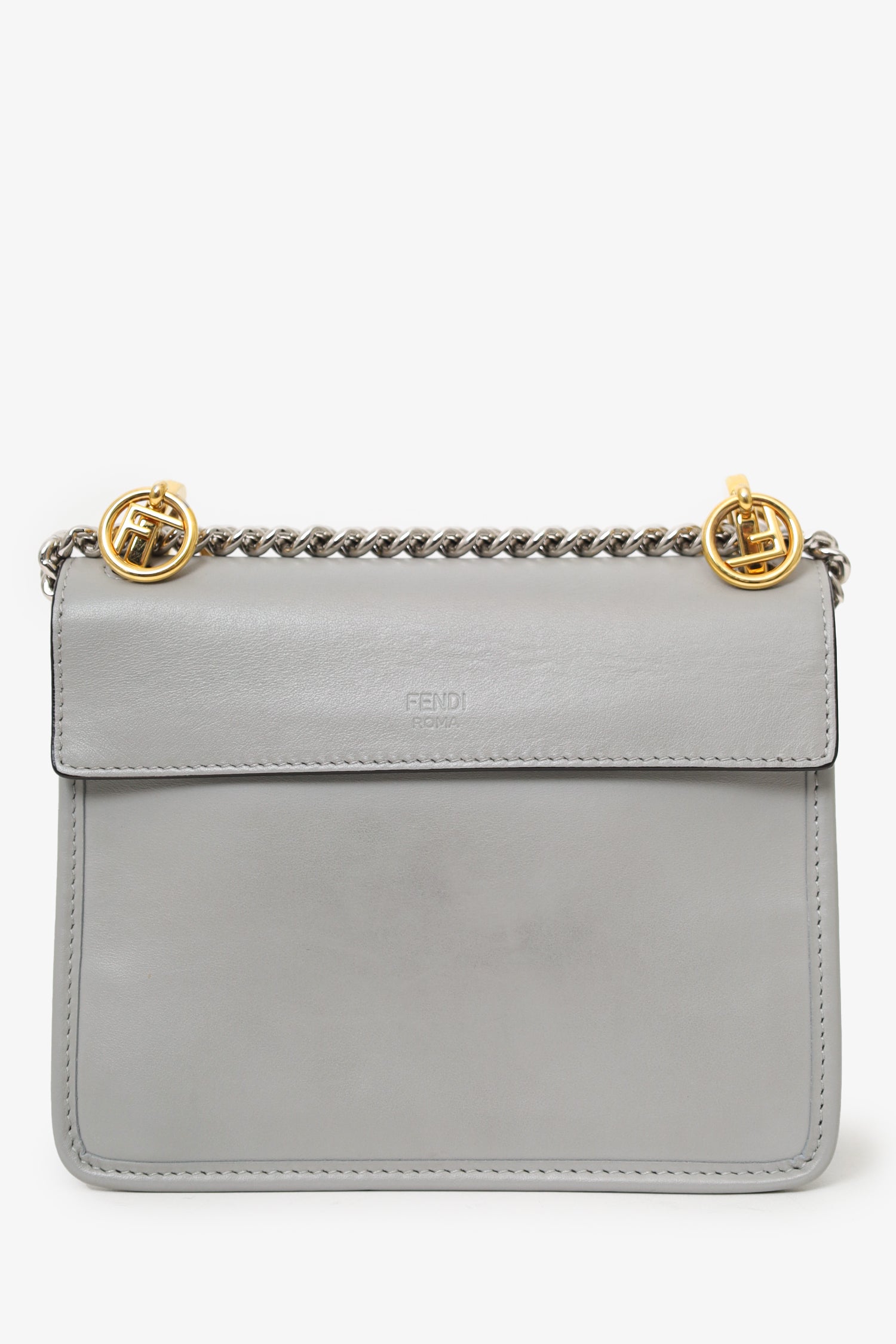 Refresh availabilityFendi Grey Leather Small Kan I Flap Shoulder Bag. Front fold-over flap with magnetic closure. Single crossbody chain strap with push-pin closure. Suede-lined interior. Single interior slip pocket. Silver and gold-tone hardware. Tonal stitching.