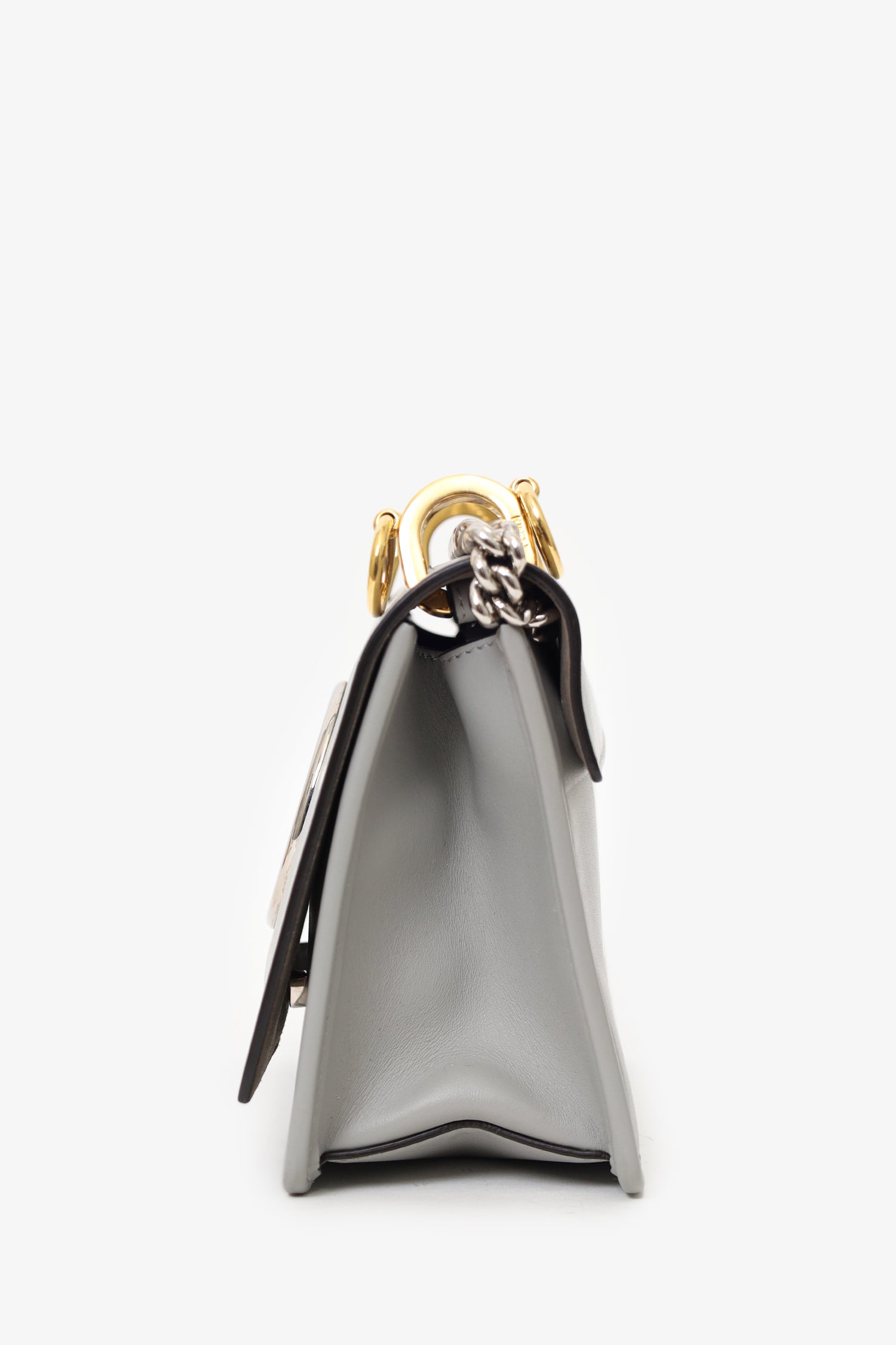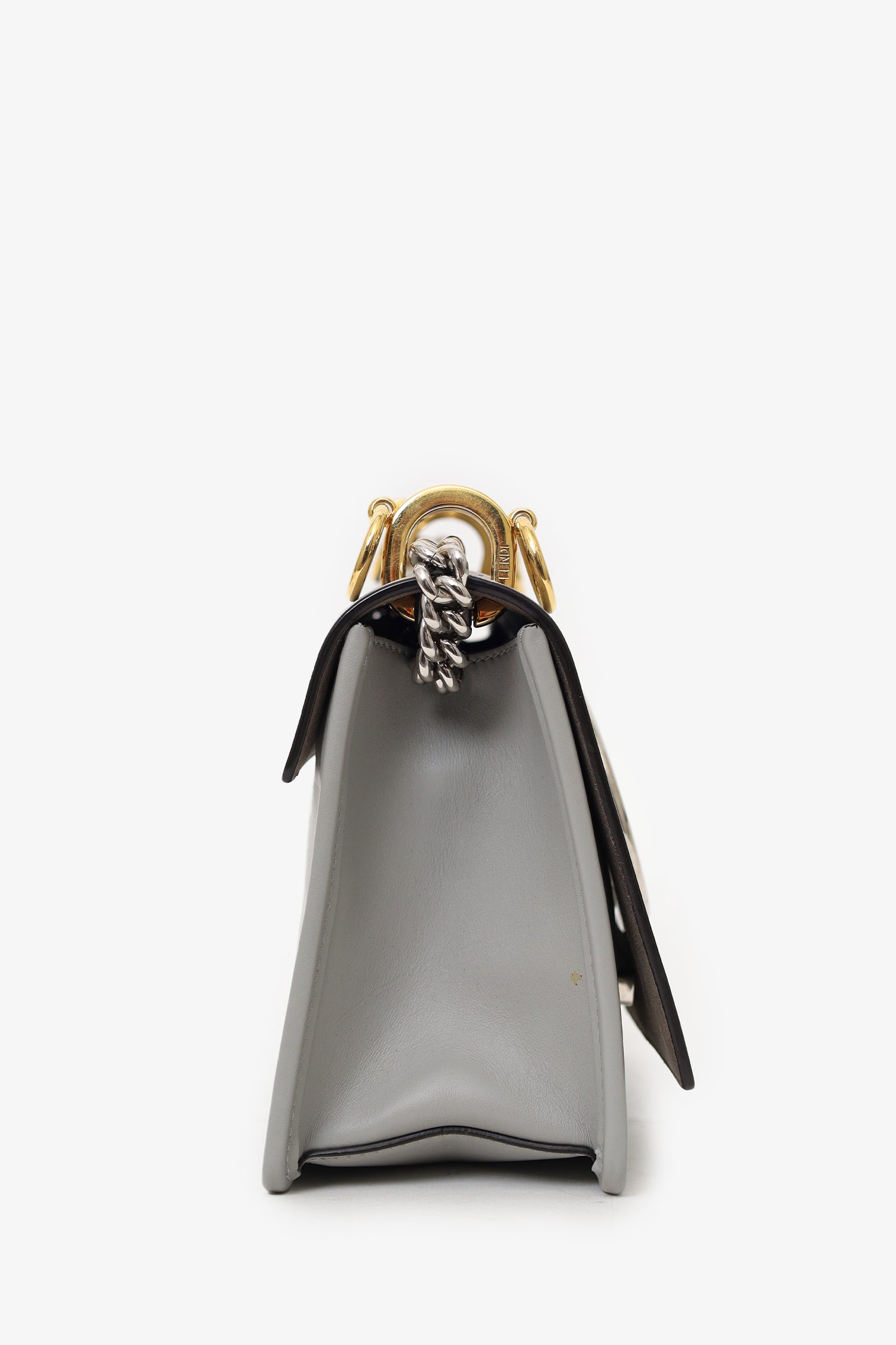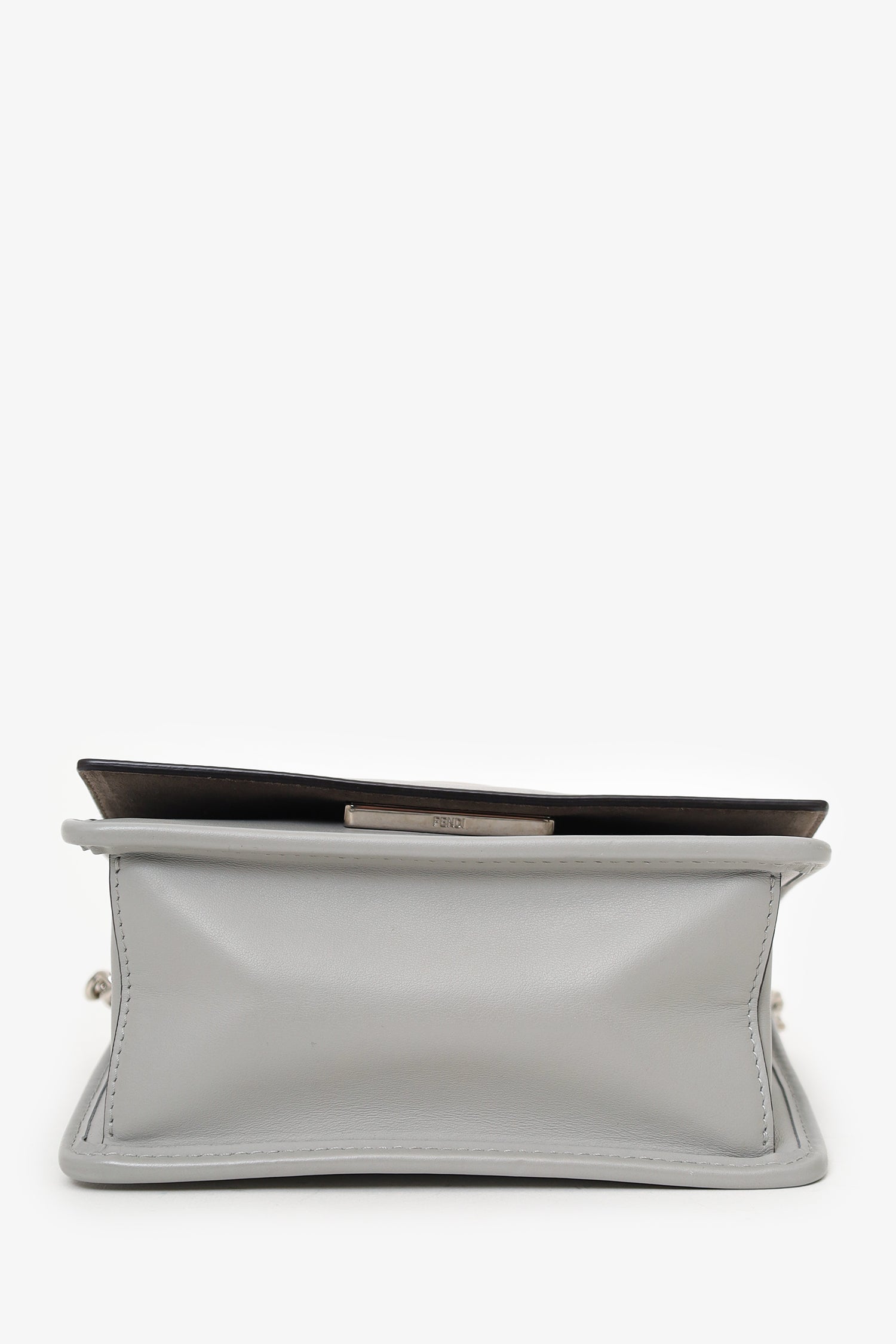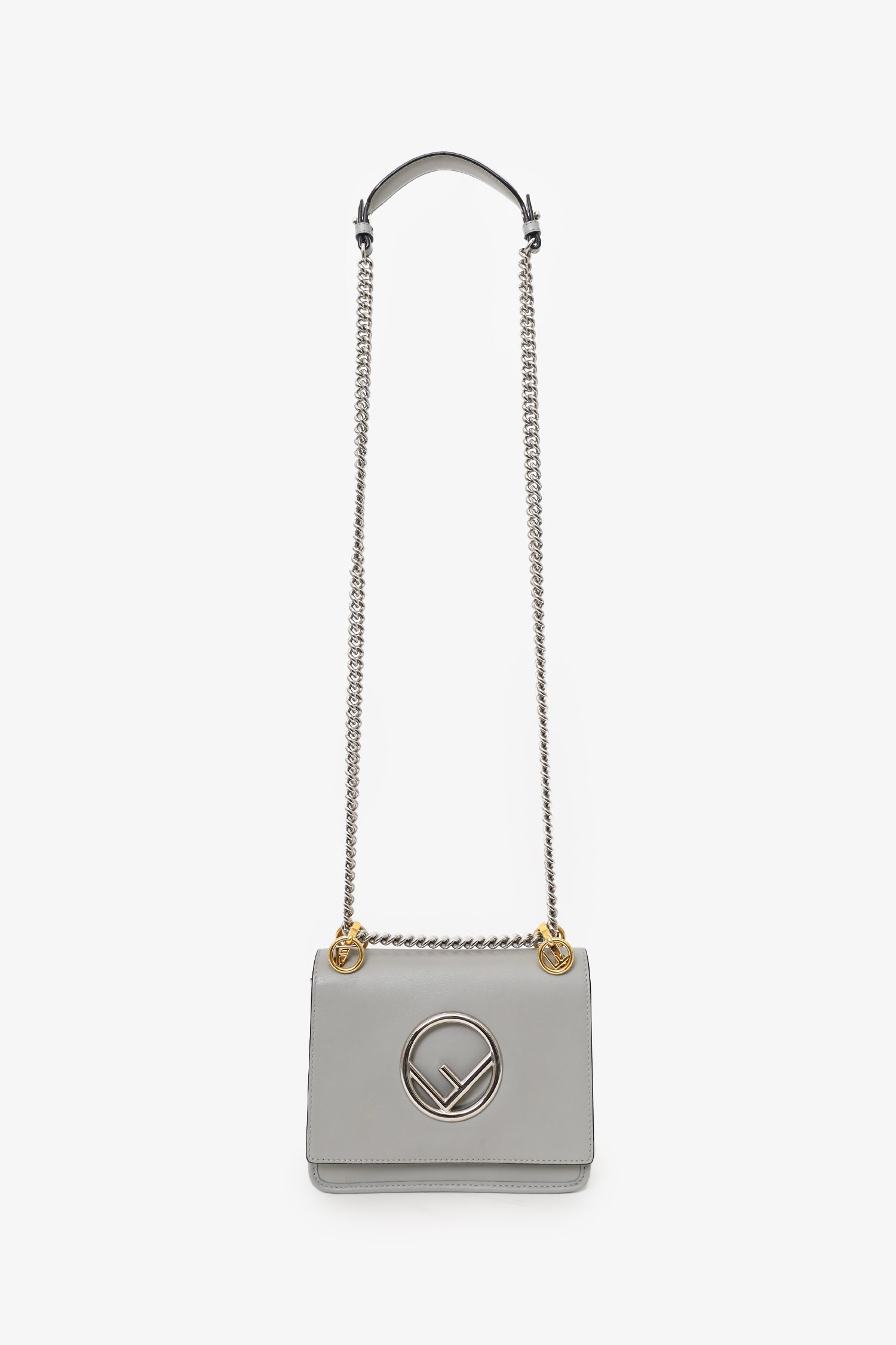 Refresh availabilityFendi Grey Leather Small Kan I Flap Shoulder Bag. Front fold-over flap with magnetic closure. Single crossbody chain strap with push-pin closure. Suede-lined interior. Single interior slip pocket. Silver and gold-tone hardware. Tonal stitching.