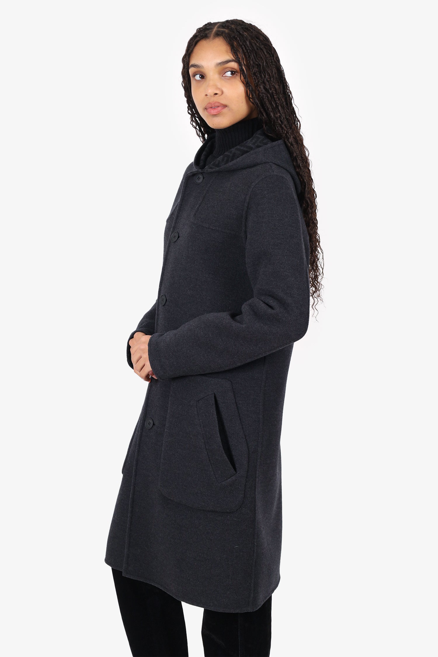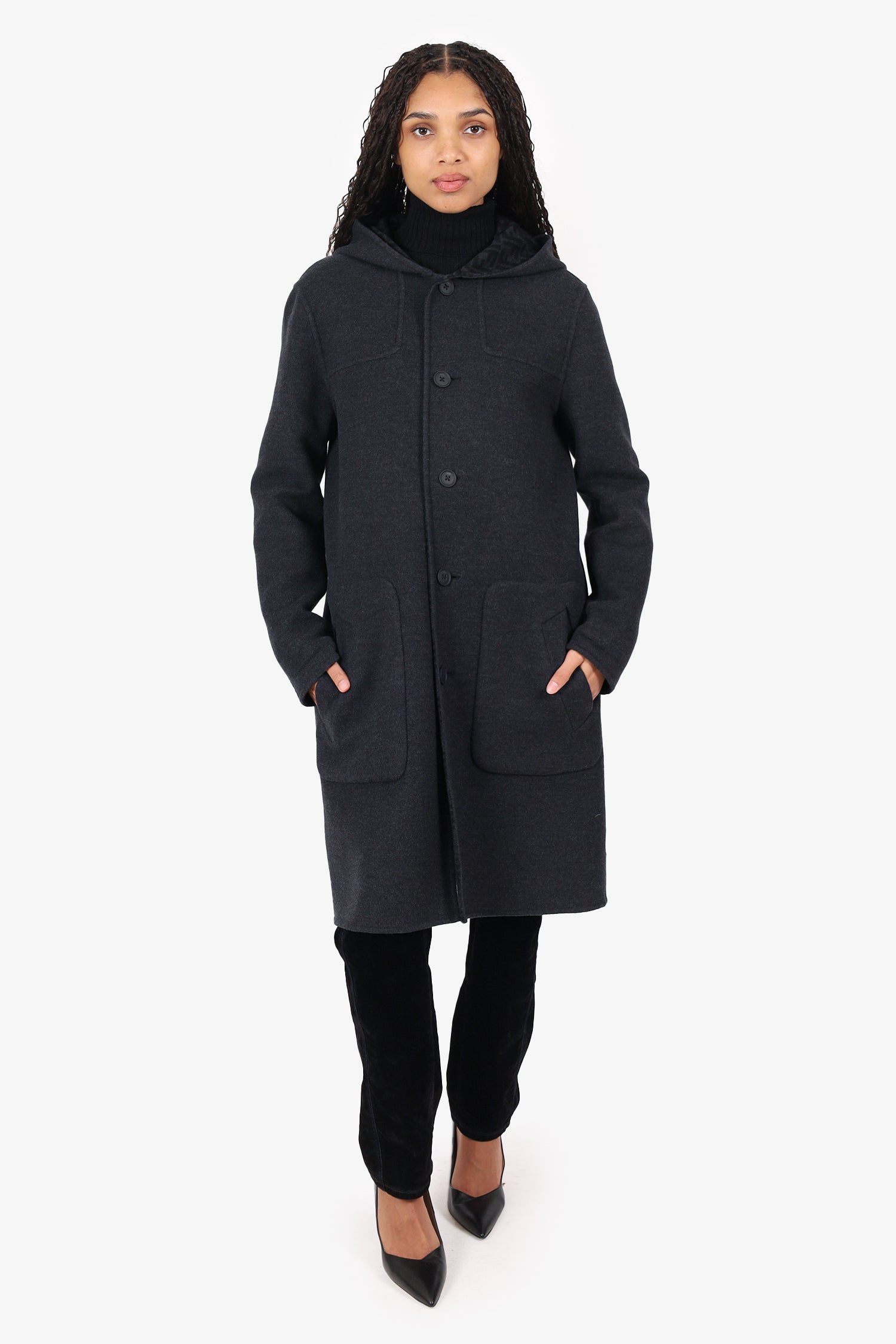 Refresh availabilityFendi Grey Wool Montgomery Reversible Logo-Print Coat. Pull-on. Collared neckline. Front button-up closure. 2 exterior side slip pockets and 2 interior slip pockets. Tonal stitching.
