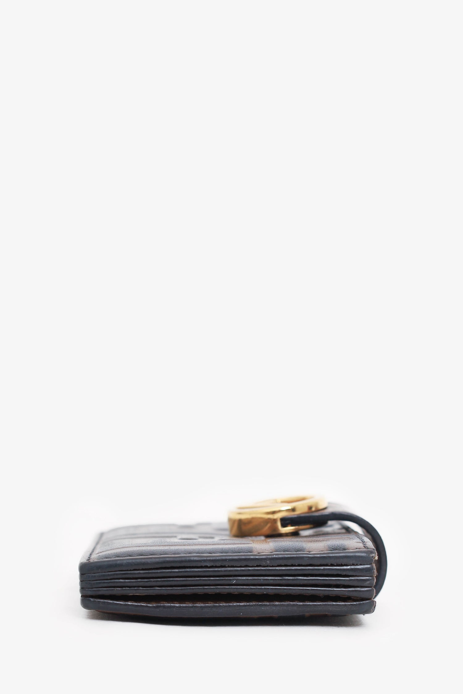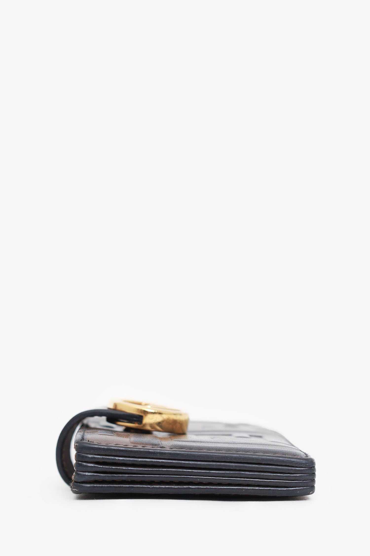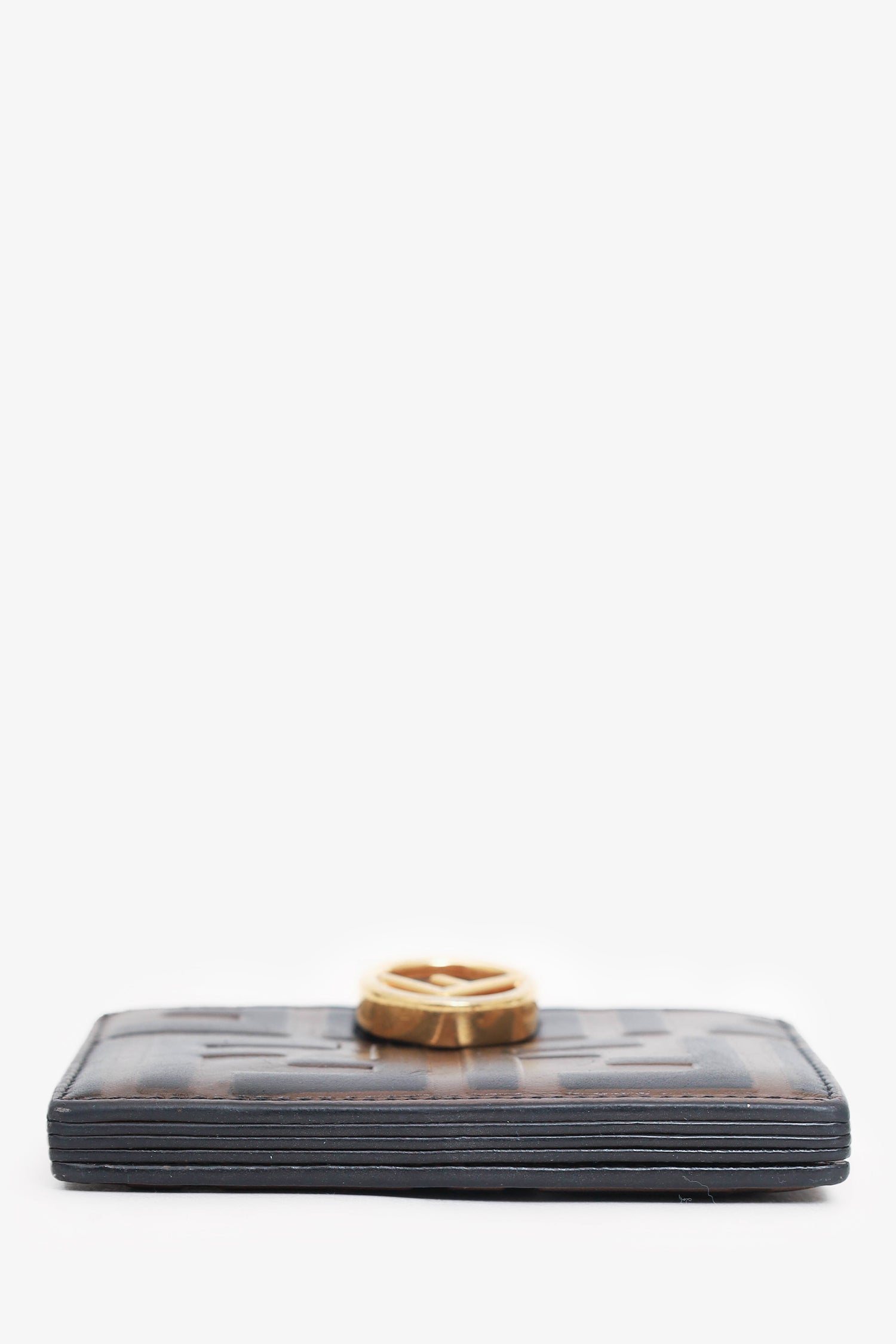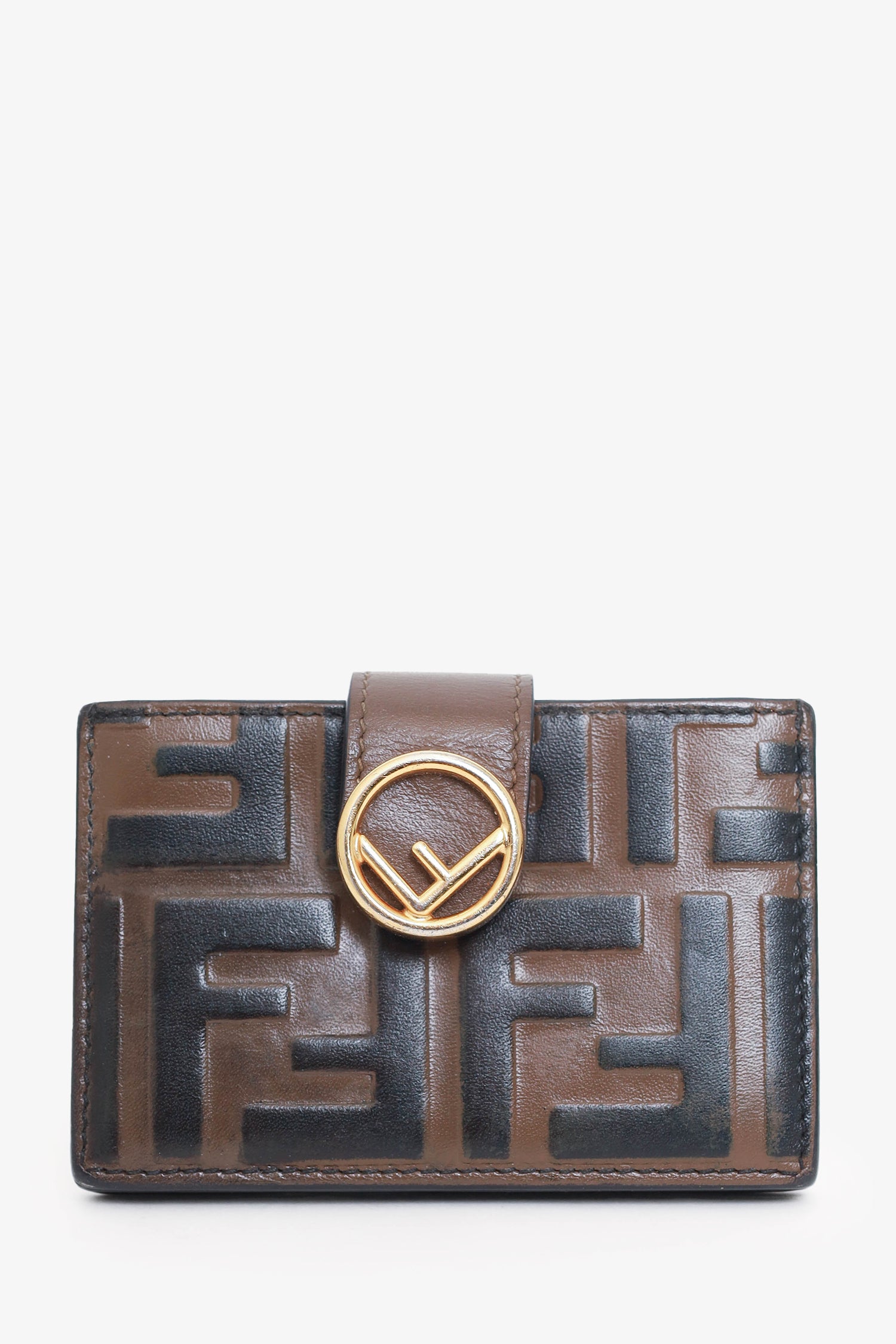 Refresh availabilityFendi Leather Zucca Print Embossed Cardholder. Front-over strap with button closure. 5 interior compartments. Gold-tone hardware. Tonal stitching.
