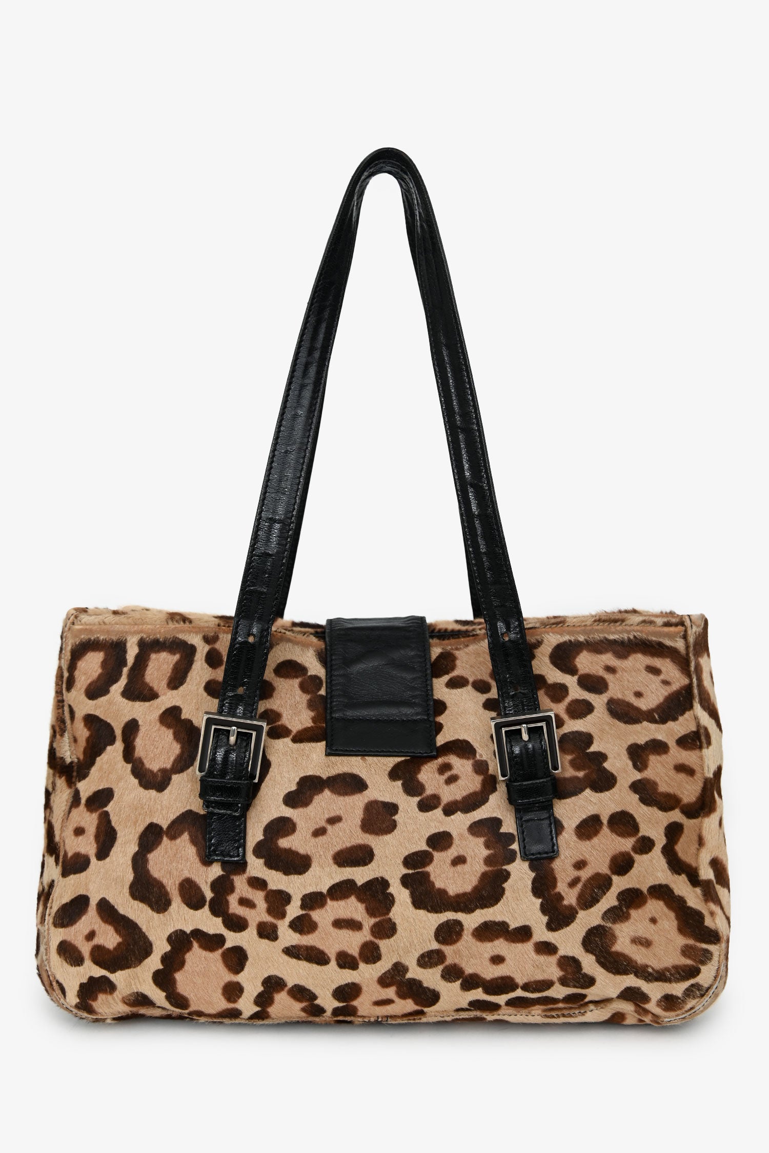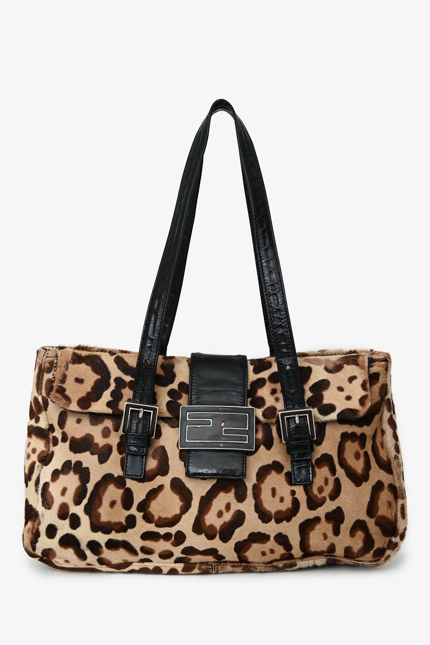 Refresh availabilityFendi Leopard Print Ponyhair Mamma Baguette Handle Bag. Front fold-over strap with a snap closure. Dual shoulder straps. 3 interior compartments and 1 wall zip. Silver-tone hardware. Tonal stitching.