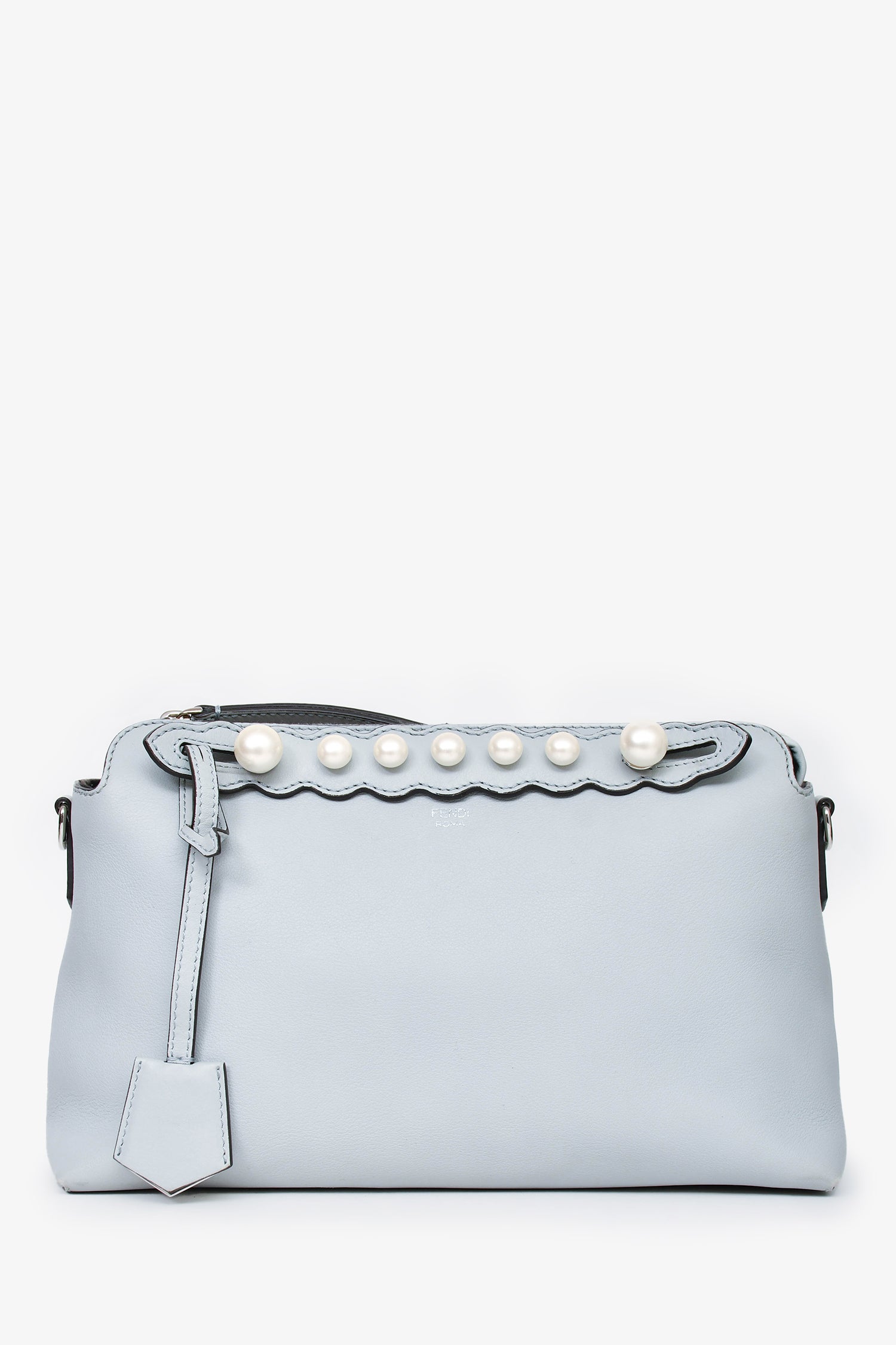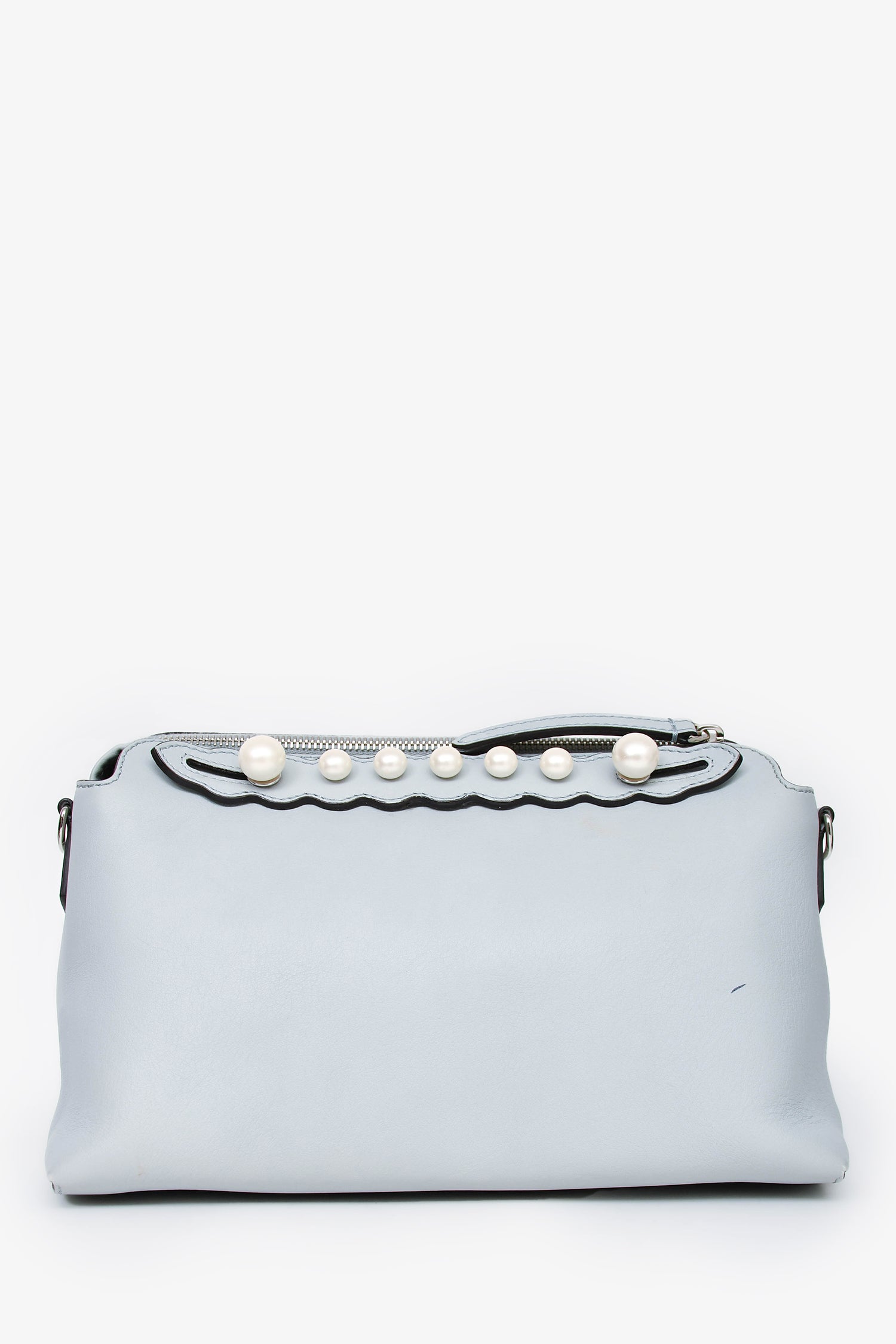 Refresh availabilityFendi Light Blue Leather Faux Pearl Embellished By The Way Bag. Top flap with zip closure. 2 interior compartments separated by single zip pocket. 2 wall slip pockets. Removable crossbody strap. Silver-tone hardware. Tonal stitching.