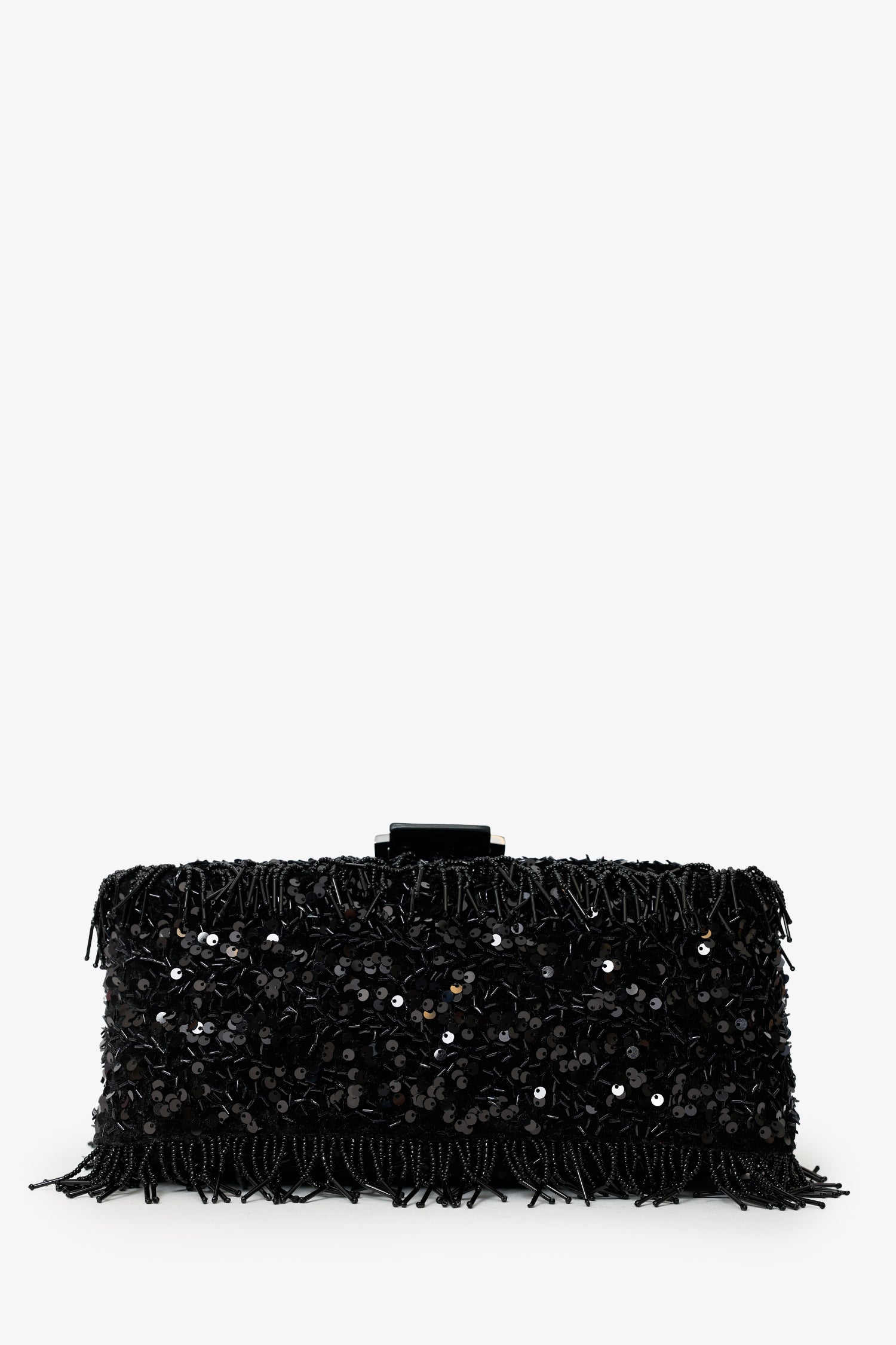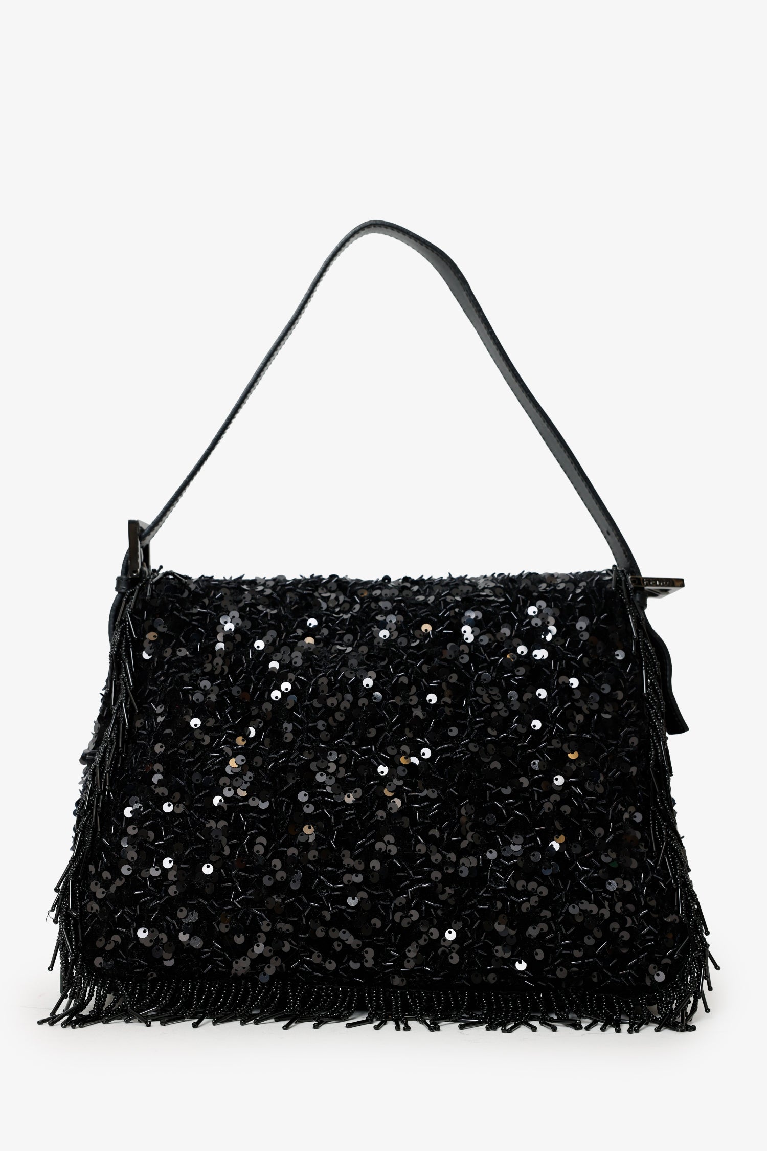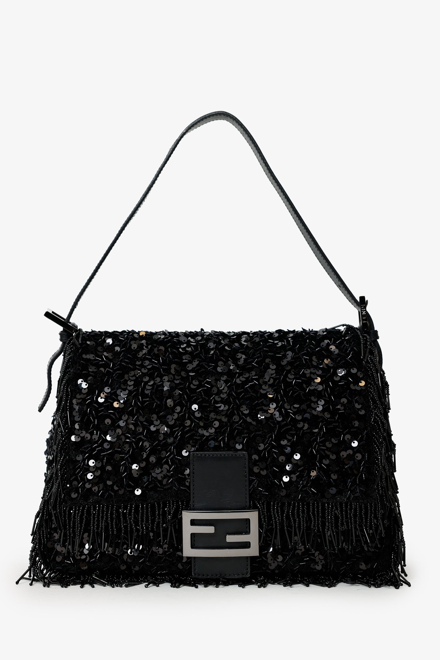 Refresh availabilityFendi Limited Edition (1/30) Black Sequin Beaded Fringed Mama Baguette Shoulder Bag. Front-fold-over-flap with snap-button-up closure. Shoulder strap with adjustable pull-through buckle closure. Lined interior with single rear zip-up pocket. Gunmetal-tone hardware. Tonal stitching.