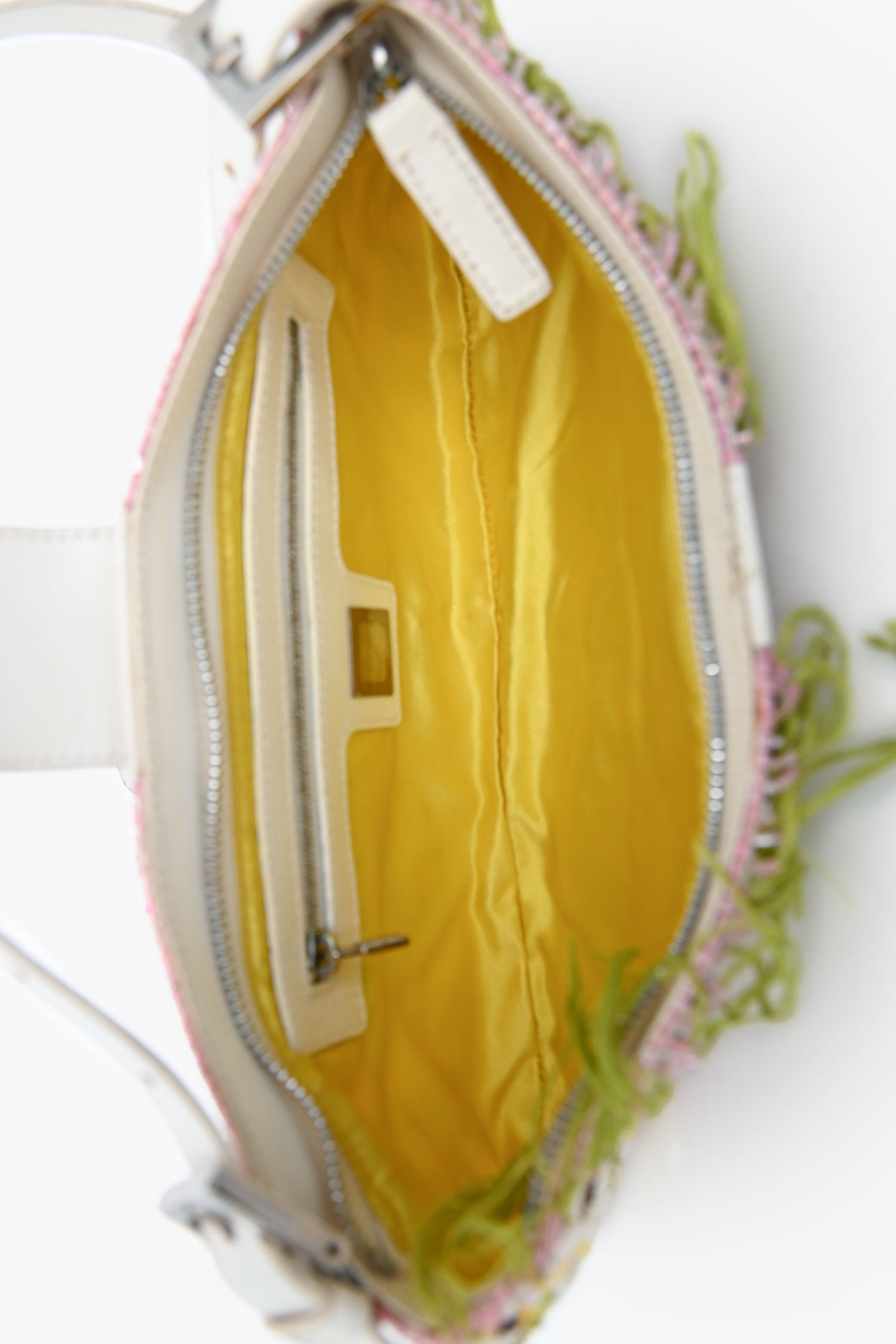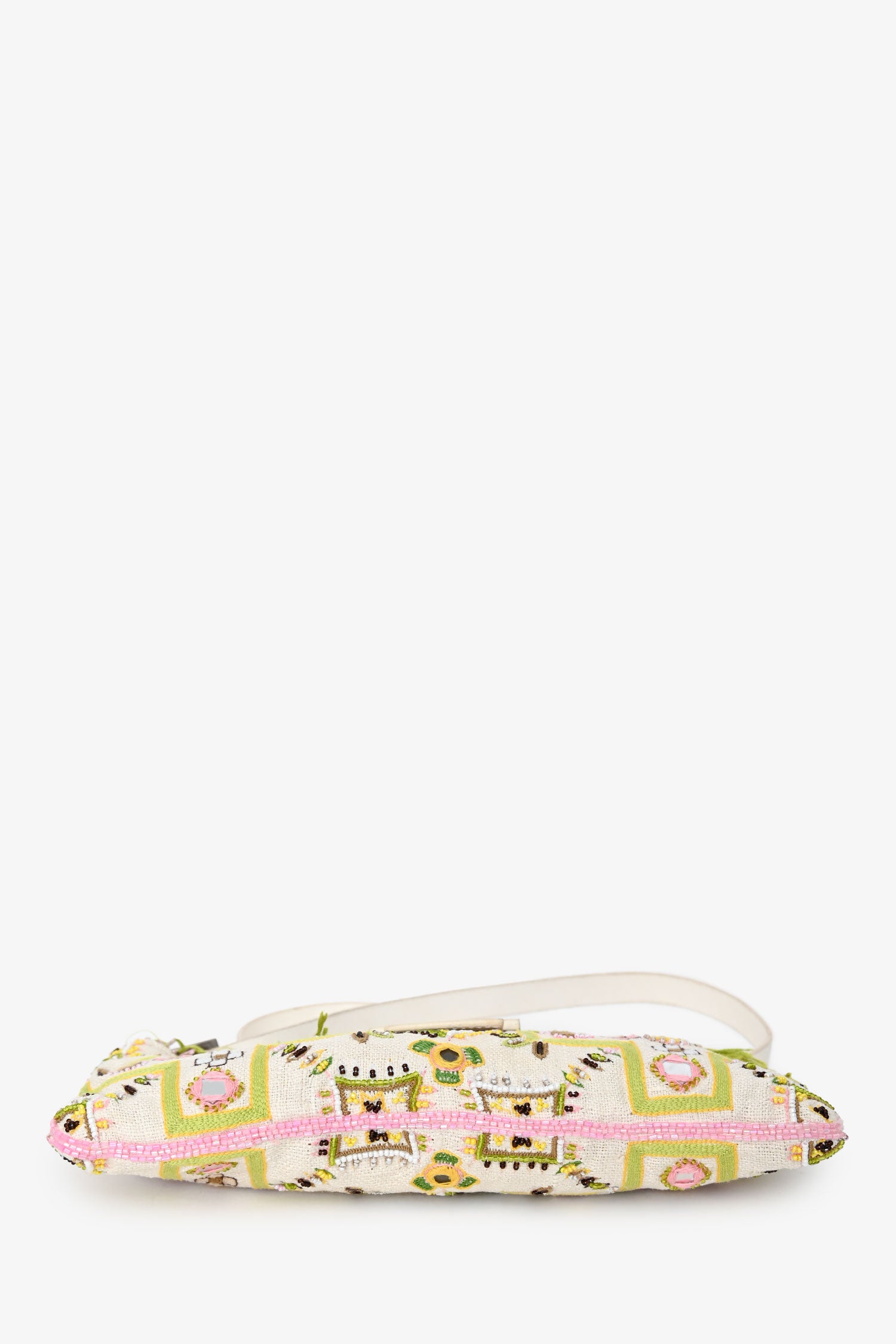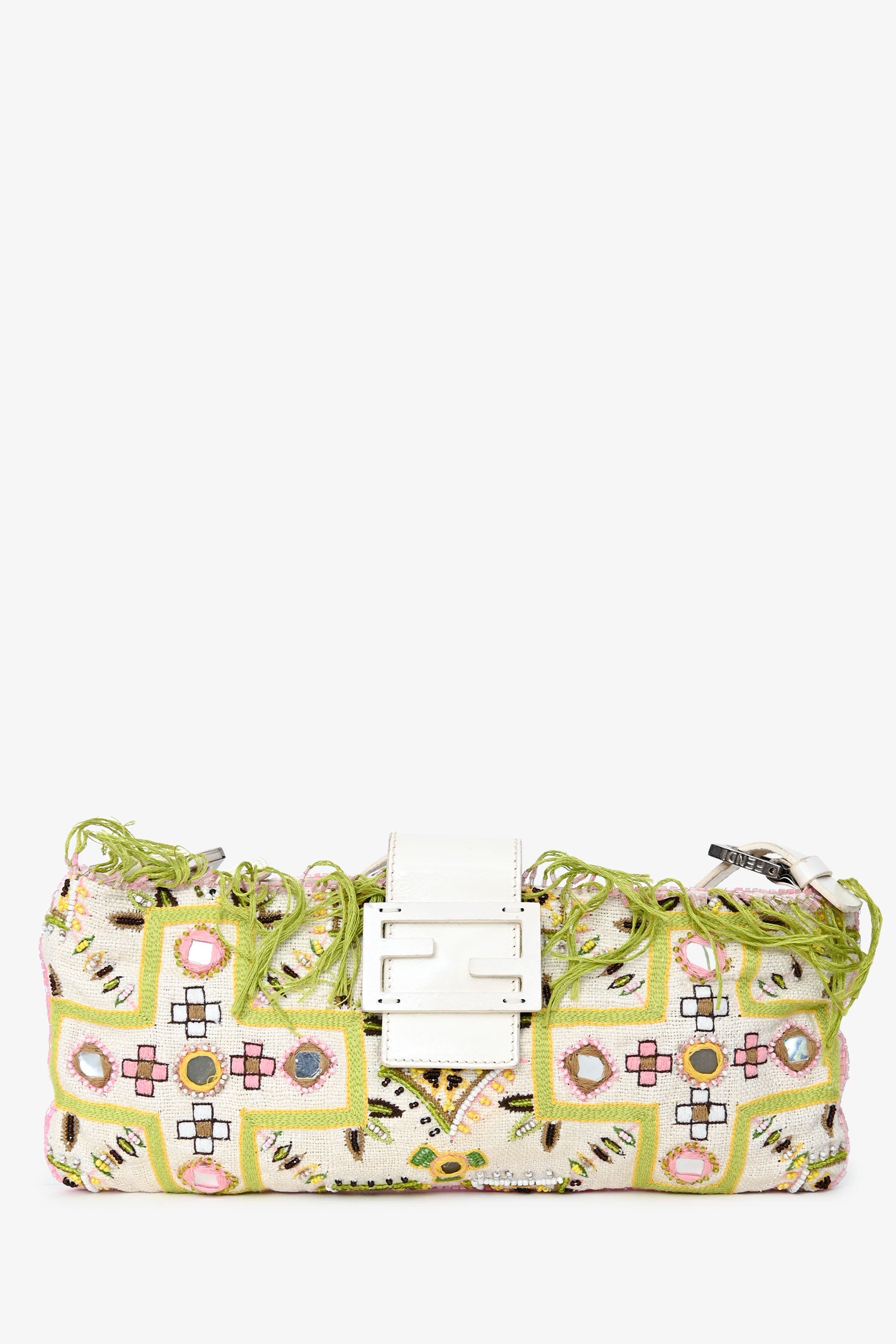 Refresh availabilityFendi Limited Edition White/Green Fringe Beaded Embroidery Baguette Pochette. Fold-over flap with a snap closure. Adjustable shoulder strap. Lined interior with a zip compartment. Silver-tone hardware. Tonal stitching.