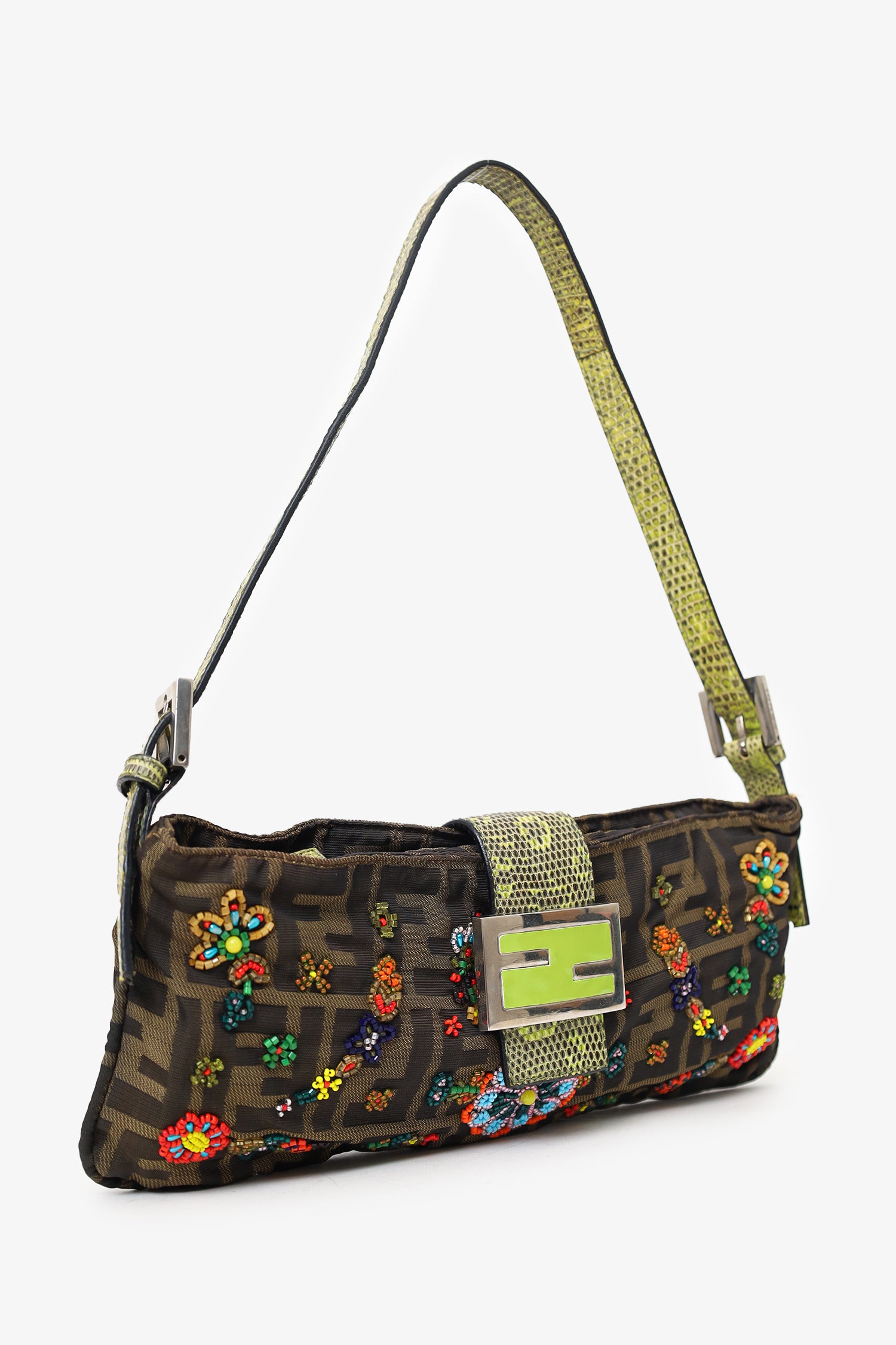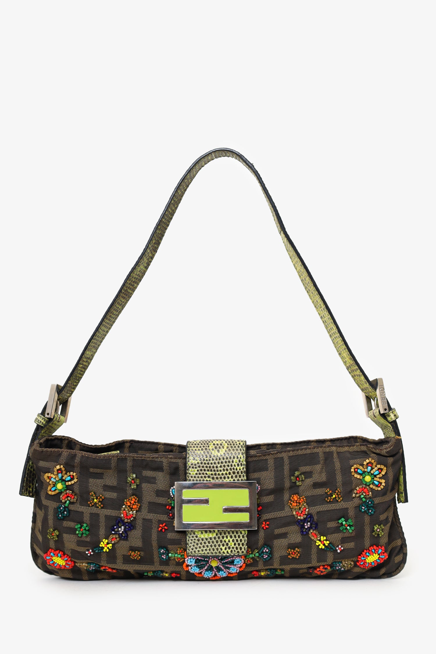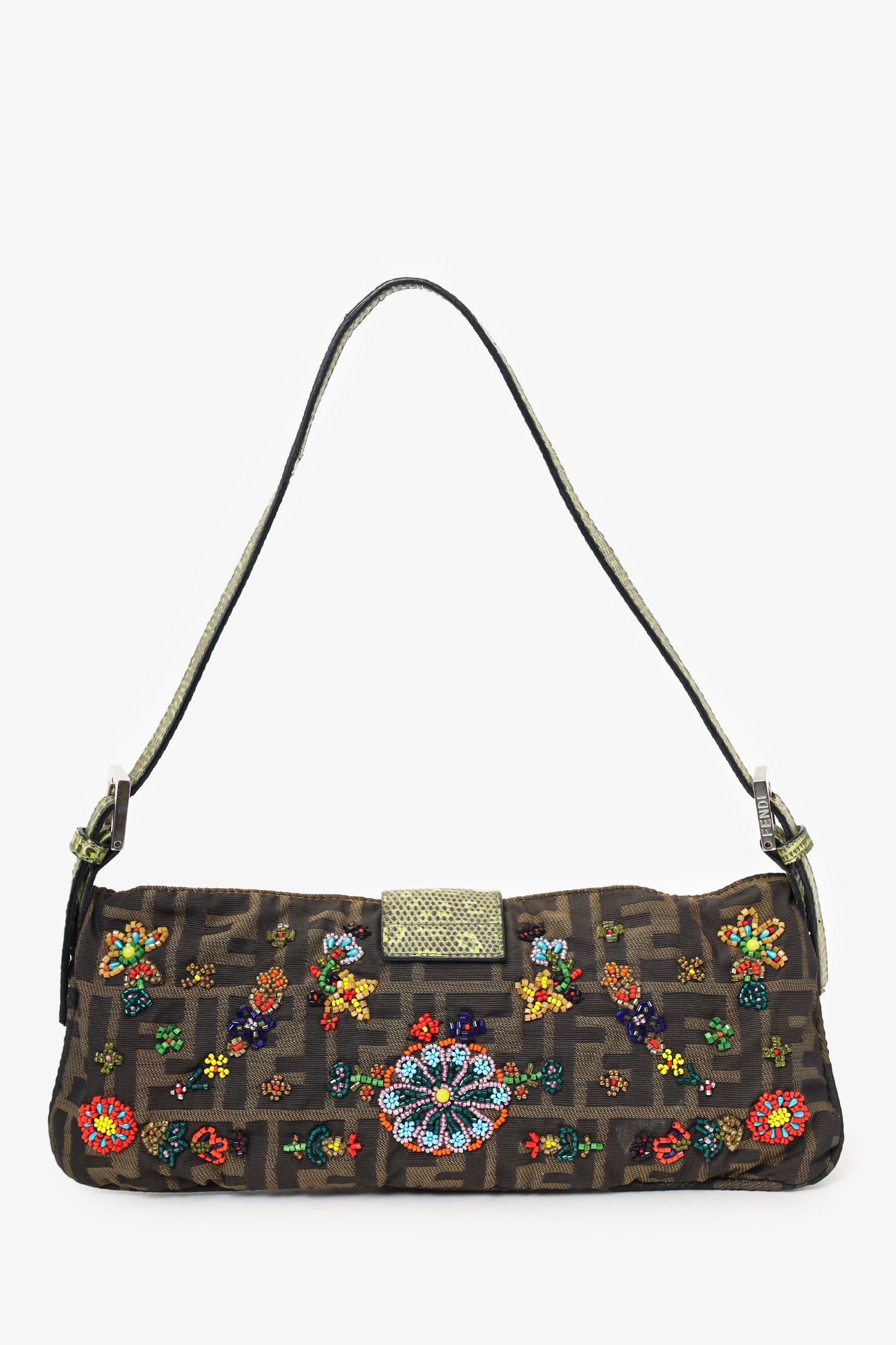 Refresh availabilityFendi Multicolor Floral Beaded Zucca Canvas Lizard Trimmed Shoulder Bag. Front fold-over piece with magnetic snap-button closure. Additional top zip closure. Adjustable shoulder strap with sliding buckle closure. Beaded embellishment throughout exterior. Lined interior. Single interior zip pocket. Silver-tone hardware. Tonal stitching.