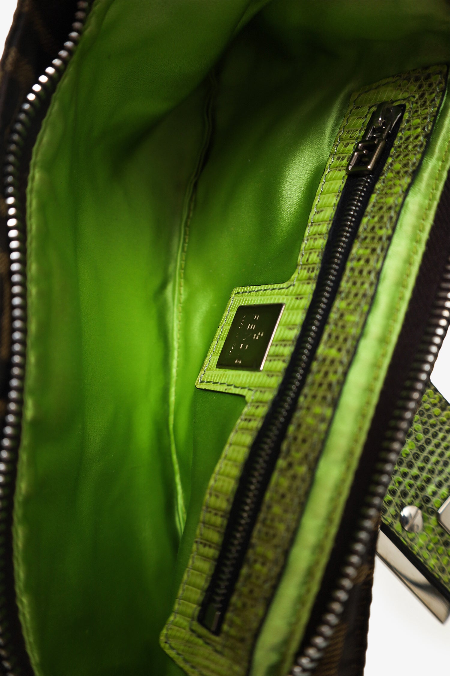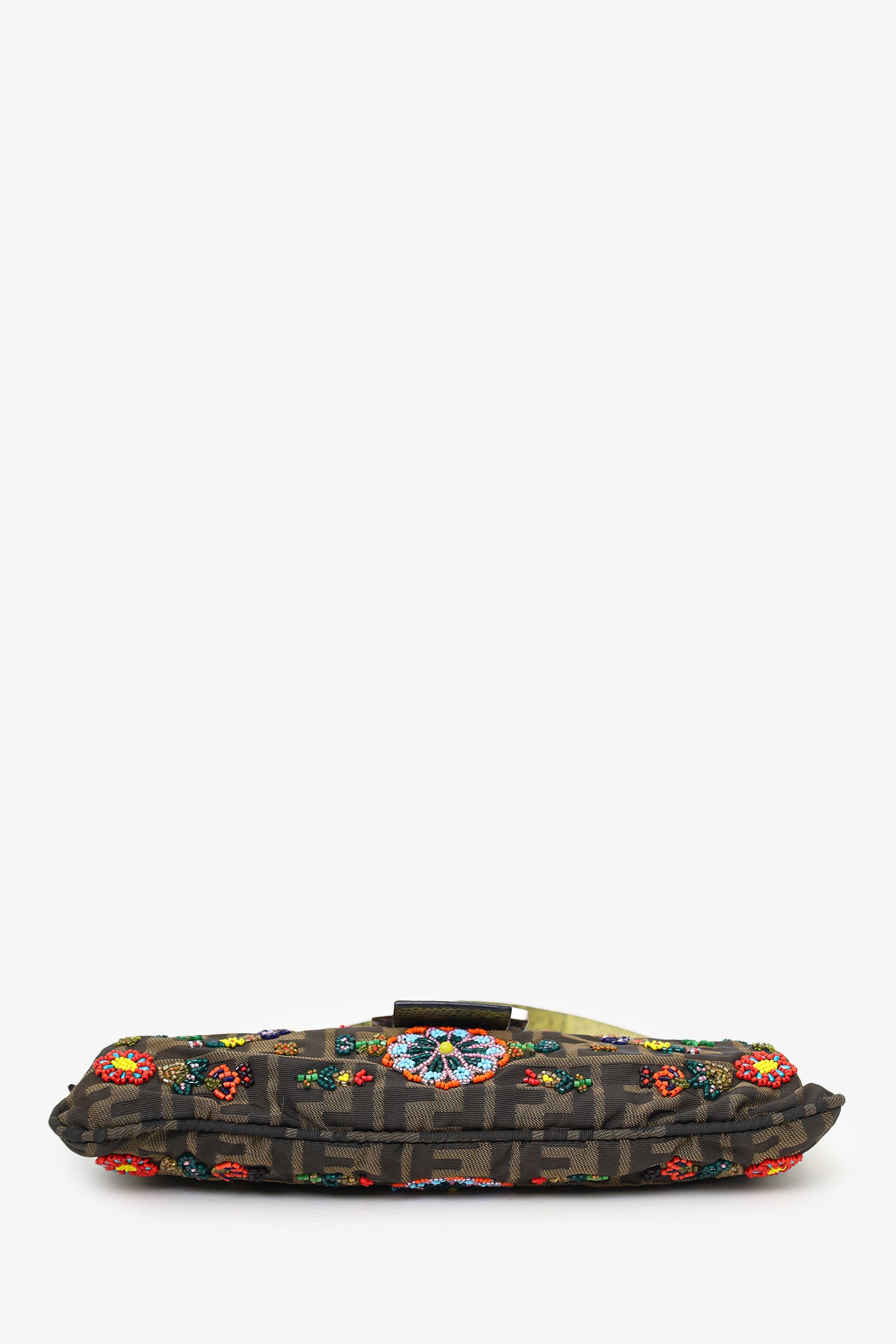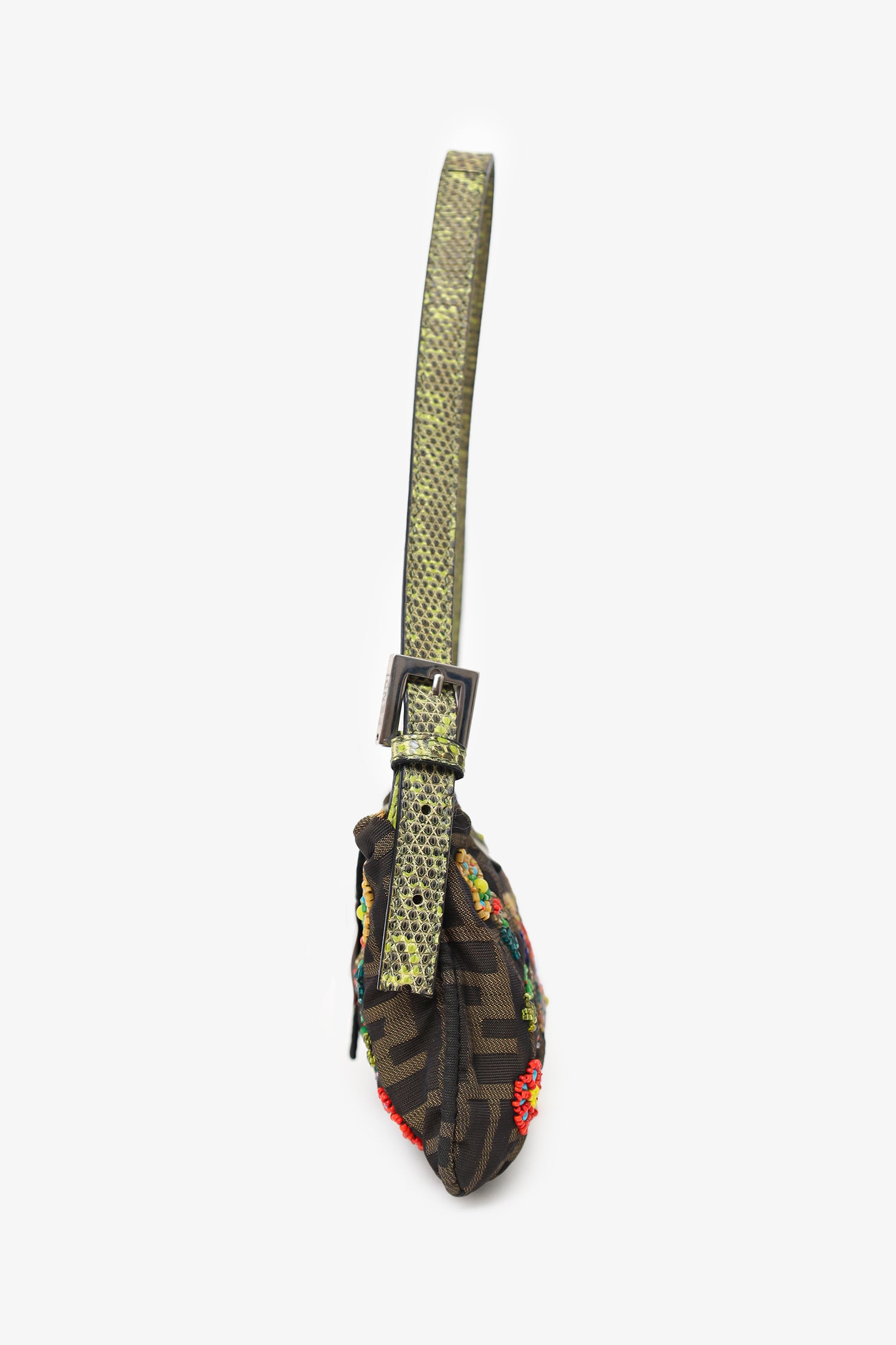 Refresh availabilityFendi Multicolor Floral Beaded Zucca Canvas Lizard Trimmed Shoulder Bag. Front fold-over piece with magnetic snap-button closure. Additional top zip closure. Adjustable shoulder strap with sliding buckle closure. Beaded embellishment throughout exterior. Lined interior. Single interior zip pocket. Silver-tone hardware. Tonal stitching.