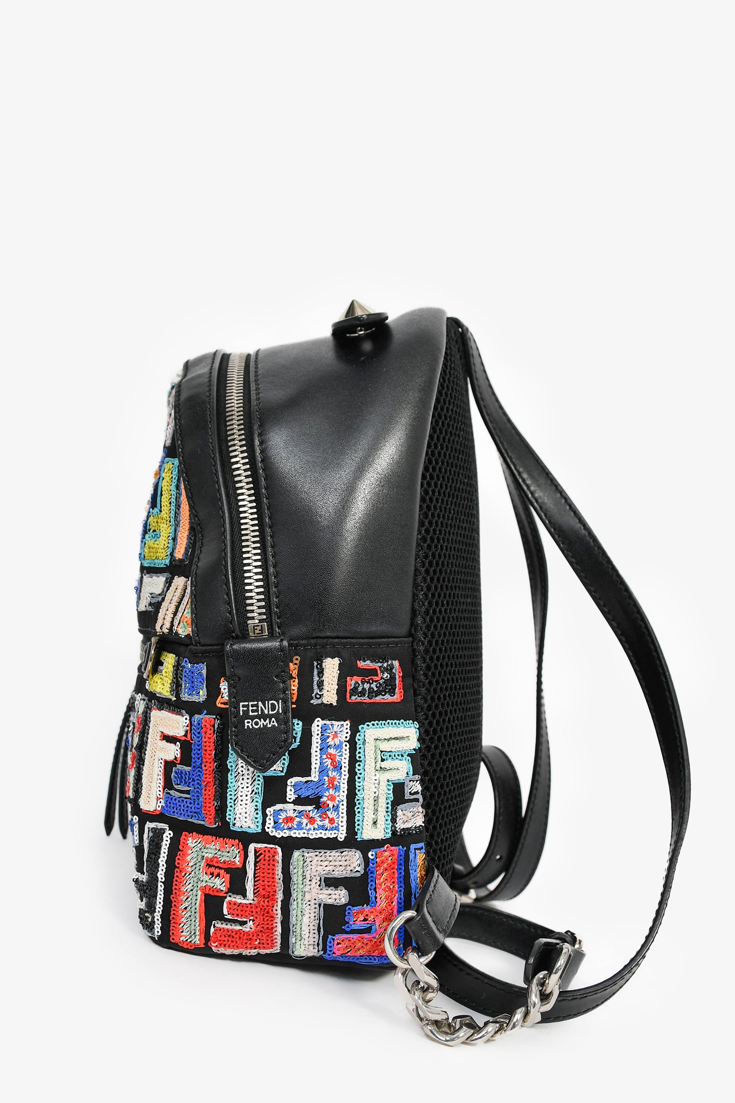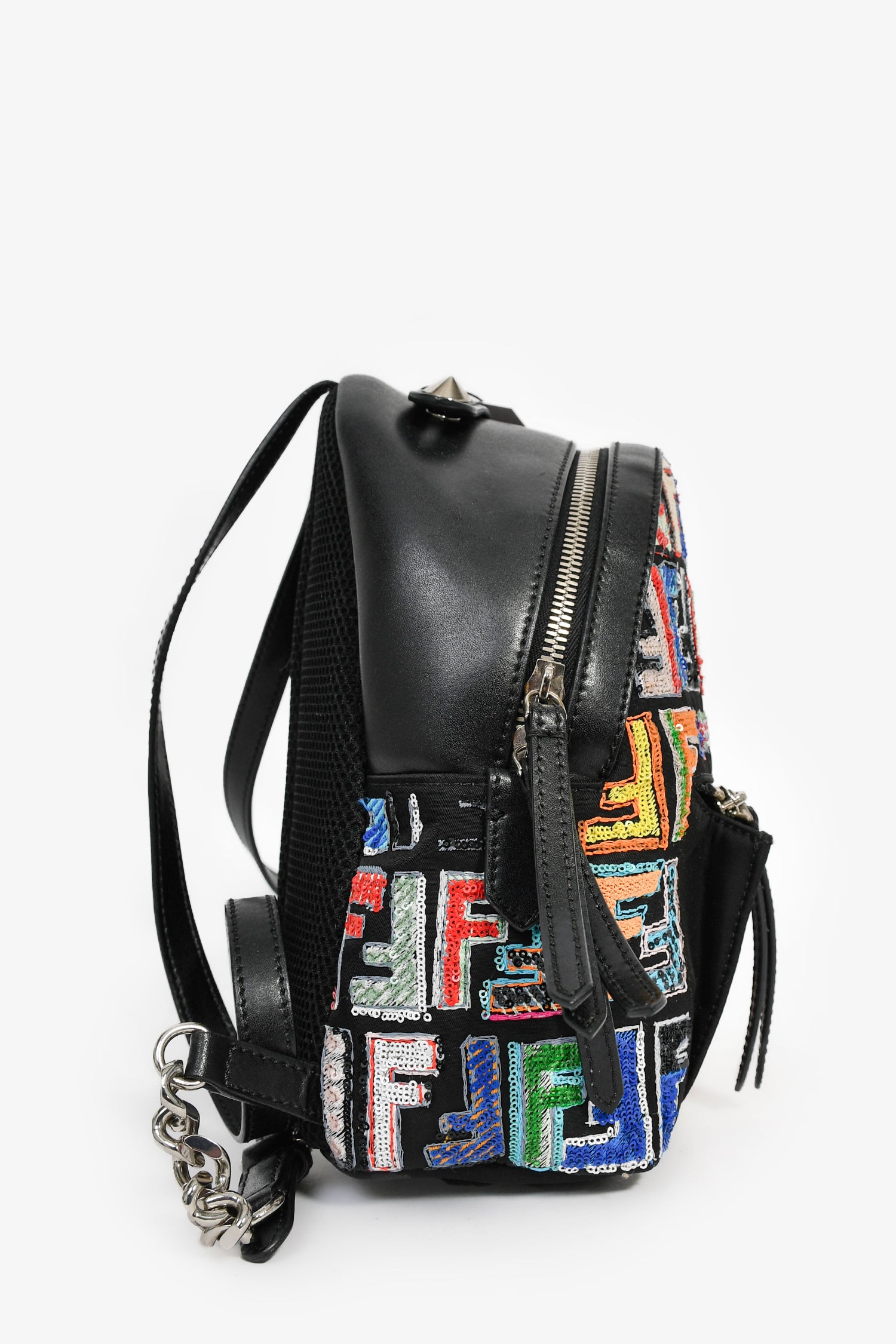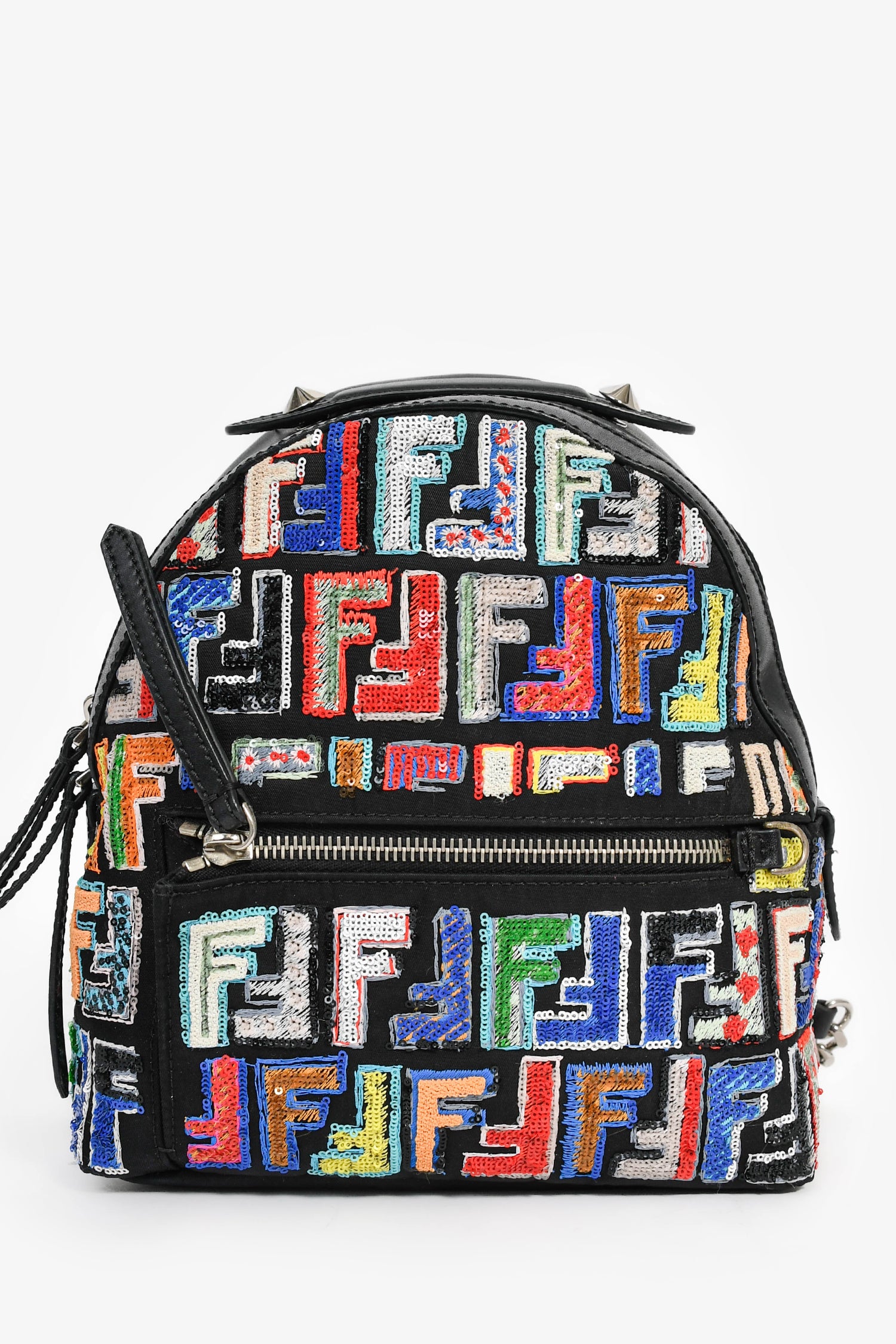 Refresh availabilityFendi Multicolour Sequin Zucca Print Small Backpack. Front zip pocket. Top two-way zip closure. Tonal textile interior lining. Single interior wall zip pocket. Adjustable double shoulder straps. Silver-tone hardware.