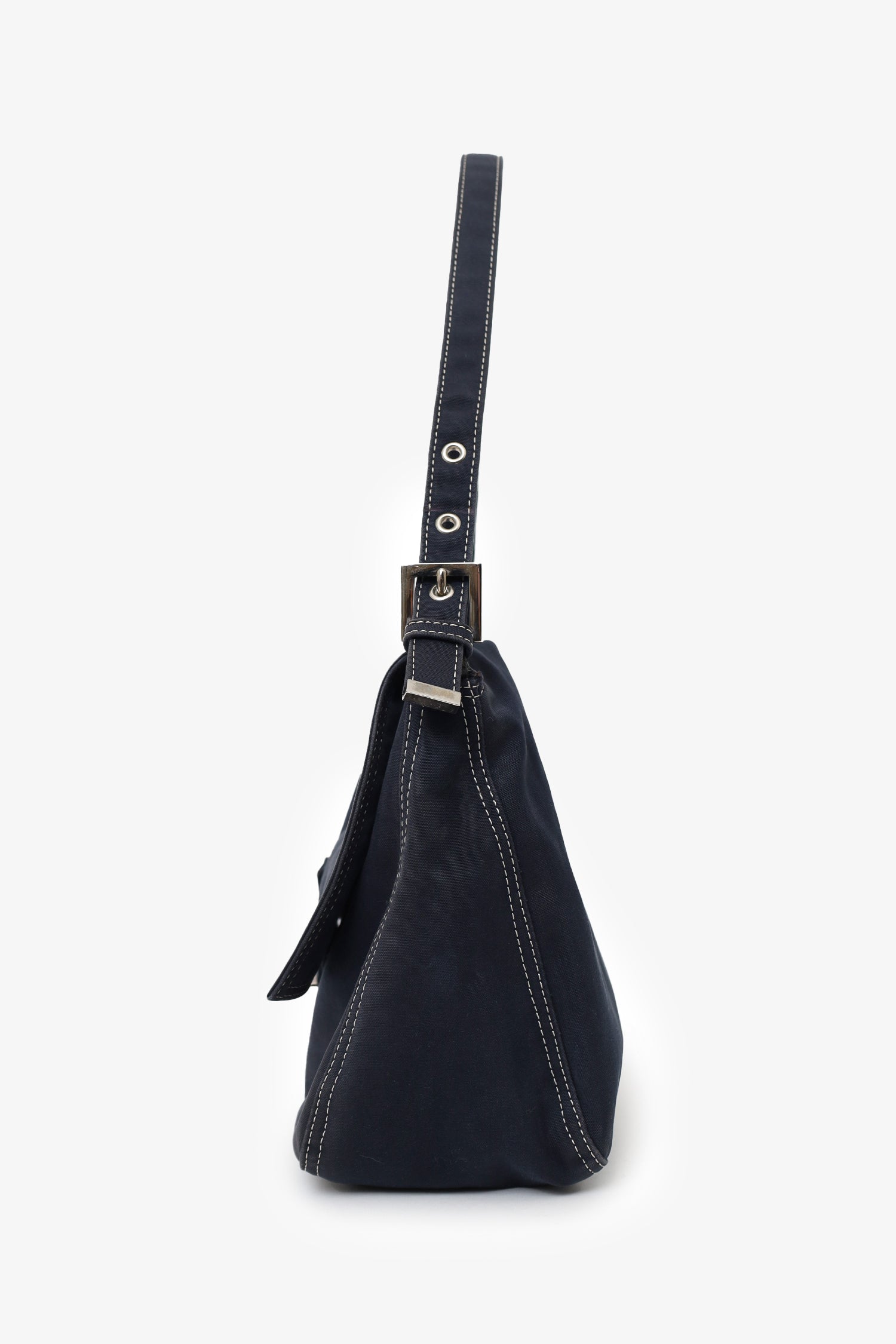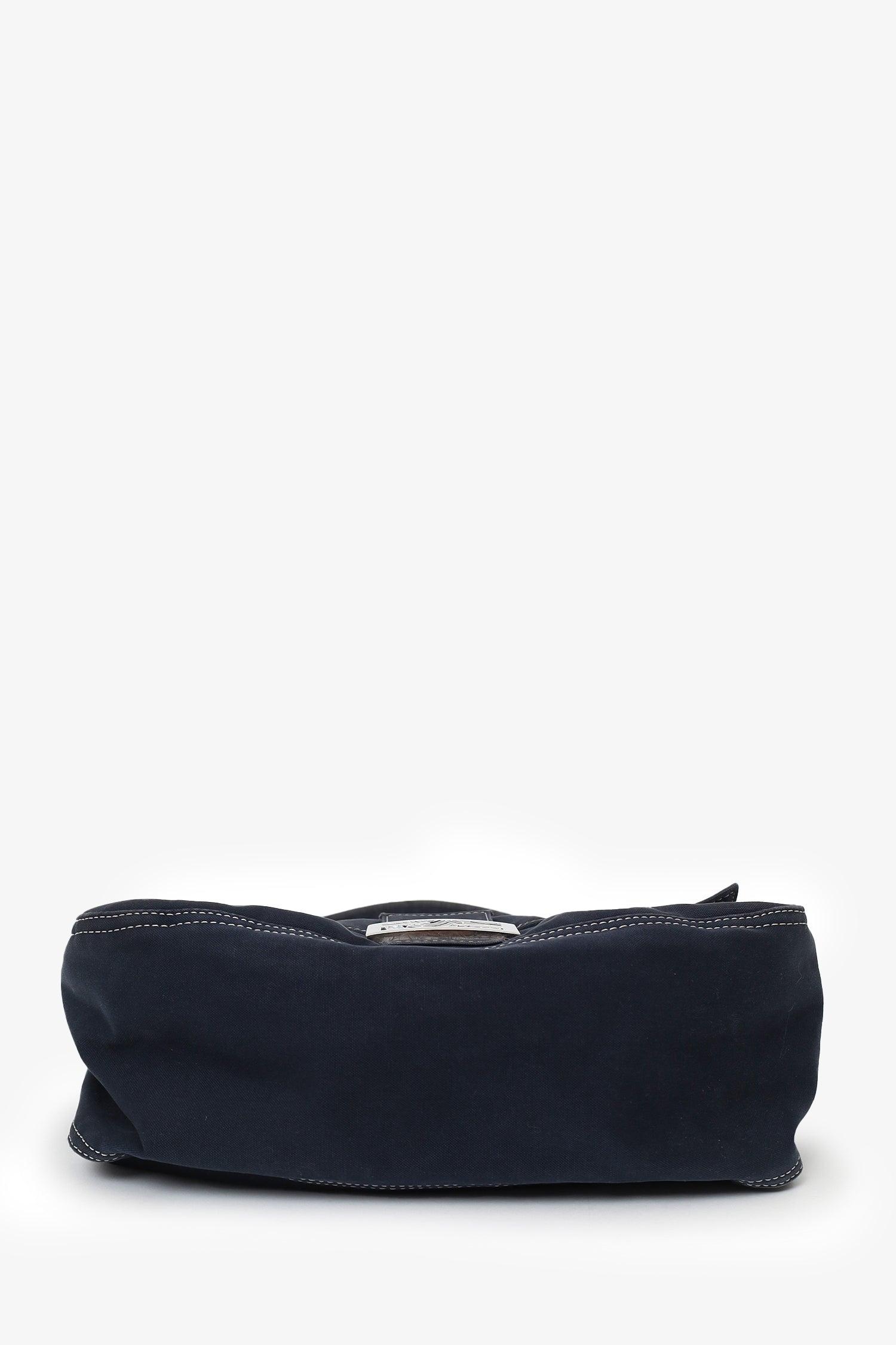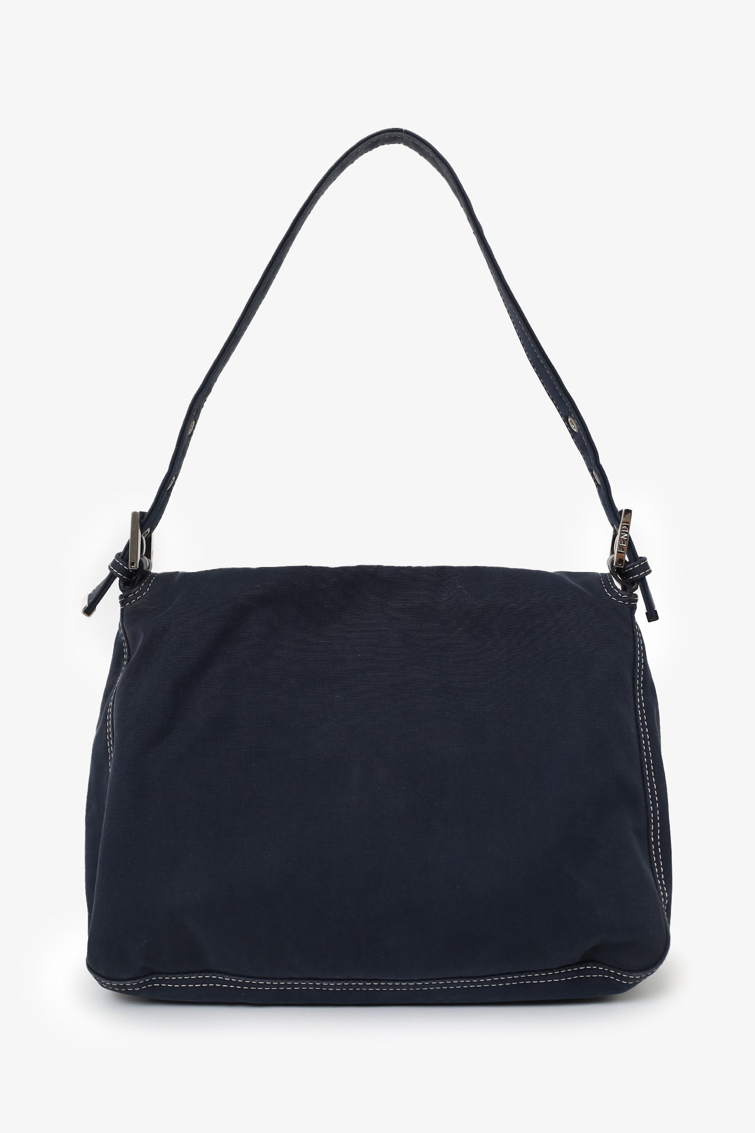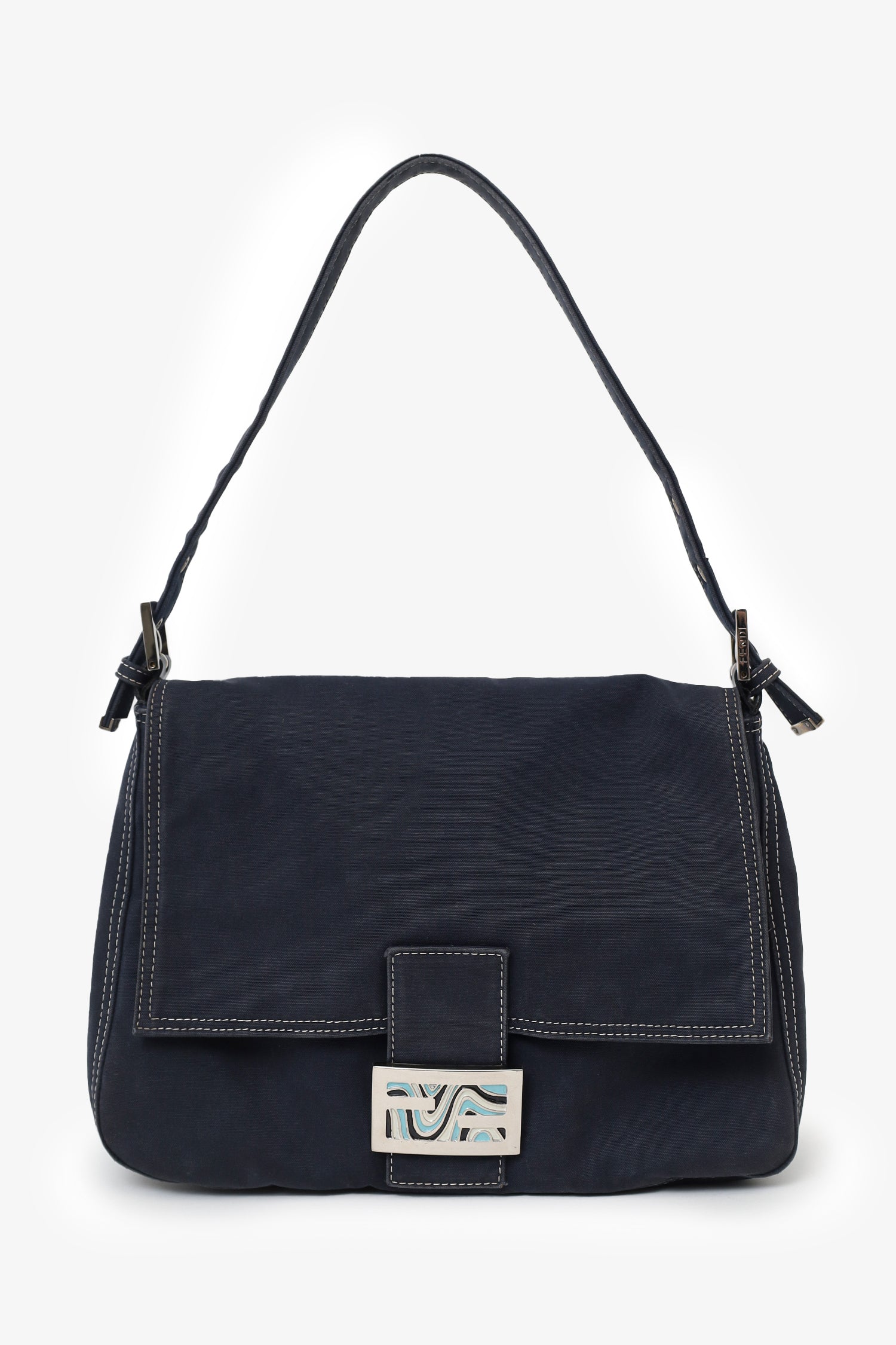 Refresh availabilityFendi Navy Denim Mamma Baguette Shoulder Bag. Front fold-over flap with magnetic snap-button closure. Shoulder strap with adjustable buckle closure. Lined interior. Single interior zip pocket. Silver-tone hardware. Contrast stitching.