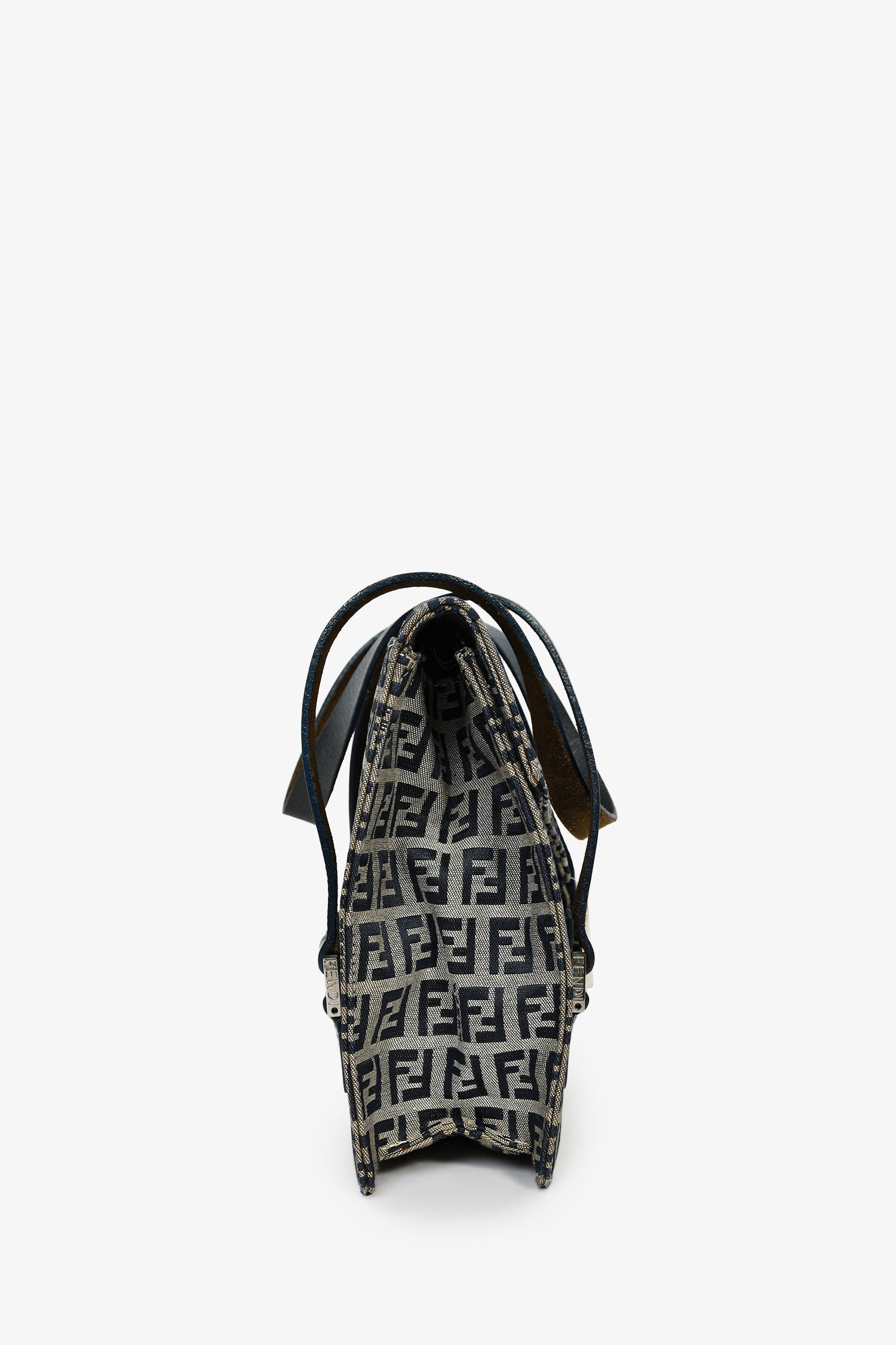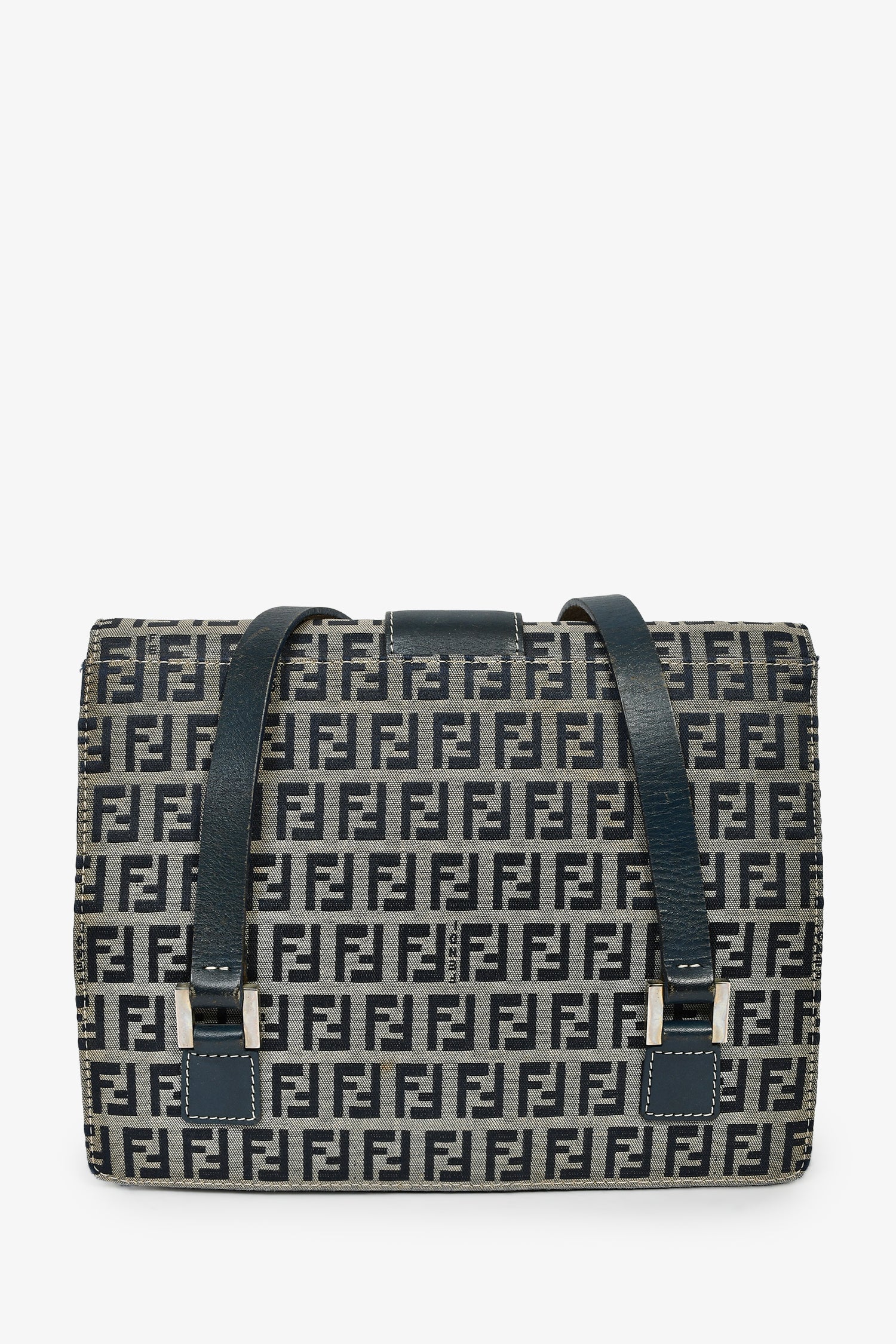Refresh availabilityFendi Navy FF Zucca Canvas Square Shoulder Bag. Front fold-over flap with magnetic button closure. Dual shoulder straps. Textile-lined interior. Single interior wall zip pocket. Silver-tone hardware. Tonal and contrast stitching.