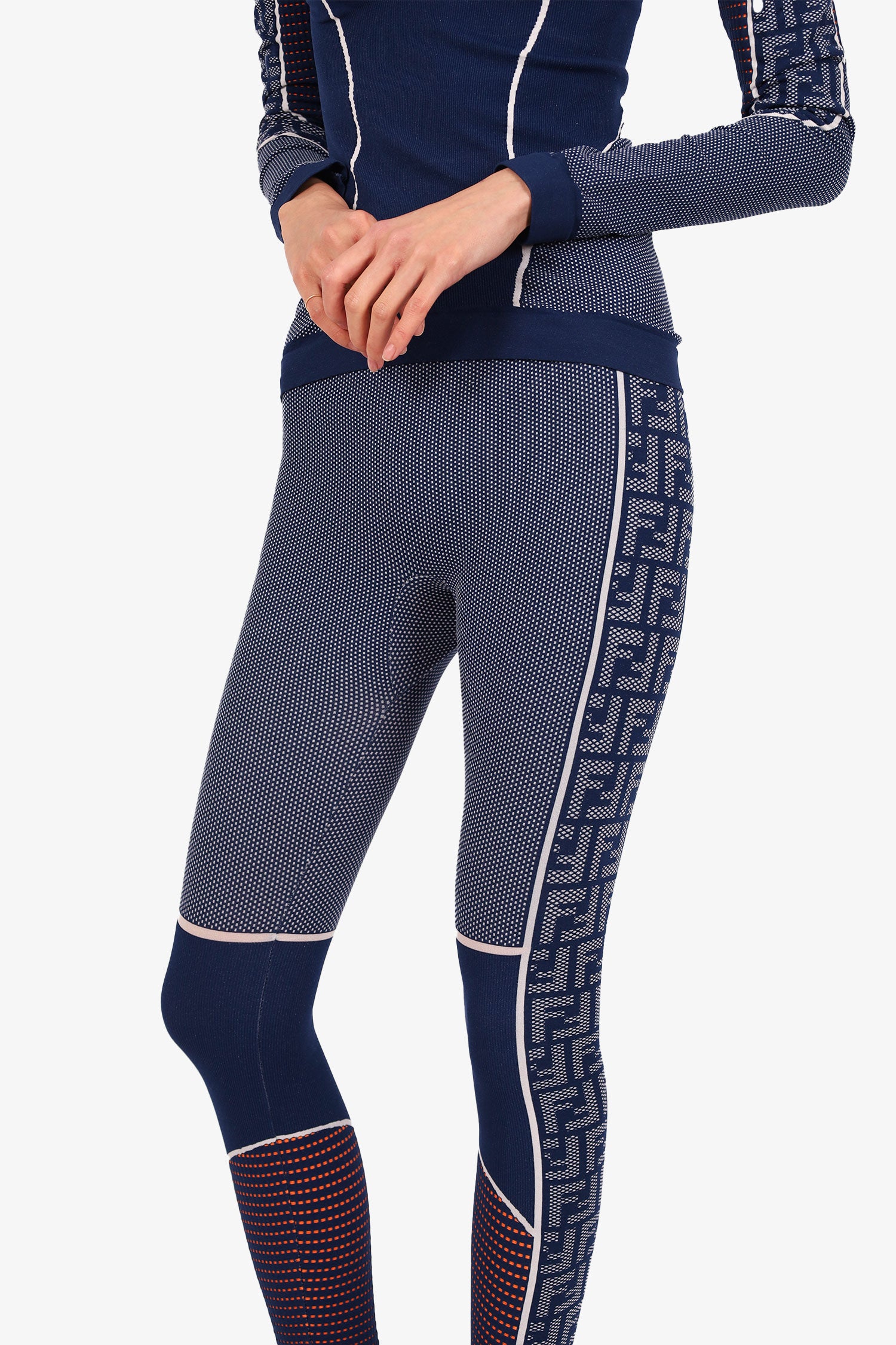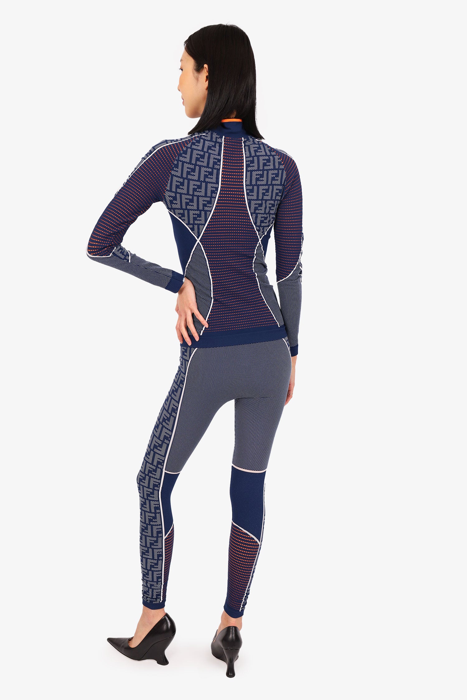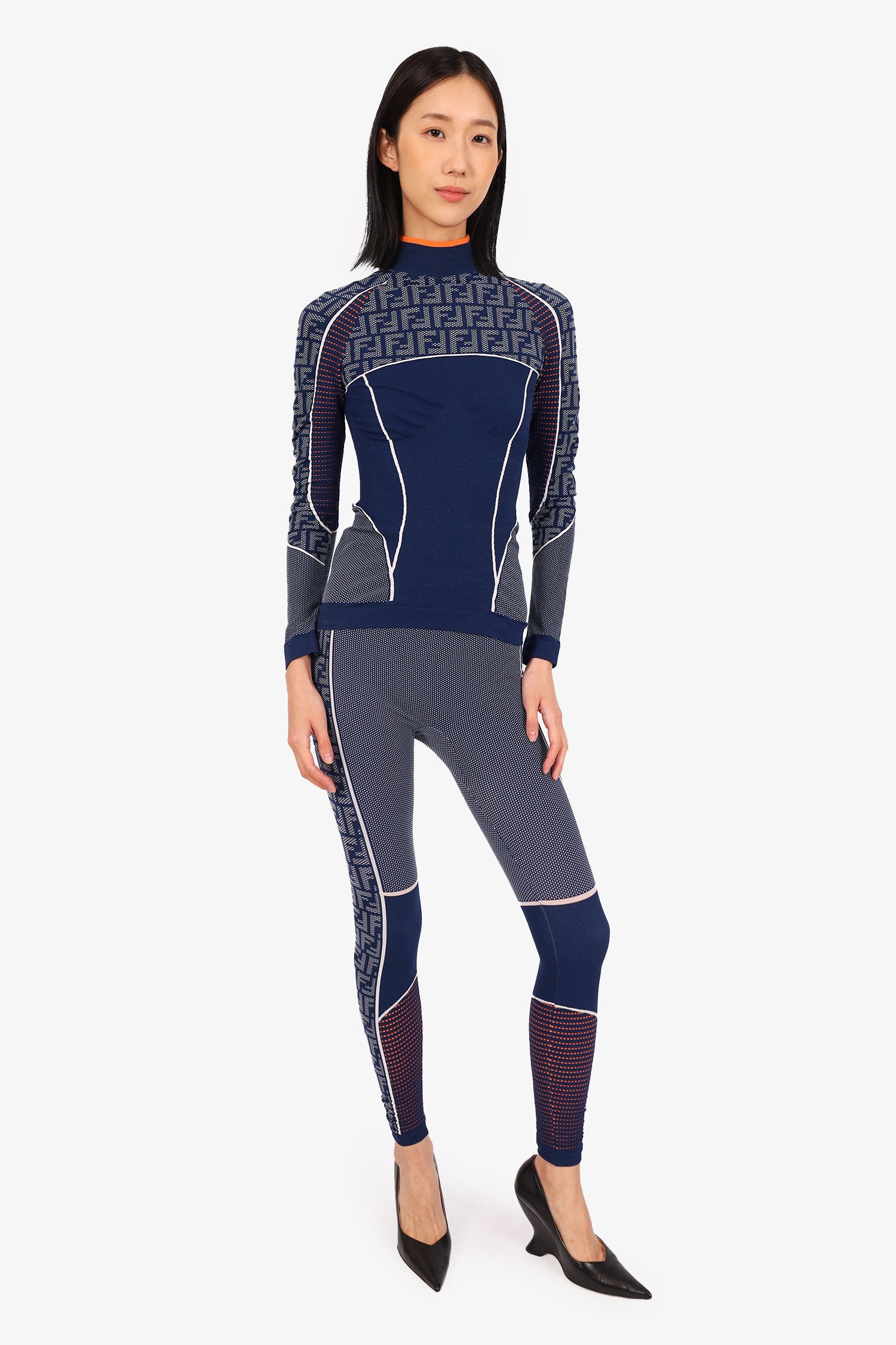 Refresh availabilityFendi Navy FF Zucca Pattern Tech Fabric High Neck Top with Legging Set. Top; Pull on. Mock neckline. Pants; Pull on. Elasticated waist. Both unlined with tonal stitching.
