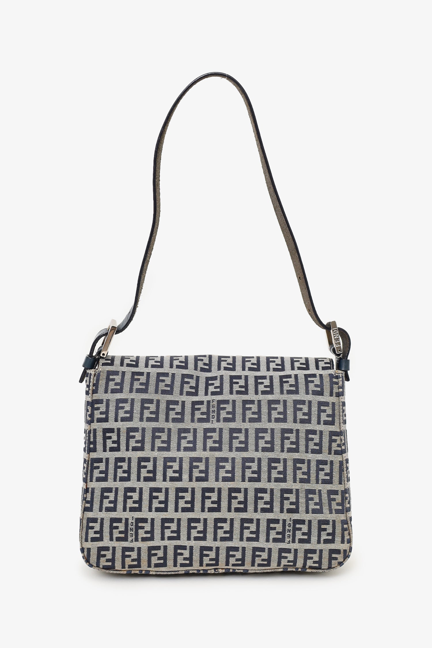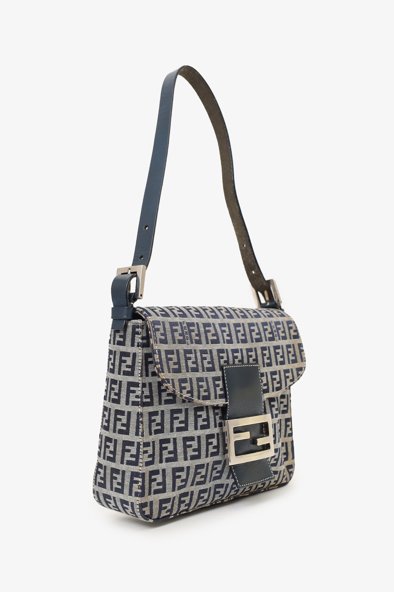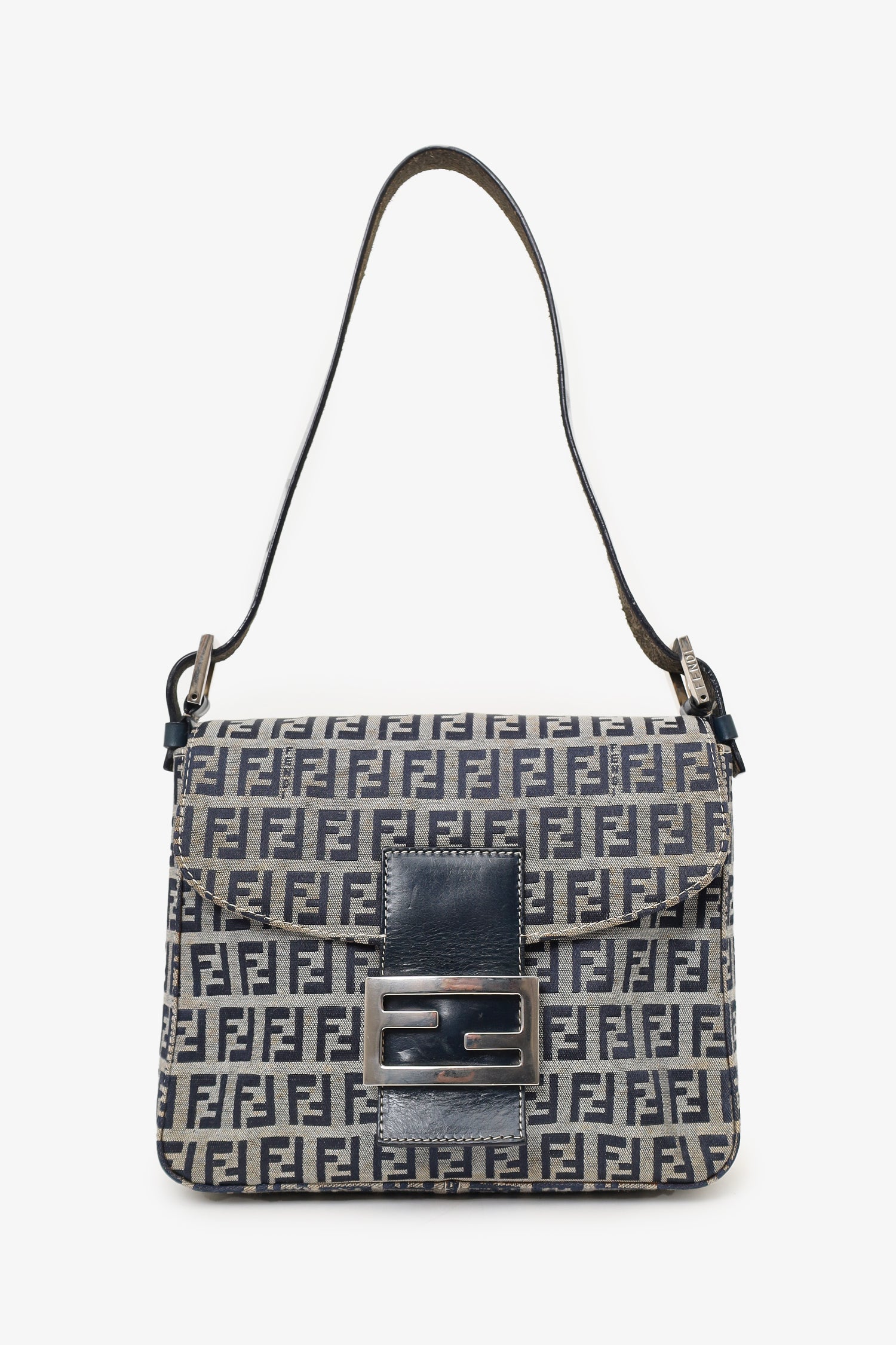 Refresh availabilityFendi Navy/Grey Canvas FF Zucca Mamma Baguette Shoulder Bag. Front fold-over flap with magnetic snap button closure. Open interior with 1 rear wall zip pocket. Adjustable shoulder strap with pull-through buckle closure. Silver-toned hardware. Tonal stitching.