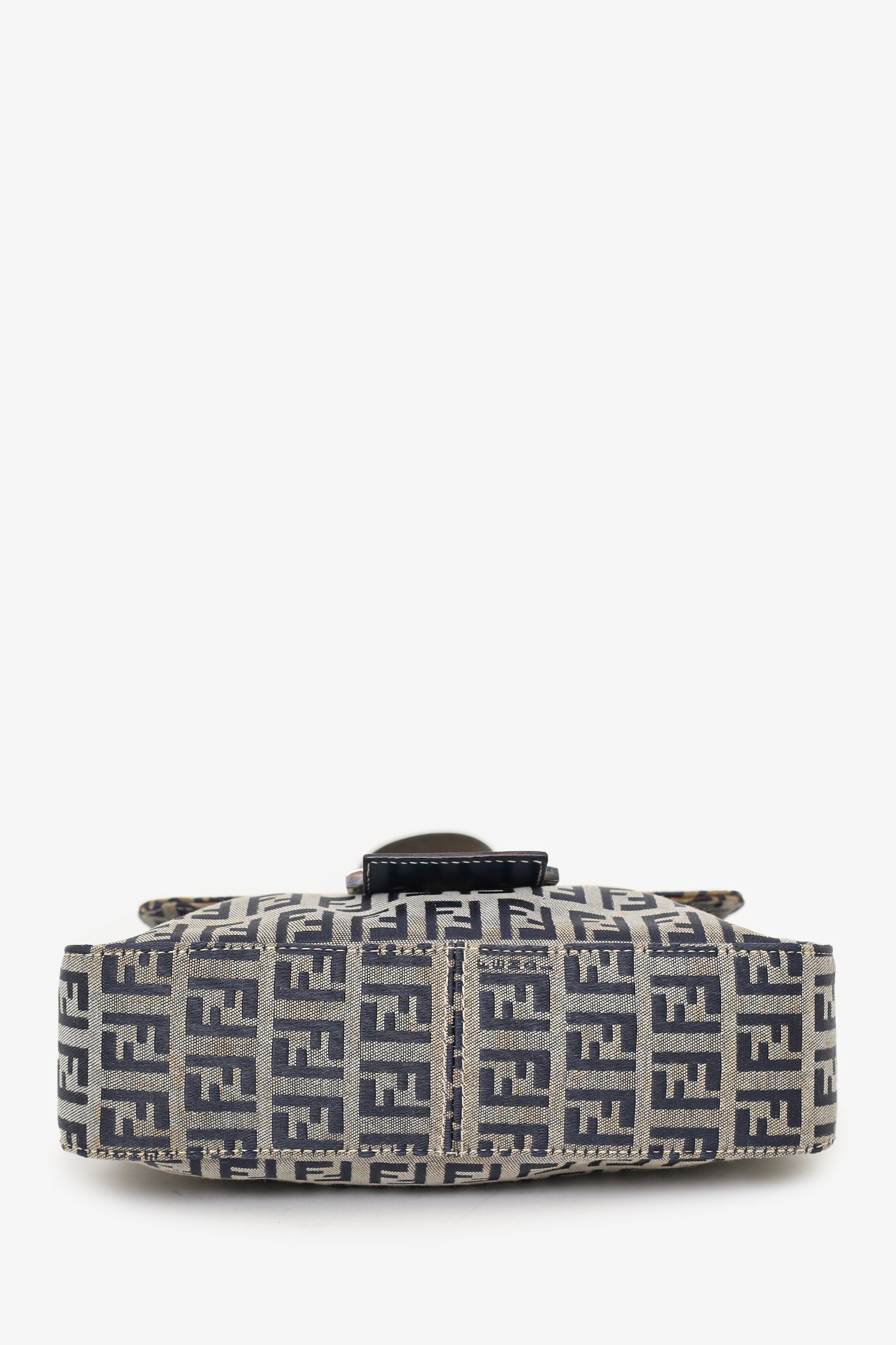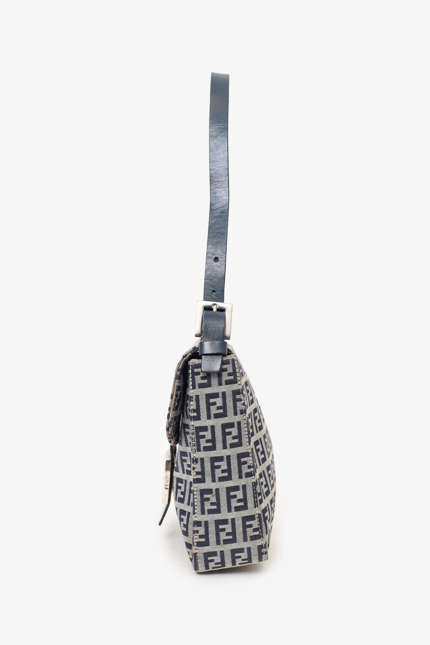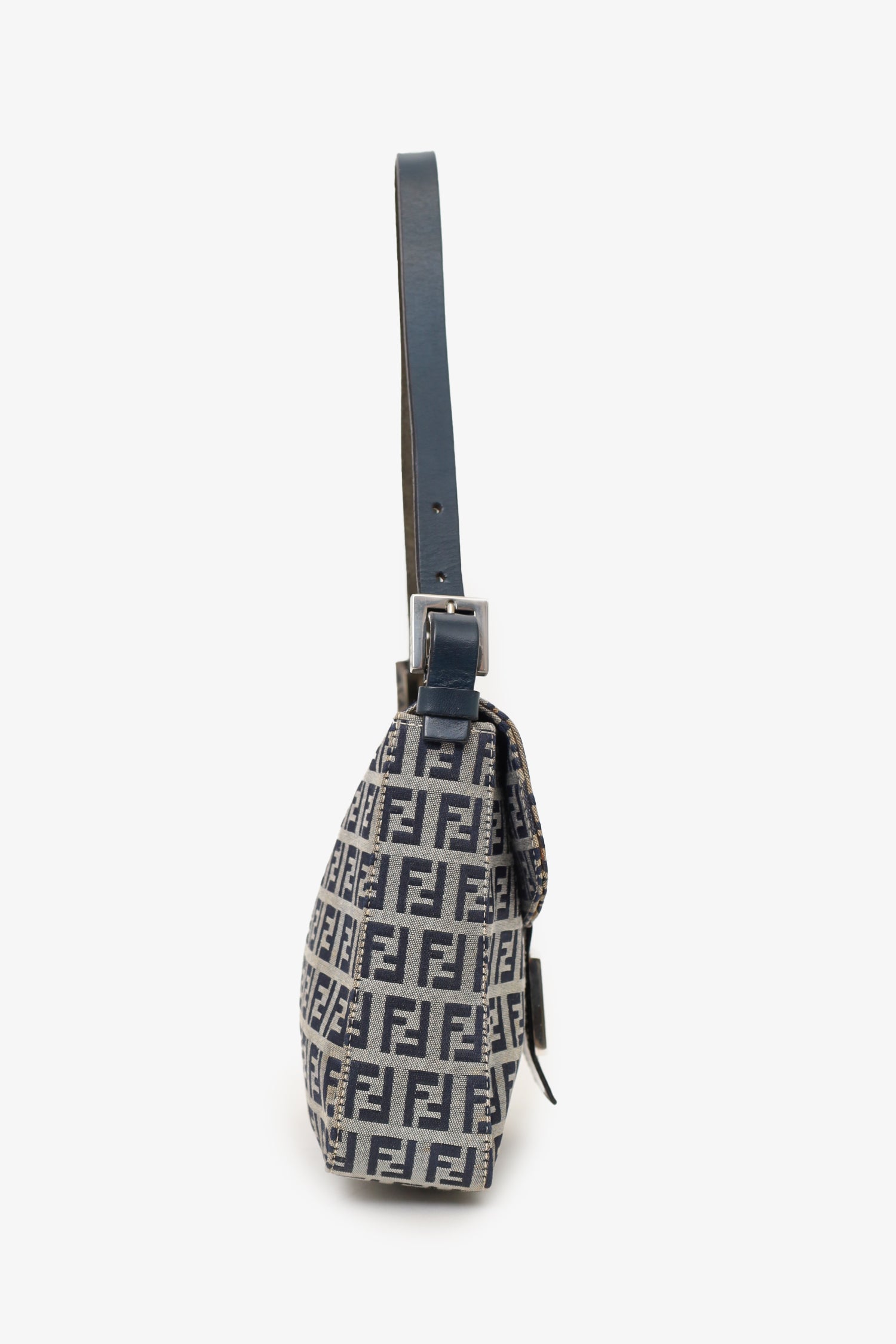 Refresh availabilityFendi Navy/Grey Canvas FF Zucca Mamma Baguette Shoulder Bag. Front fold-over flap with magnetic snap button closure. Open interior with 1 rear wall zip pocket. Adjustable shoulder strap with pull-through buckle closure. Silver-toned hardware. Tonal stitching.