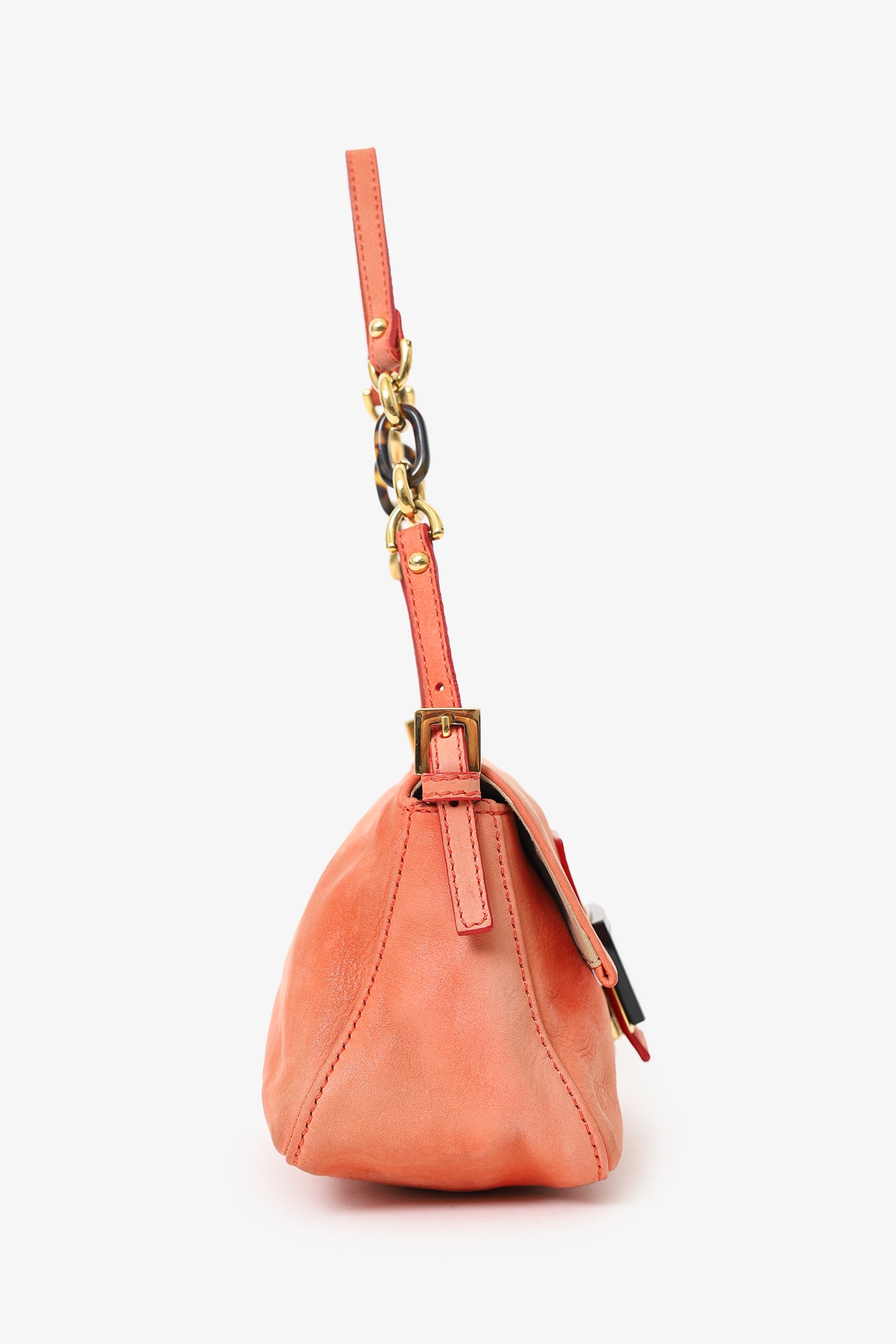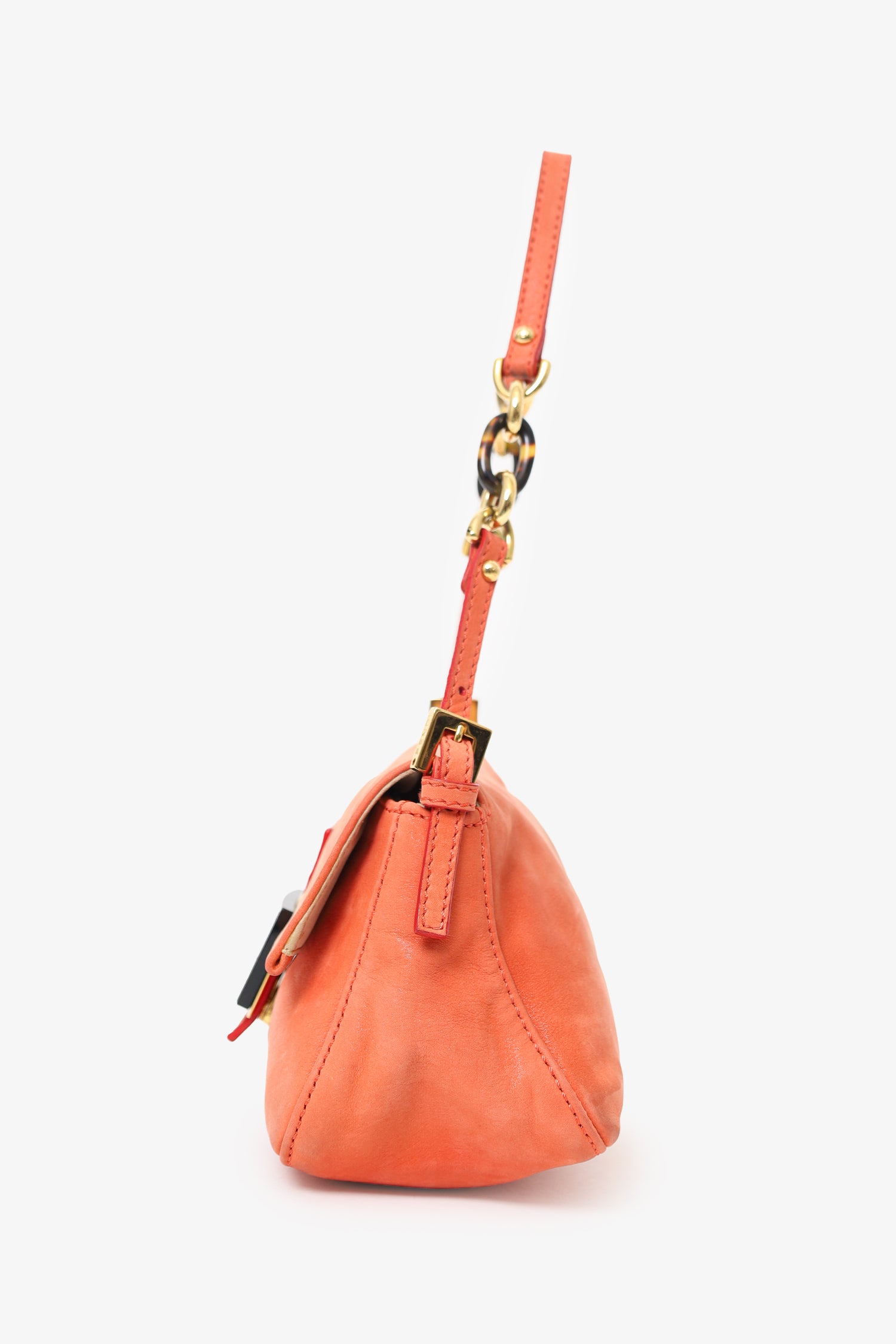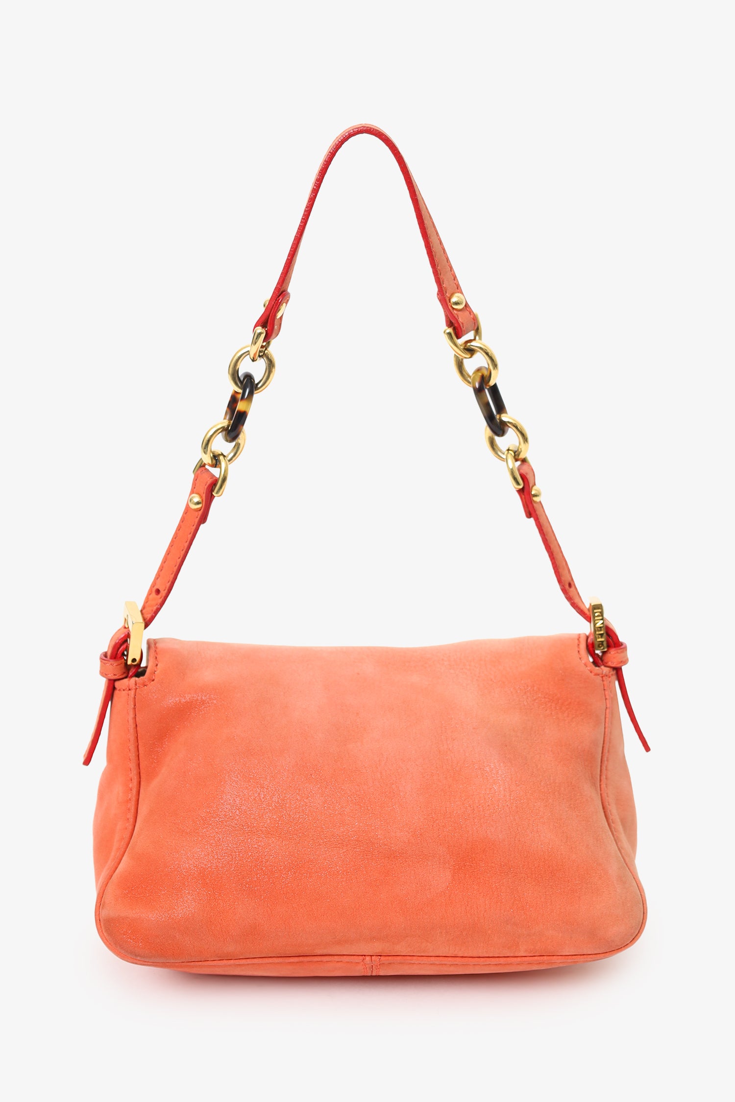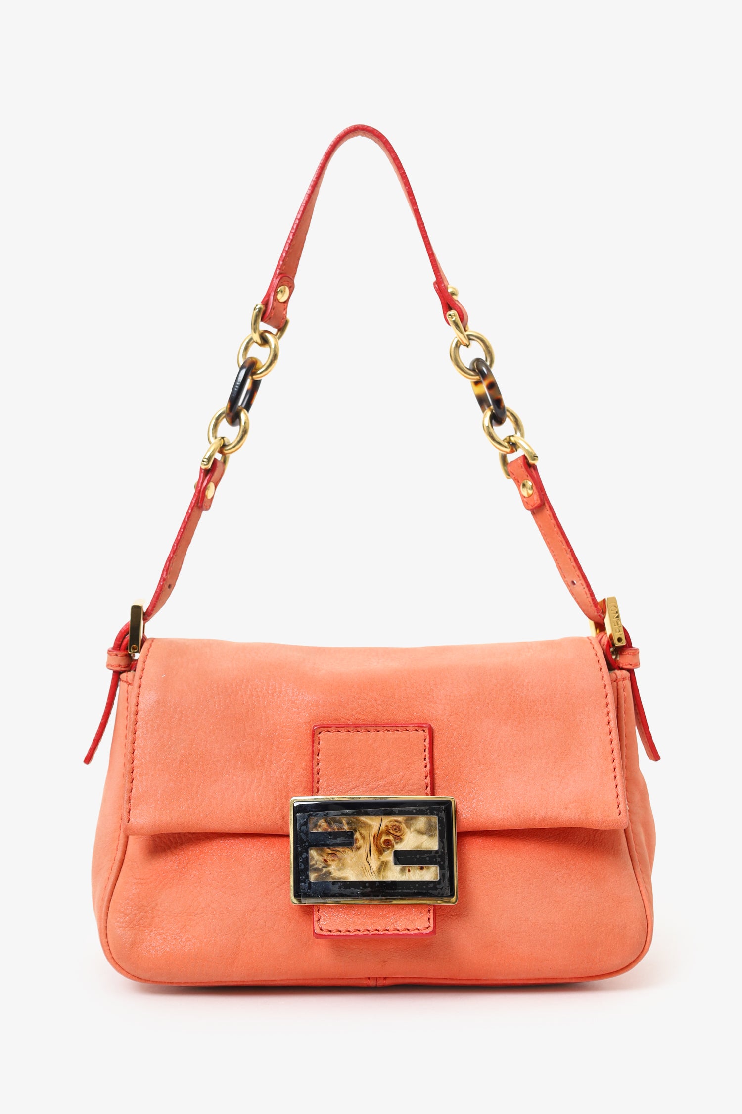 Refresh availabilityFendi Orange Soft Leather Mini Mama Forever Shoulder Bag. Front-fold-over-flap with magnetic snap-button-up closure. Adjustable shoulder strap with pull-through buckle closure. Lined interior with single rear slip pocket. Gold-tone hardware. Tonal stitching.