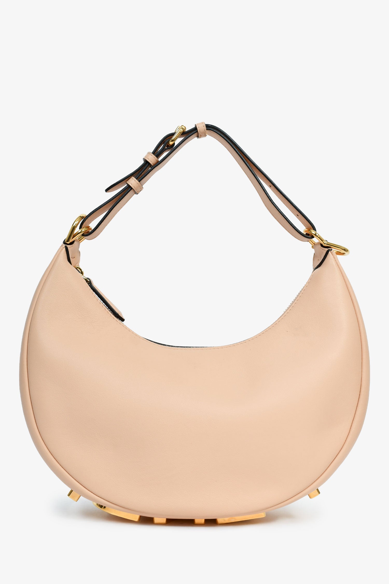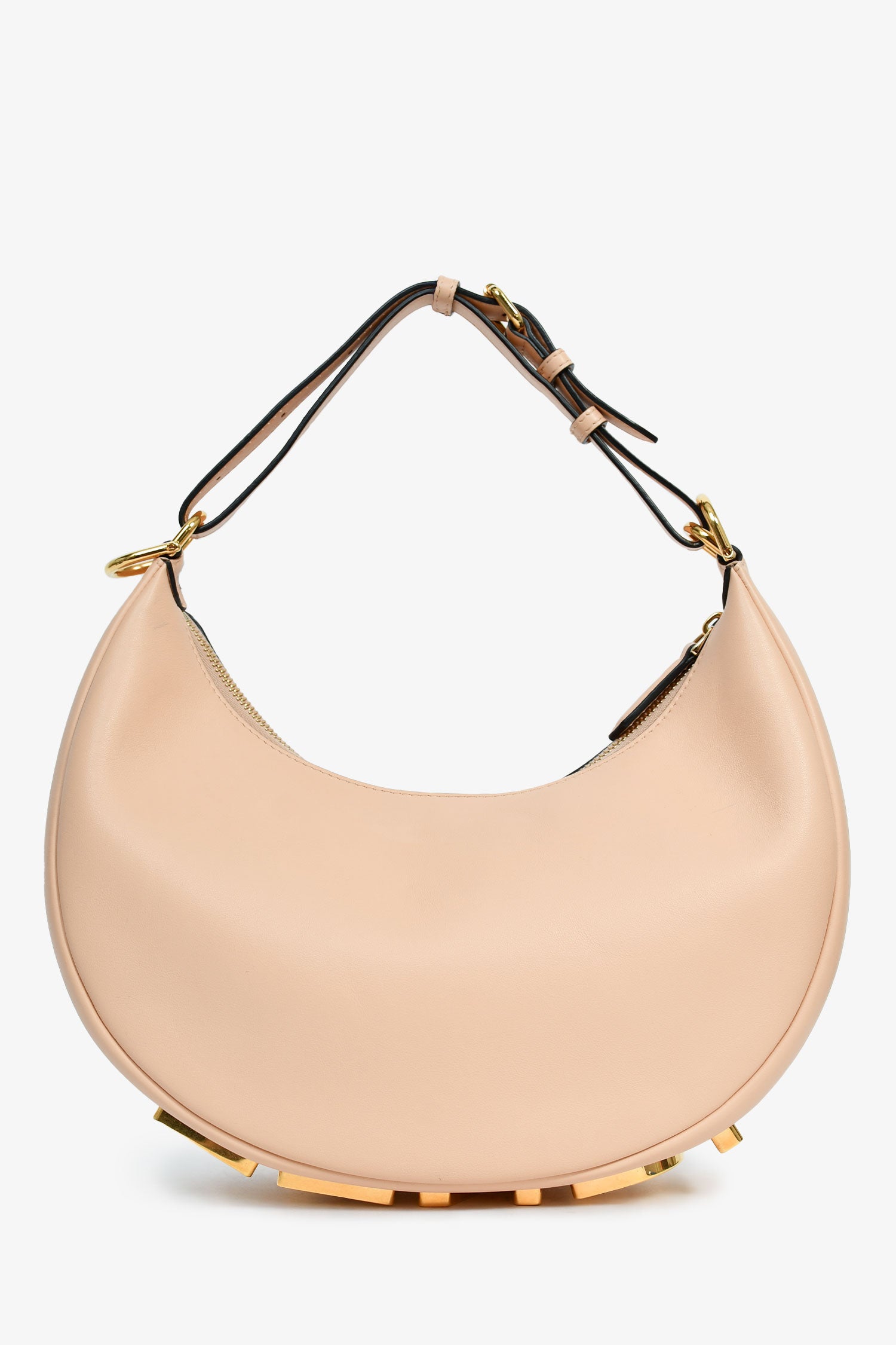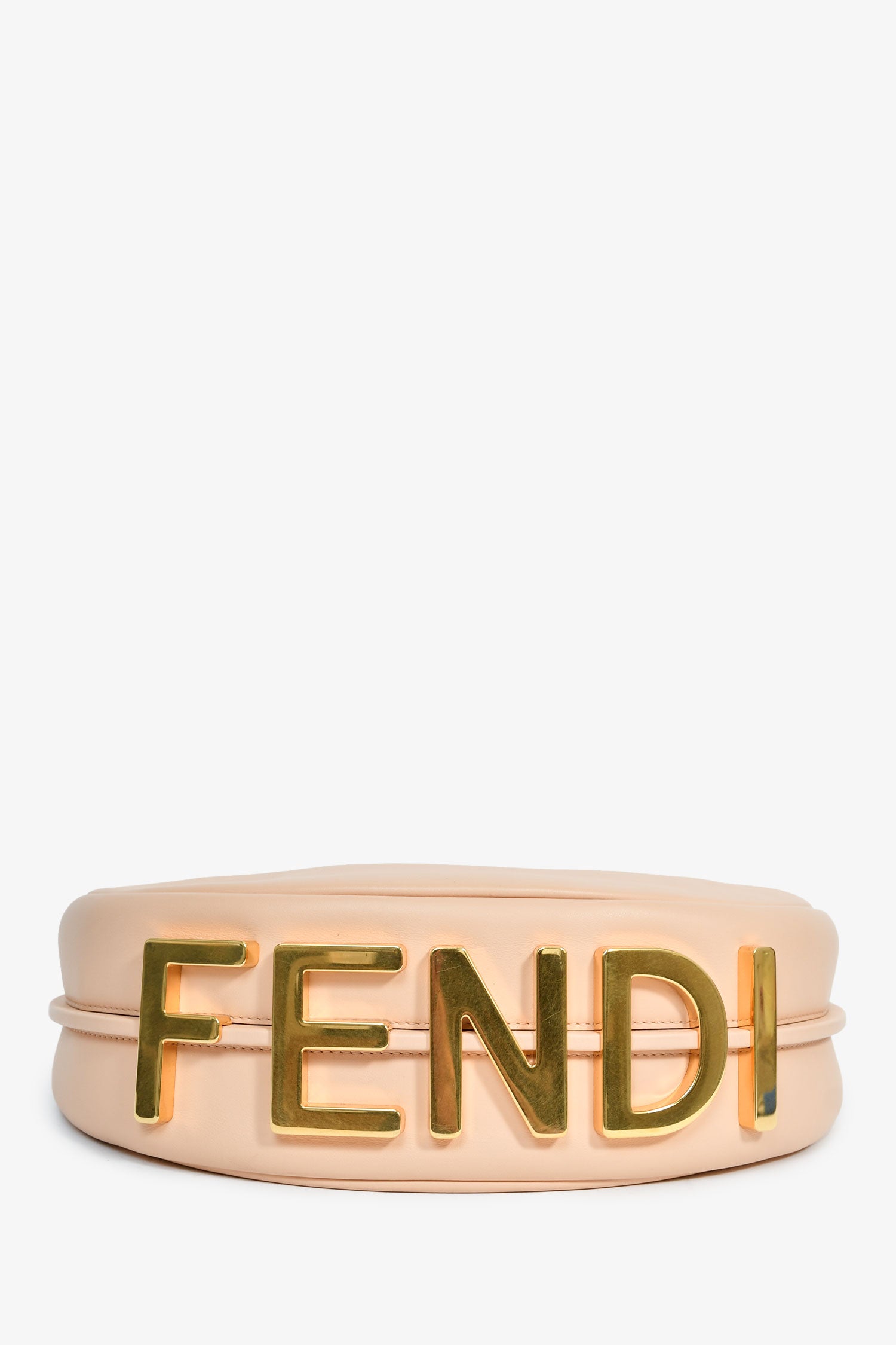 Refresh availabilityFendi Peach Leather 'Fendigraphy' Shoulder Bag. Gold-tone hardware. Coated trim. Single adjustable shoulder strap. Lined interior. Tonal stitching.