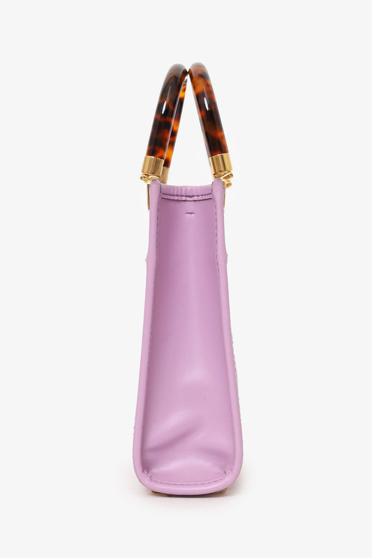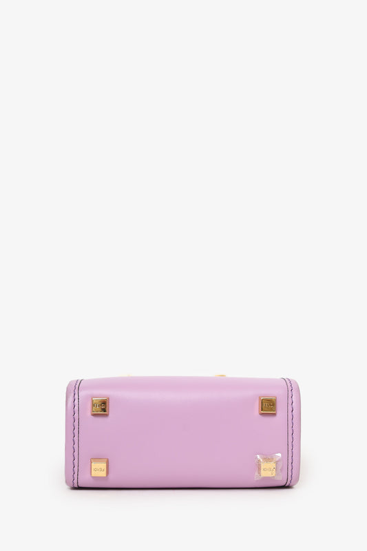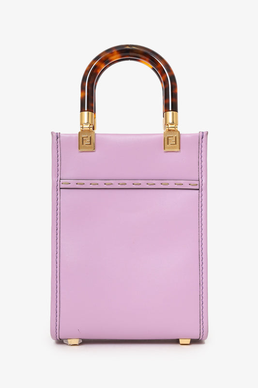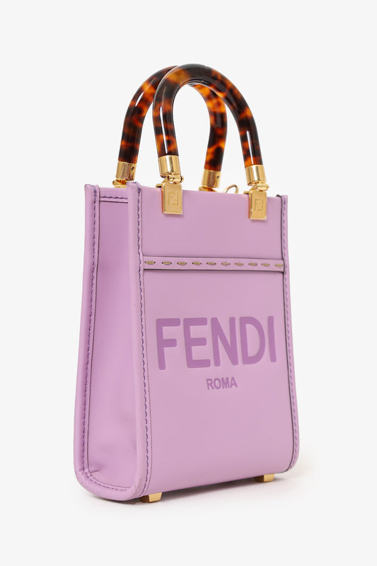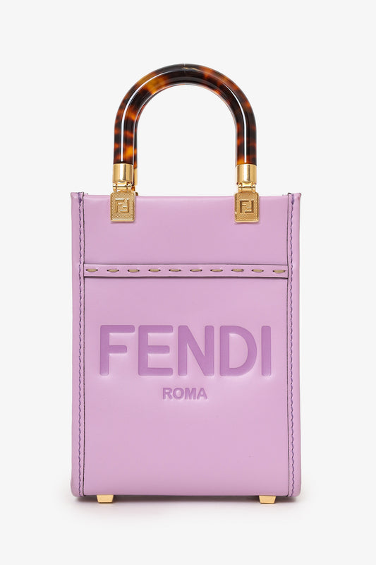 Refresh availabilityFendi Pink Calfskin Leather Mini Sunshine Shopper Tote. Top open. Twin acrylic handles. Removable crossbody strap with adjustable push-pin closure. Protective studs on bottom. Open lined interior. Gold-tone hardware. Contrast stitching.