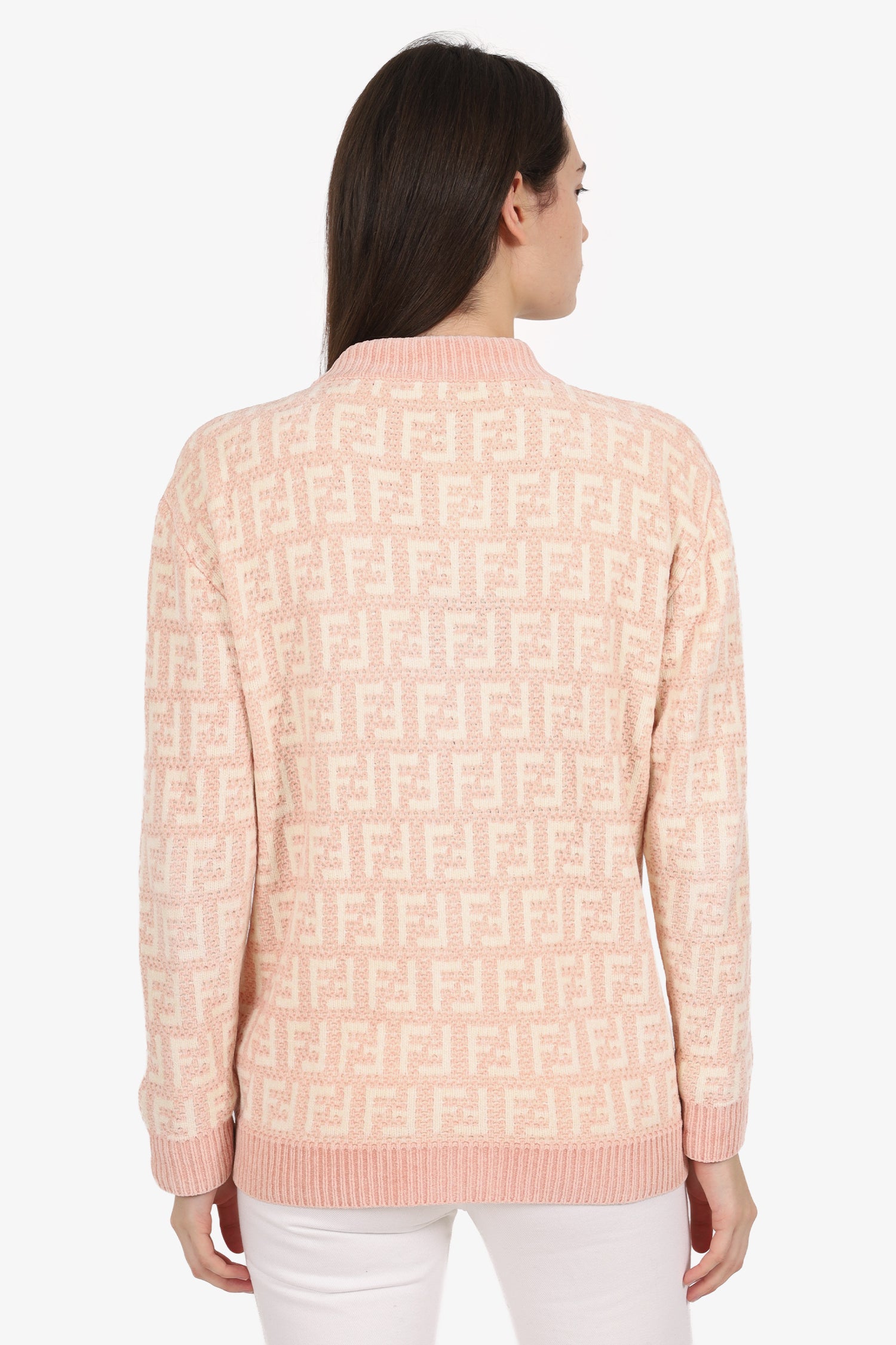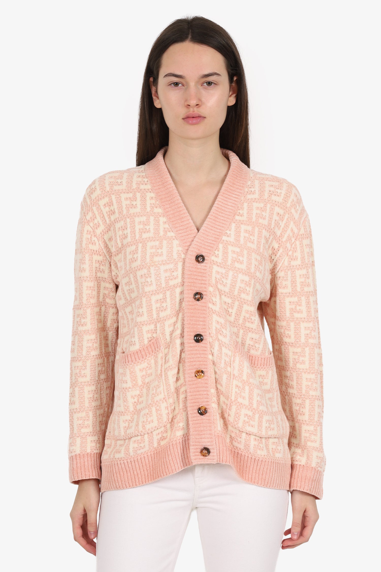 Refresh availabilityFendi Pink Chenille FF Print V-Neck Cardigan. Pull-on. V-neckline. Front button-up closure. 2 exterior front slip pockets. Tonal stitching.