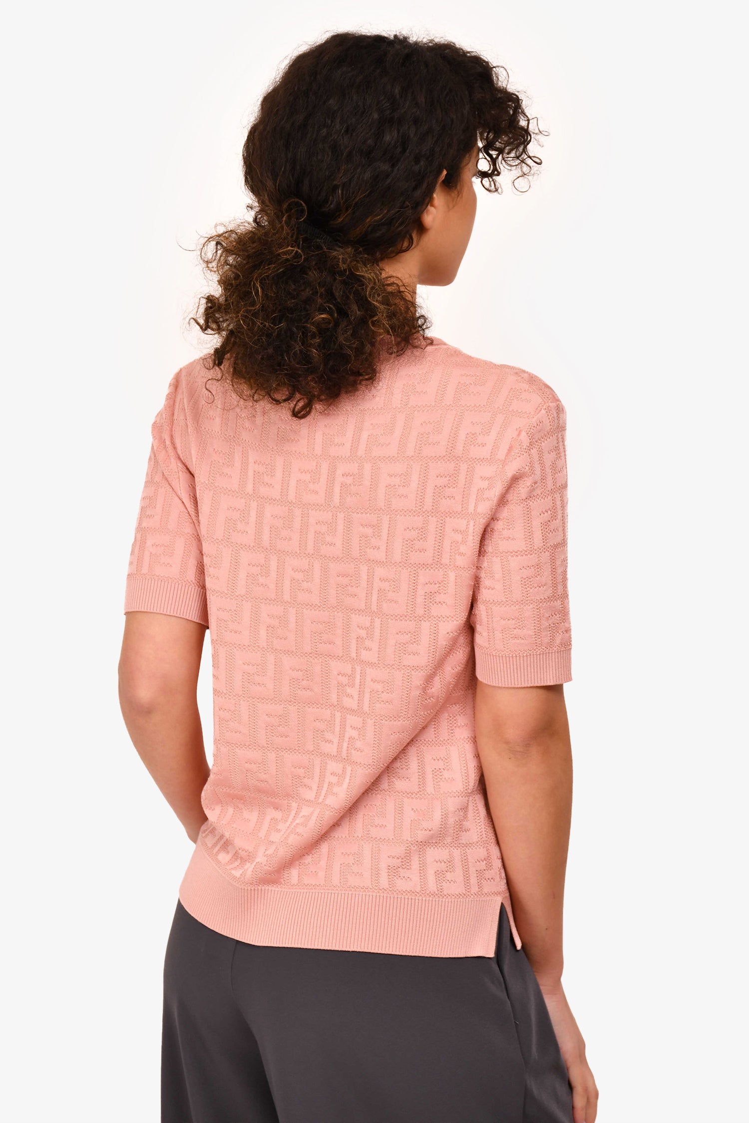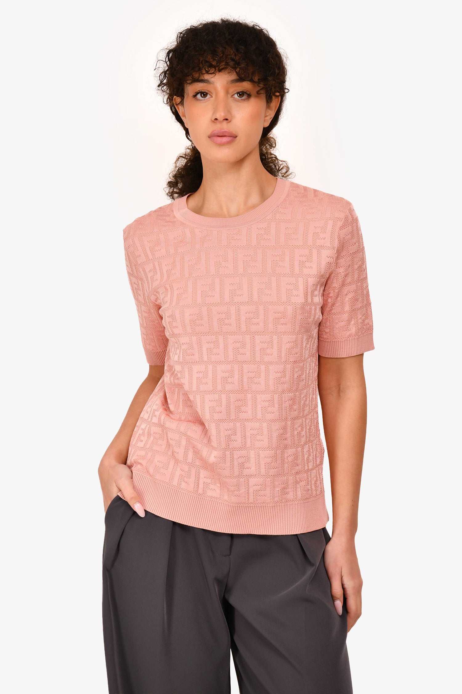 Refresh availabilityFendi Pink Cotton FF Logo T-Shirt. Ribbed collar, sleeves, and hemming. Tonal stitching.