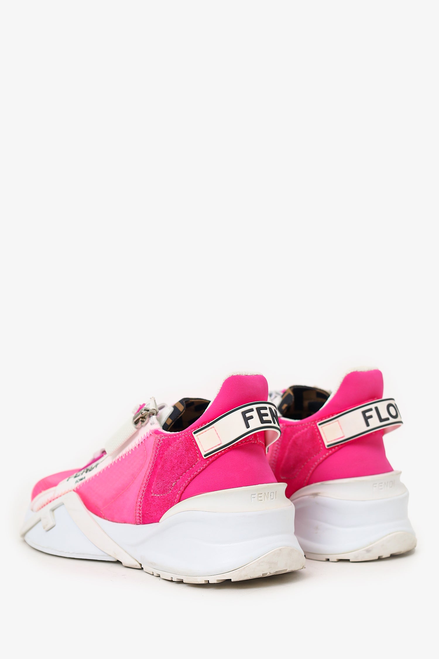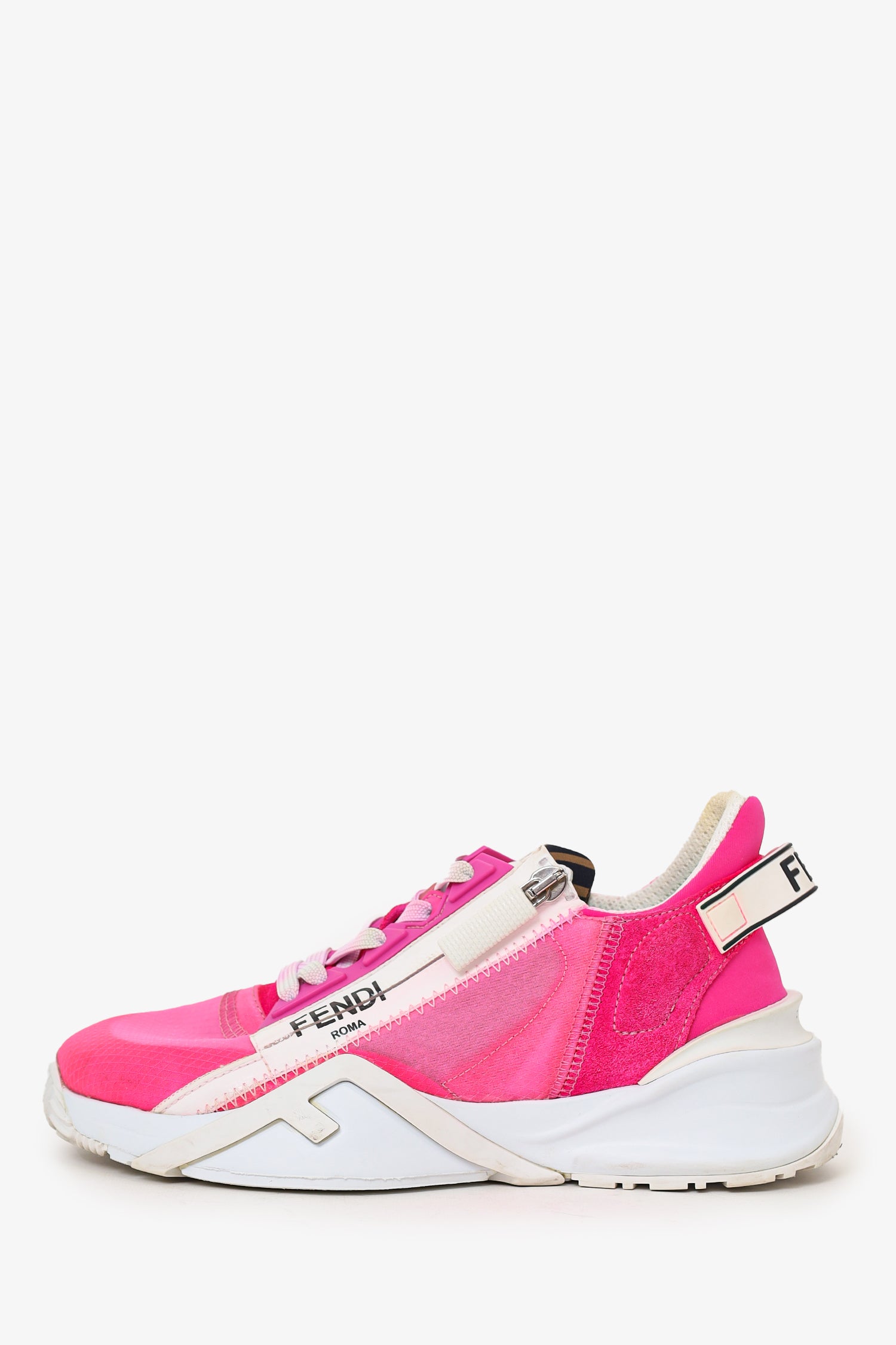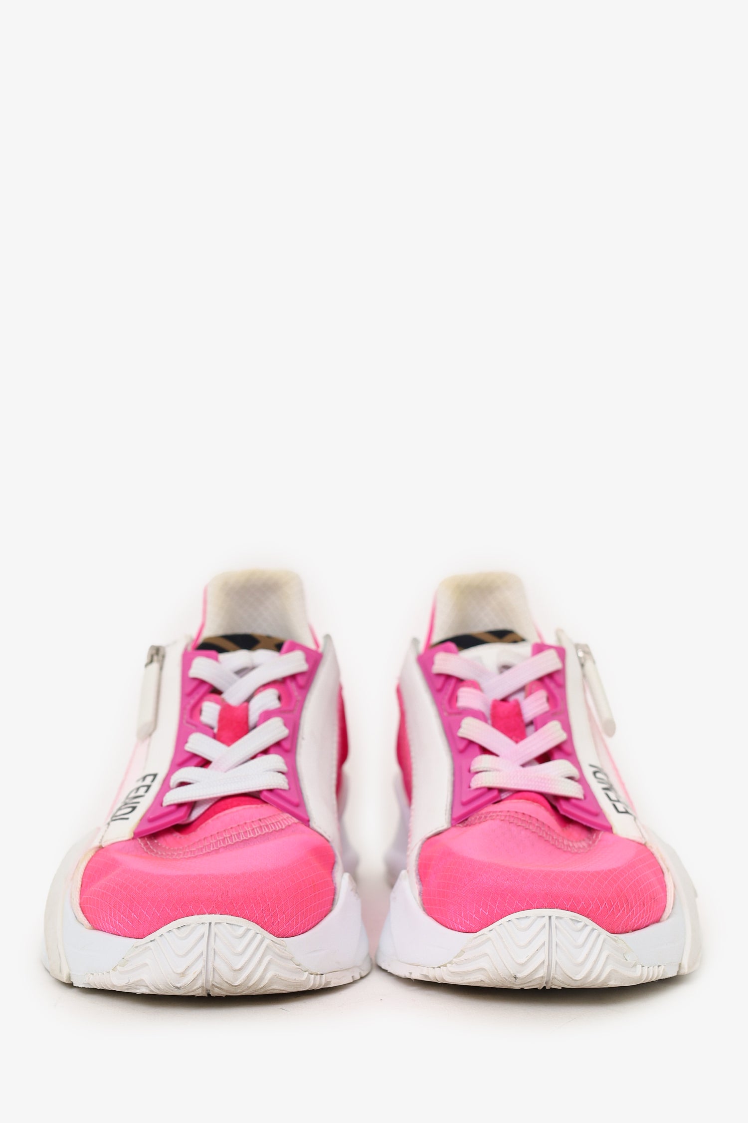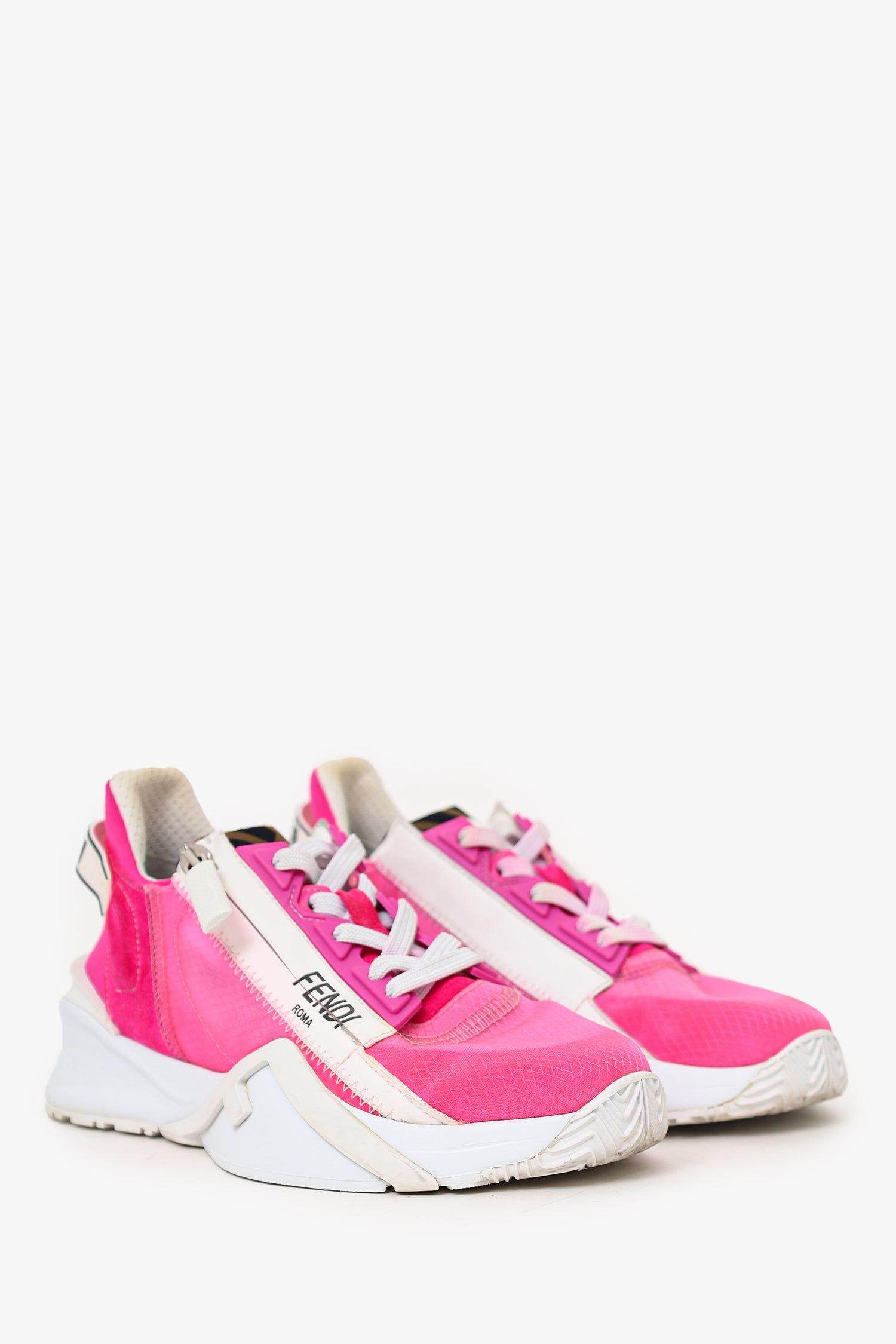 Refresh availabilityFendi Pink 'Flow' Side-Zip Sneakers Size 35. Slip on. Pointed round toe. Top lace-up and side zip closure. Pull tabs on rear. Tonal and contrast stitching.