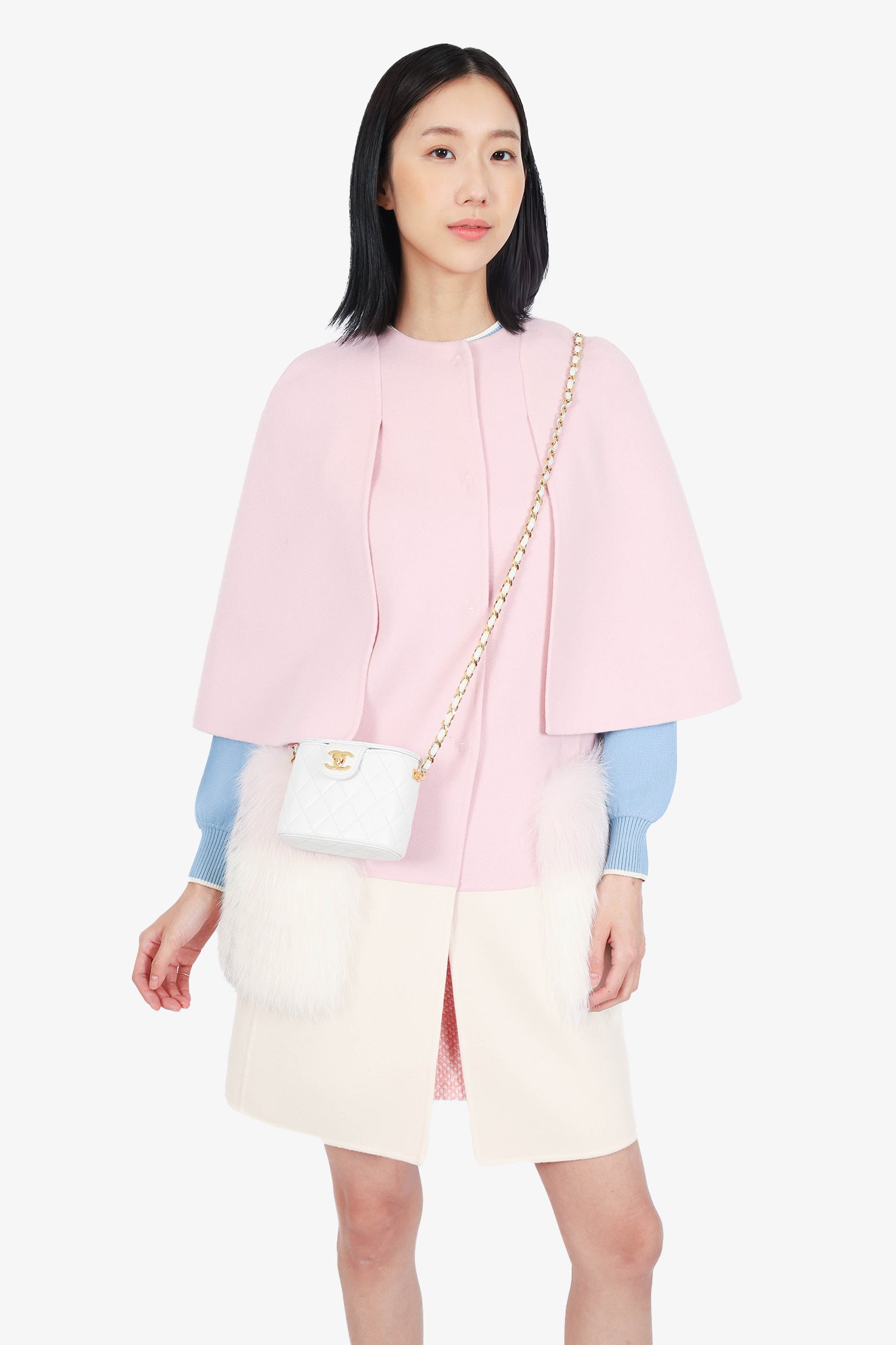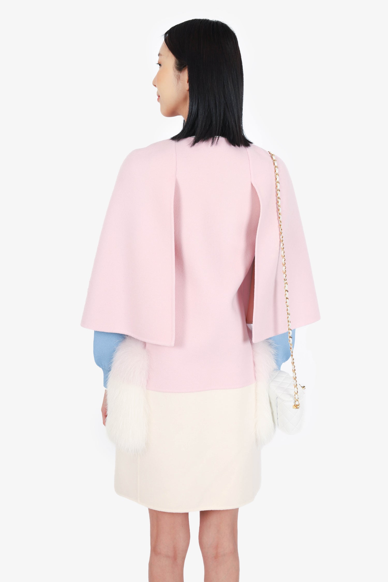 Refresh availabilityFendi Pink/White Wool Cape Coat with Fur Pocket. Pull-on. Front snap-button closure. 2 front slip fur pockets. Unlined. Tonal stitching.