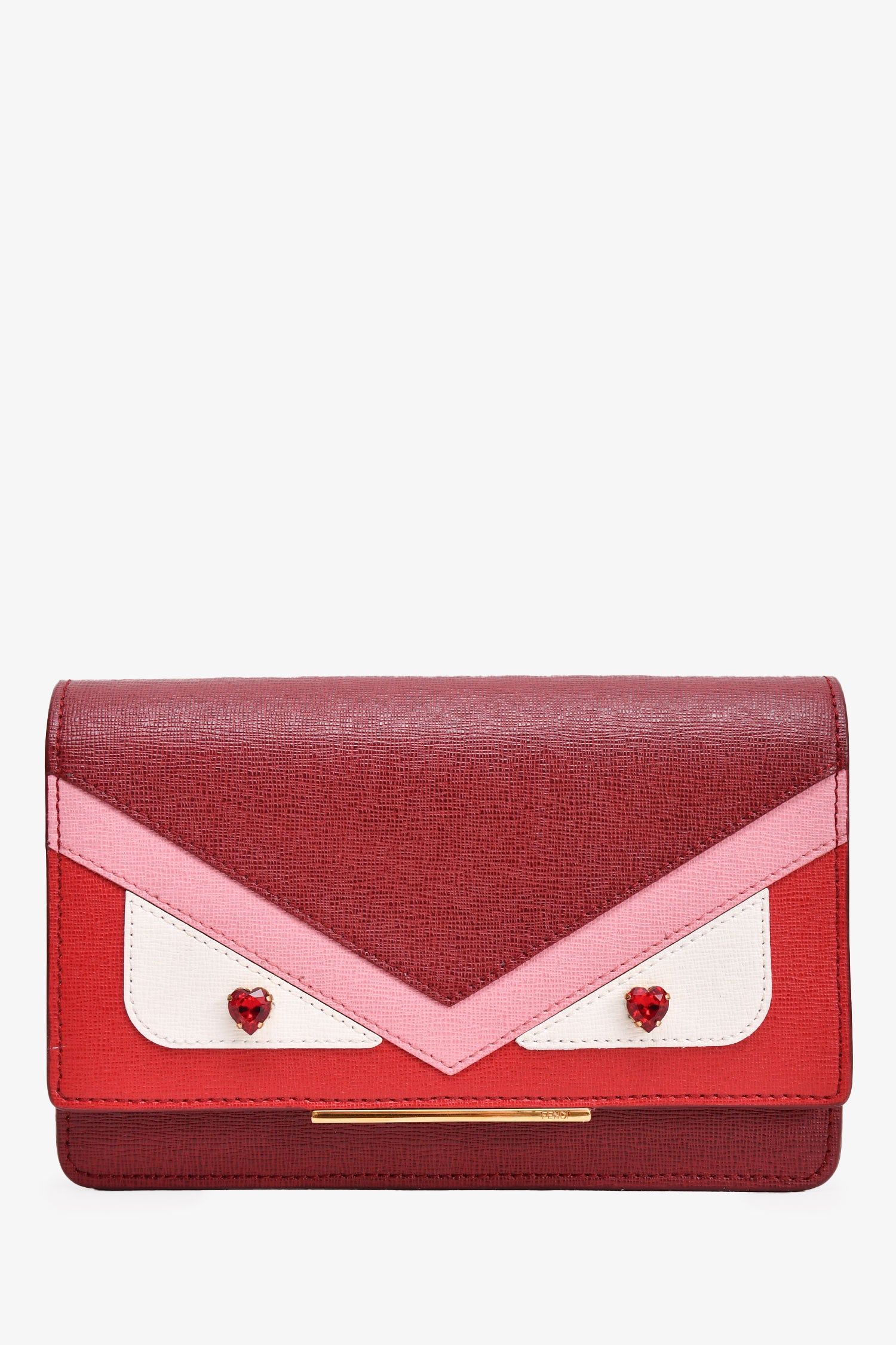 Refresh availabilityFendi Red/Pink Leather Monster Wallet On Chain Crossbody. Front fold-over flap with magnetic button closure. Front slip pocket. 6 card slots. 1 zippered compartment. Gold-tone hardware. Removable chain strap.