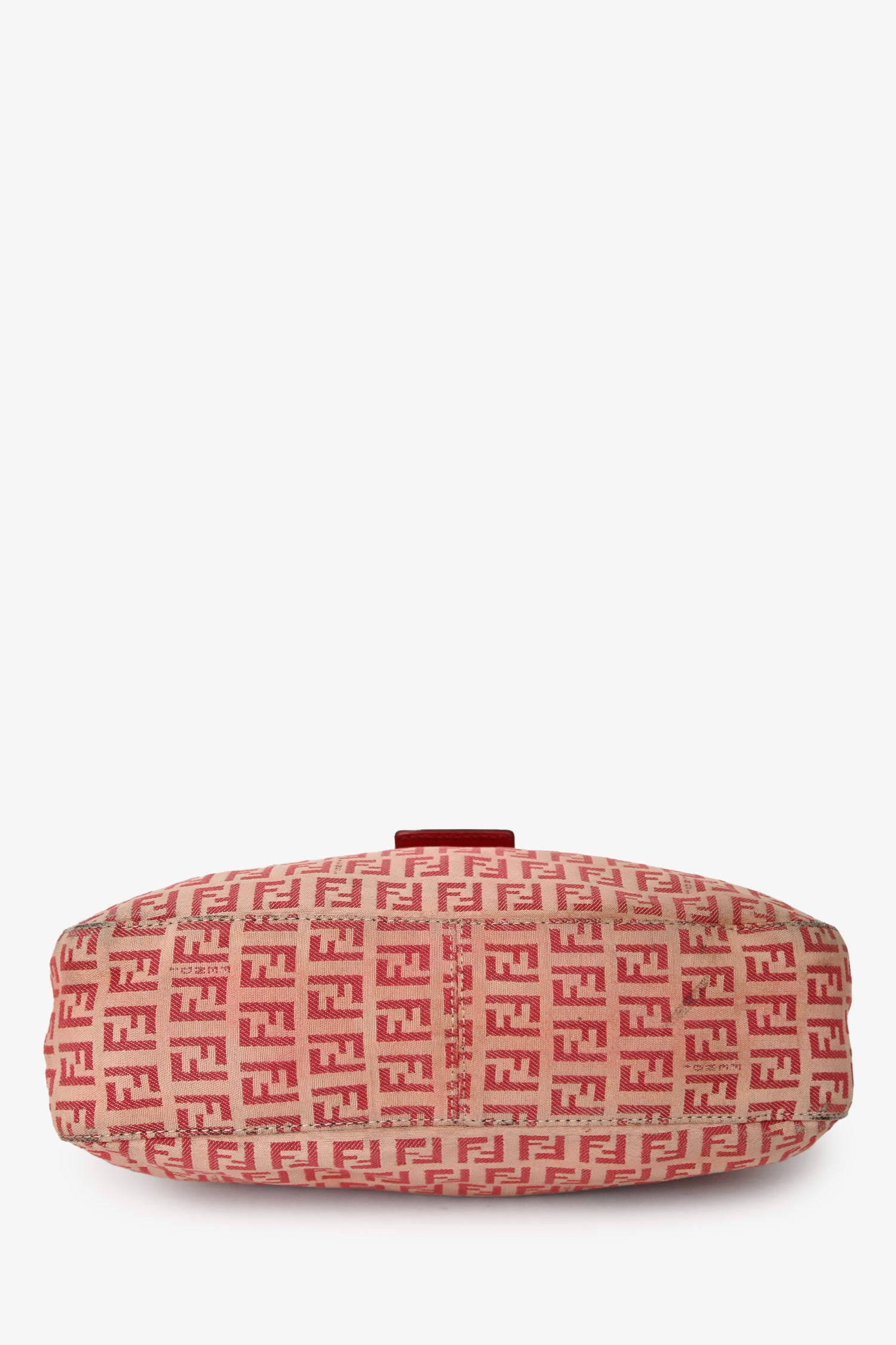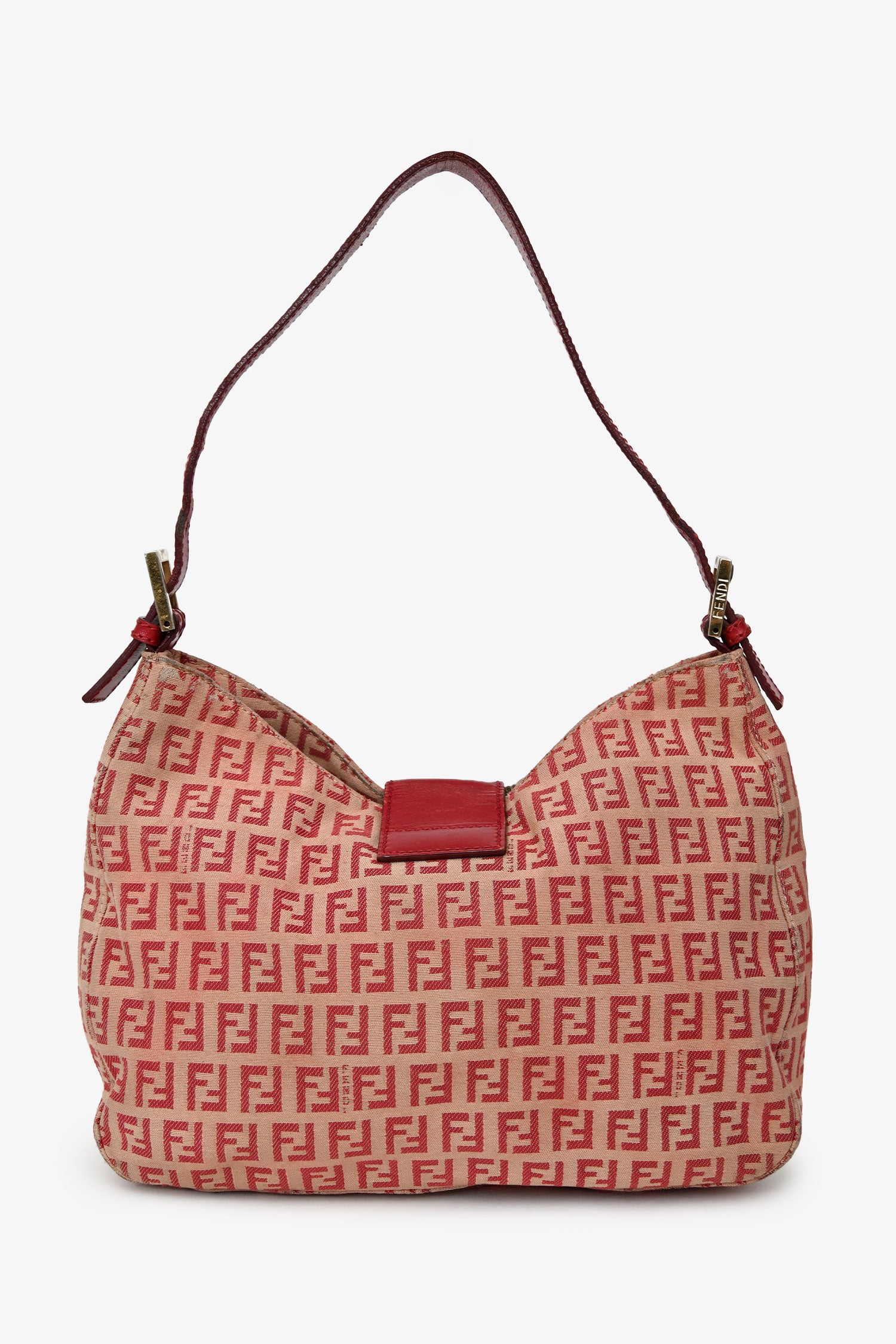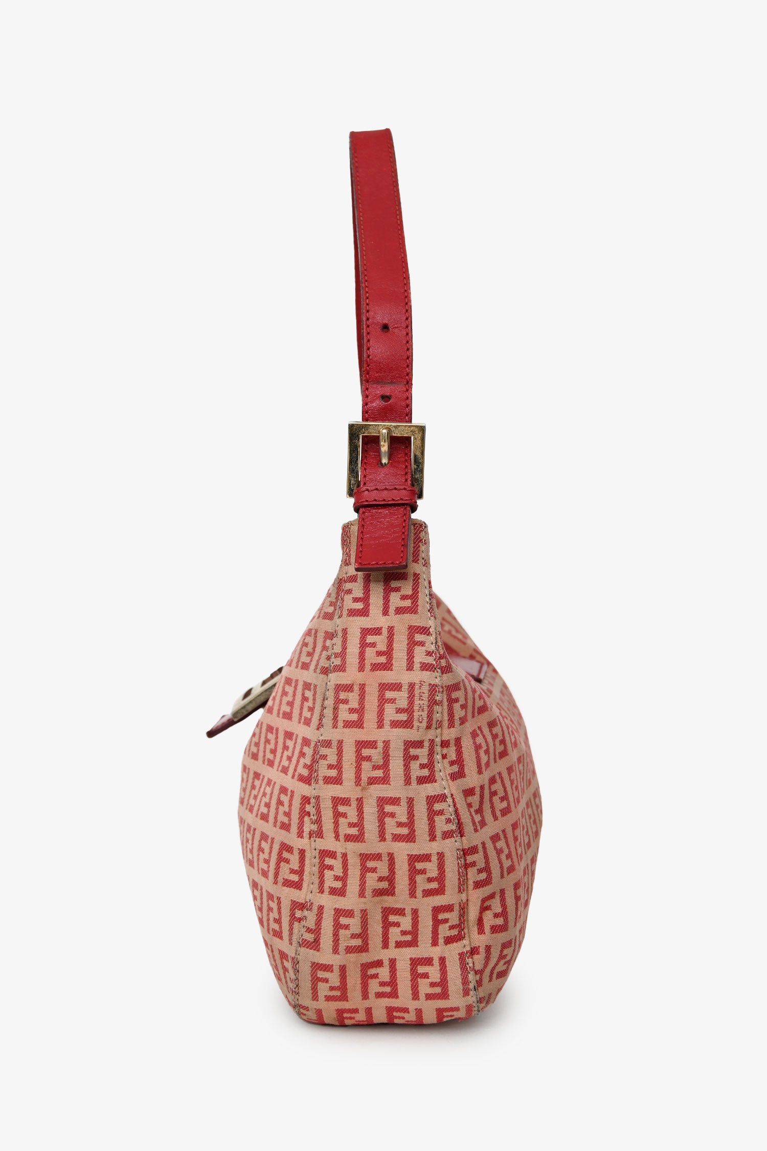 Refresh availabilityFendi Red/Beige FF Zucca Baguette Shoulder Bag. Fold-over strap with a snap closure. Adjustable shoulder strap. 3 interior compartments: 1 zip and 2 slip. Gold-tone hardware. Tonal stitching.