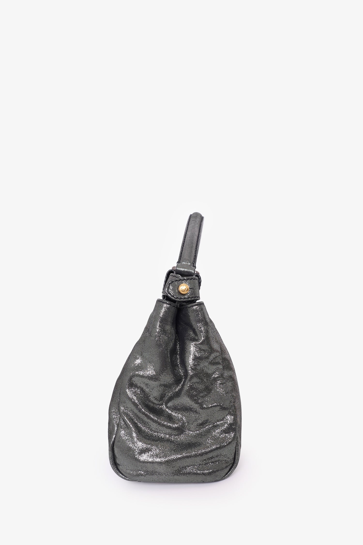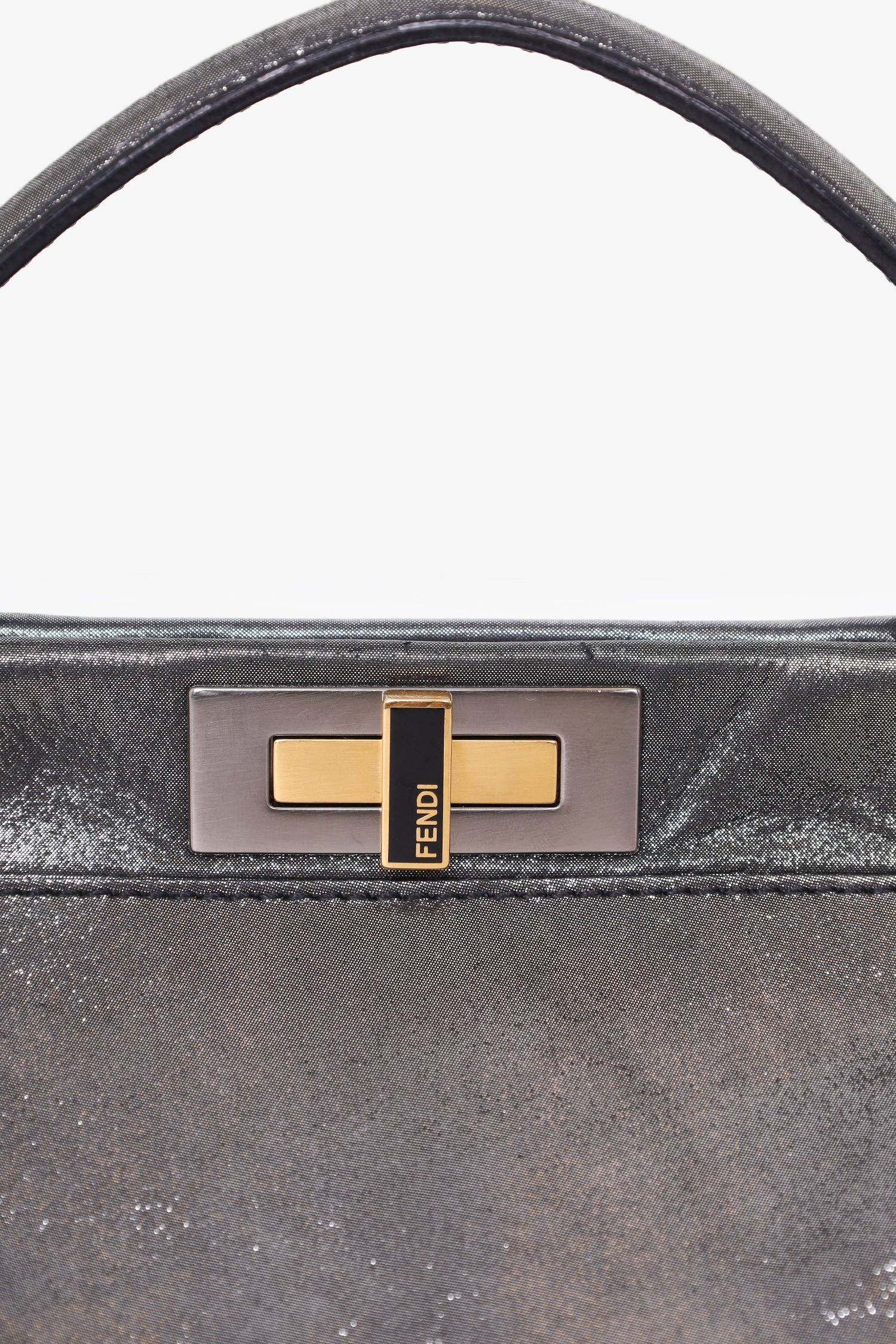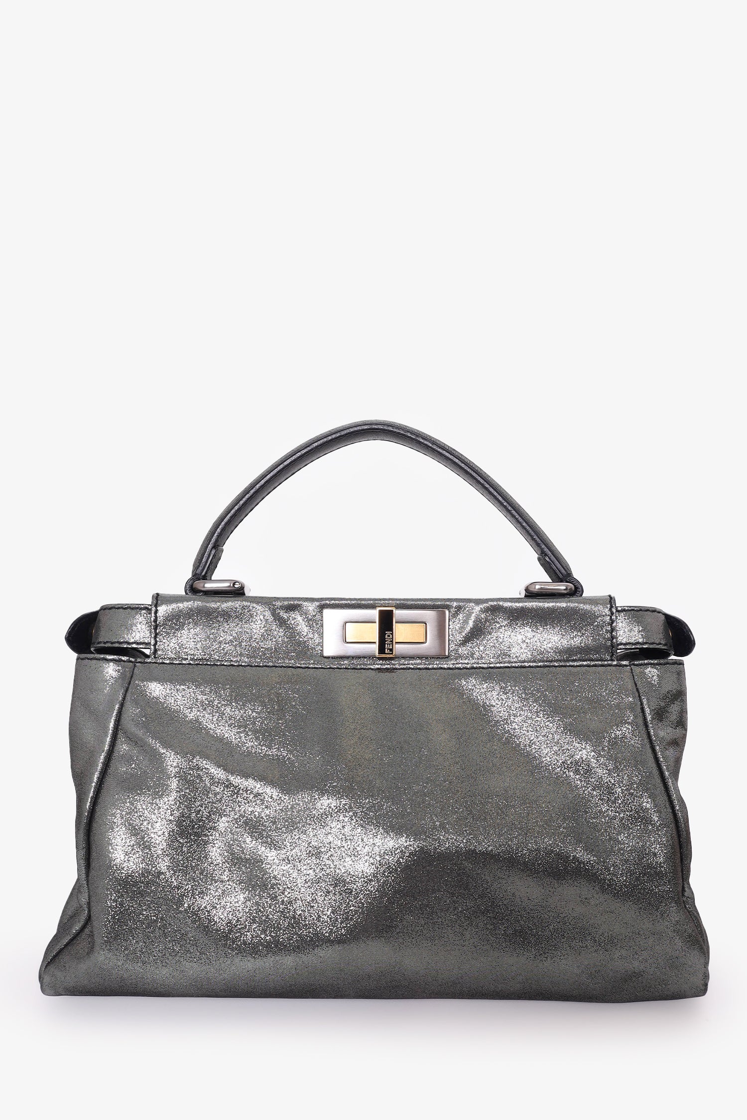 Refresh availabilityFendi Silver Metallic Medium Peekaboo Top Handle. Double side turn lock closure. 2 compartments. Interior wall pocket with zip closure. Protective studs on the bottom. Gold and silver-tone hardware. Tonal stitching.