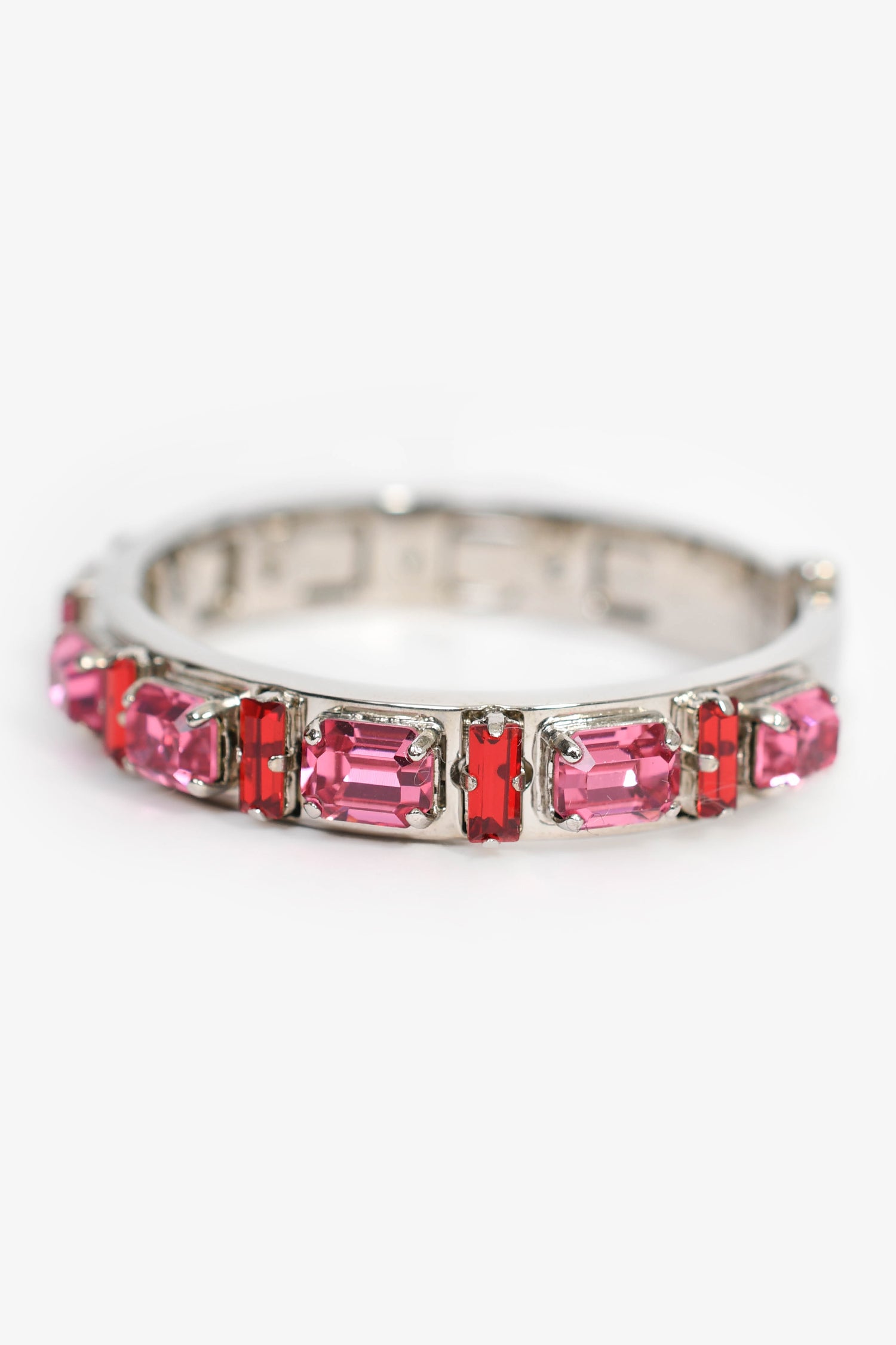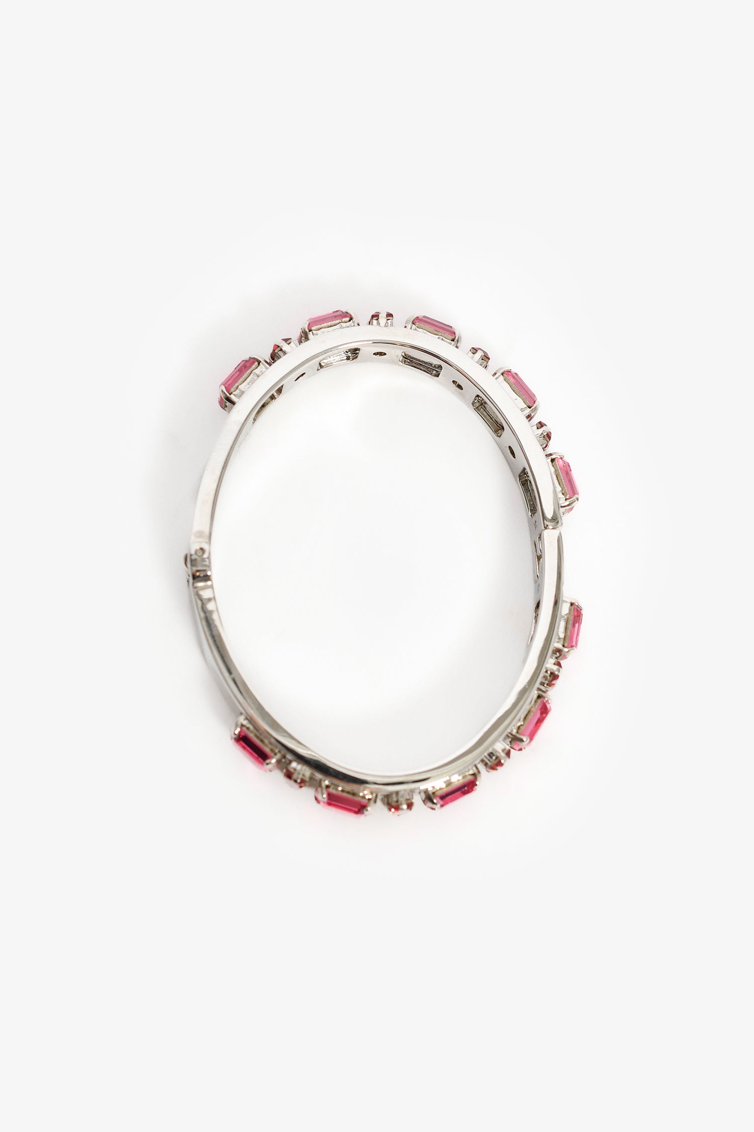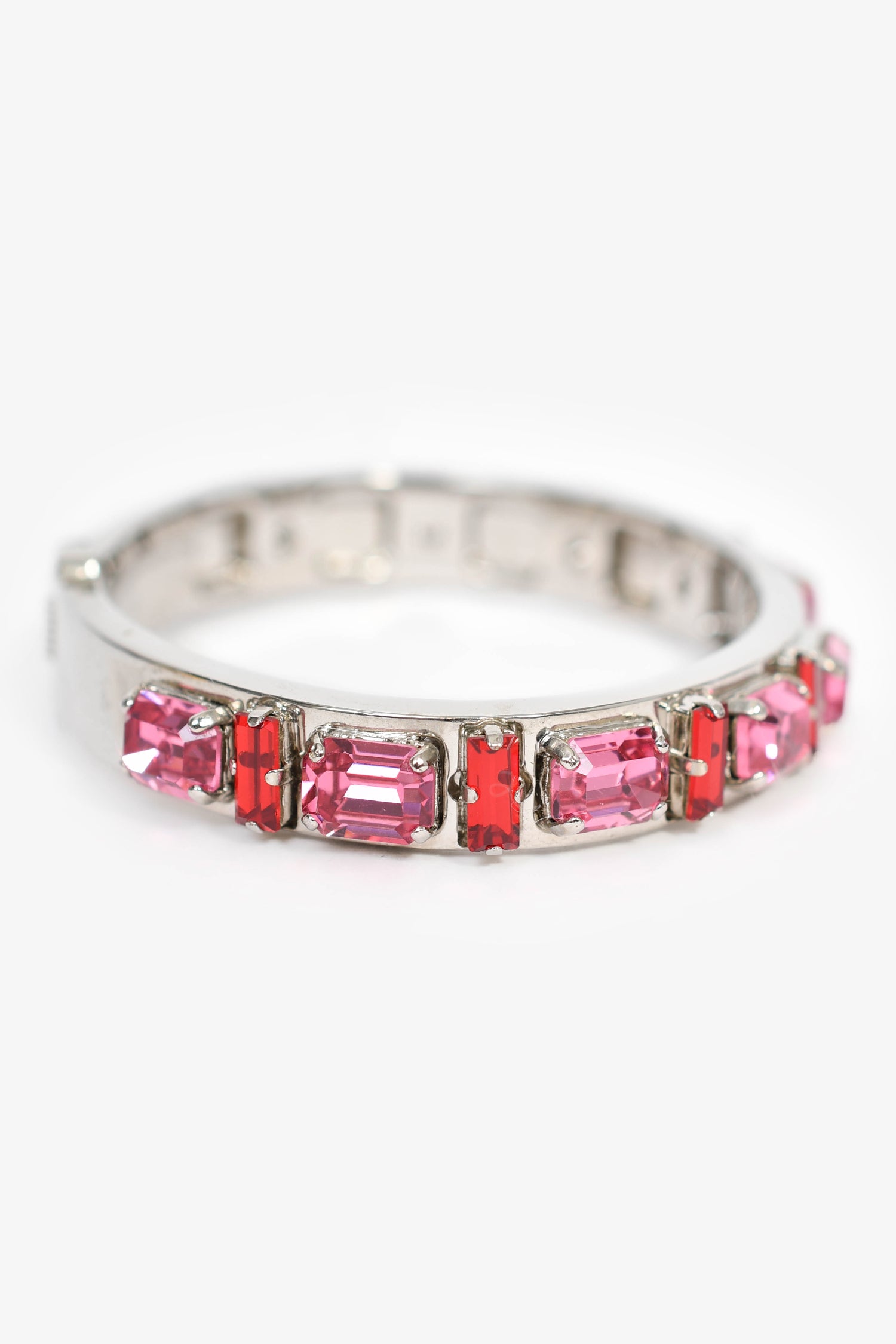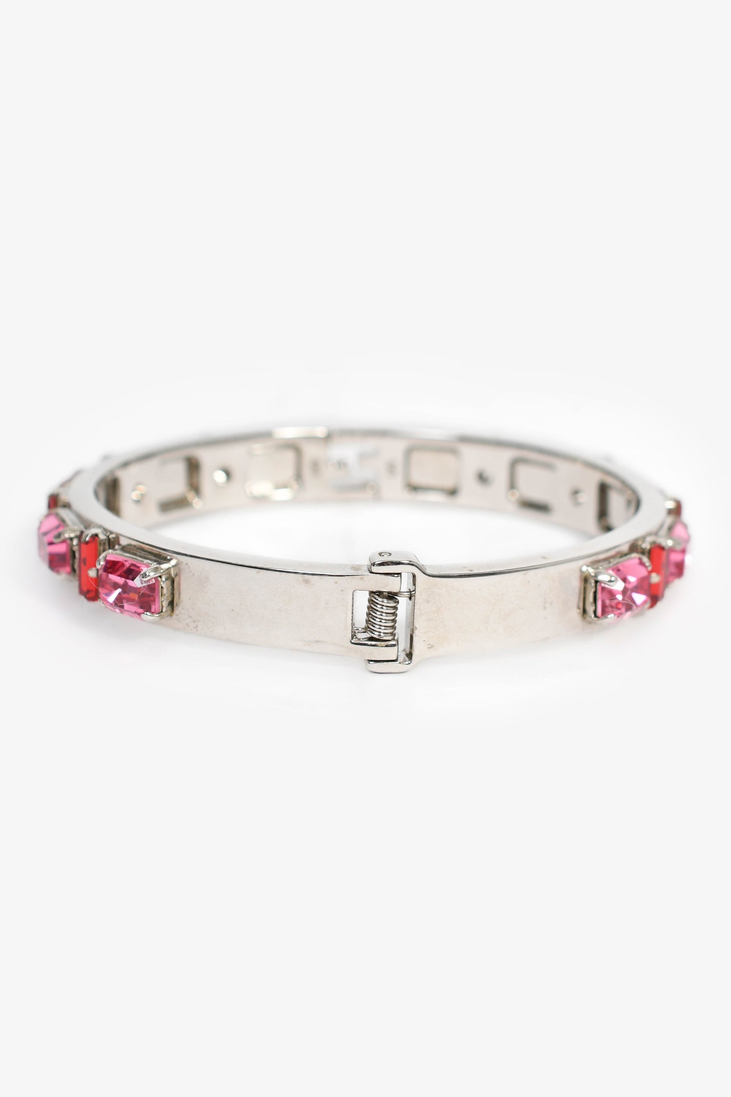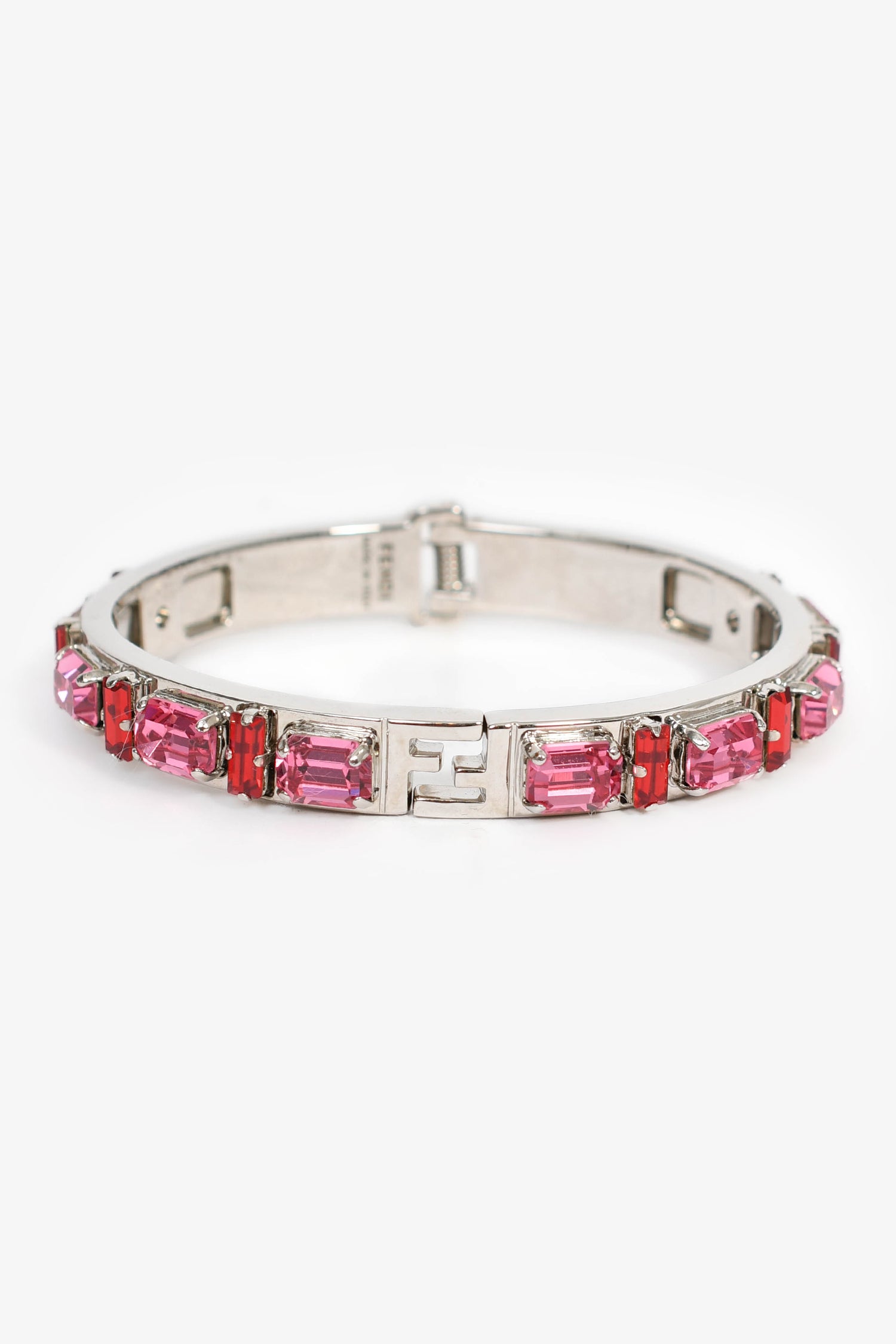 Refresh availabilityFendi Silver Toned Red/Pink Crystal Bracelet. Silver-tone hardware. Hinge opening. Pink-tone crystals.